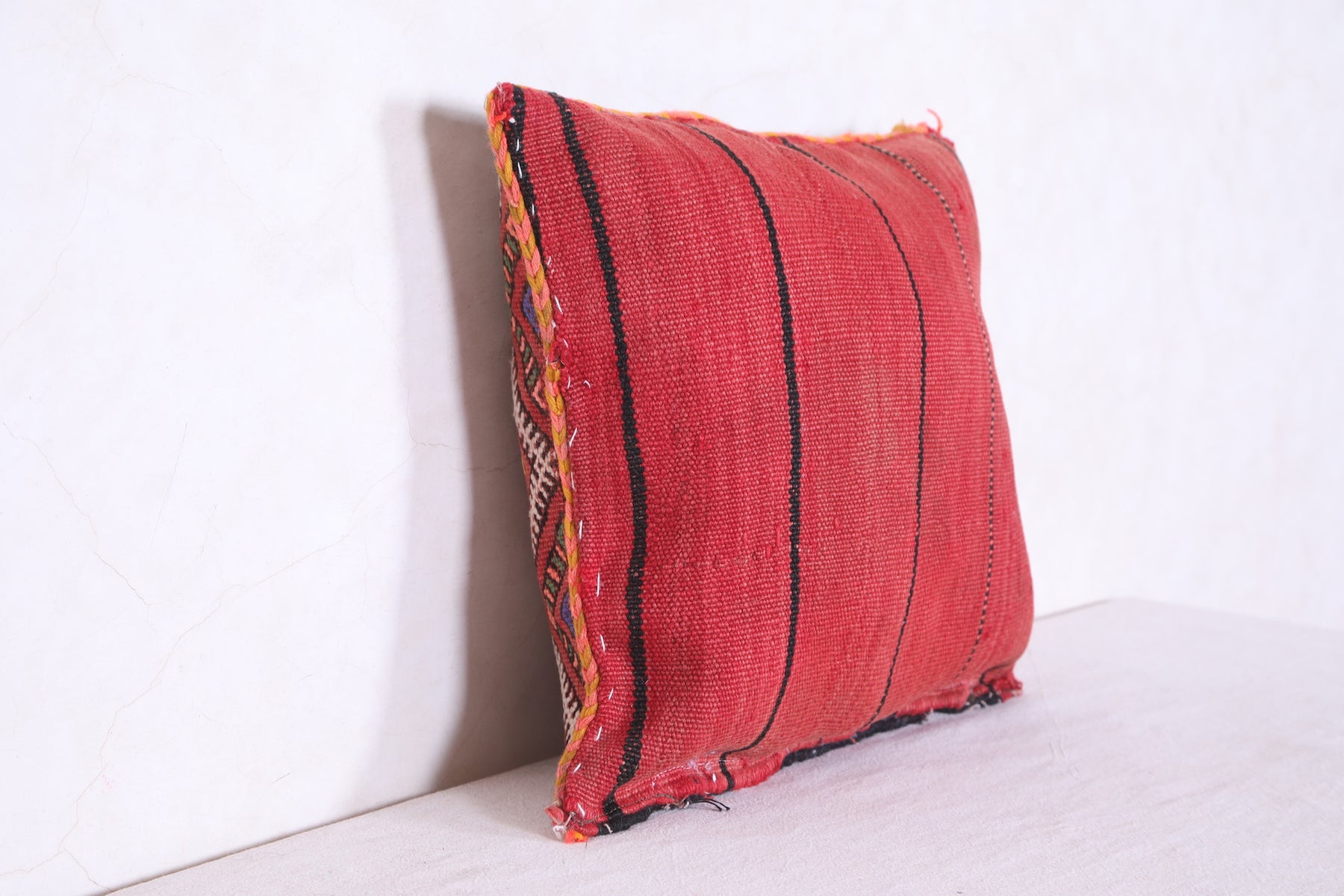This Moroccan kilim pillow is an amazing addition to any style of home. Its handmade with superior craftsmanship, featuring a unique, vibrant pattern printed on a soft cover that makes it a standout accent piece. Measuring 15.7 inches x 16.1 inches, it adds a stylishly comfortable touch to any decor.
