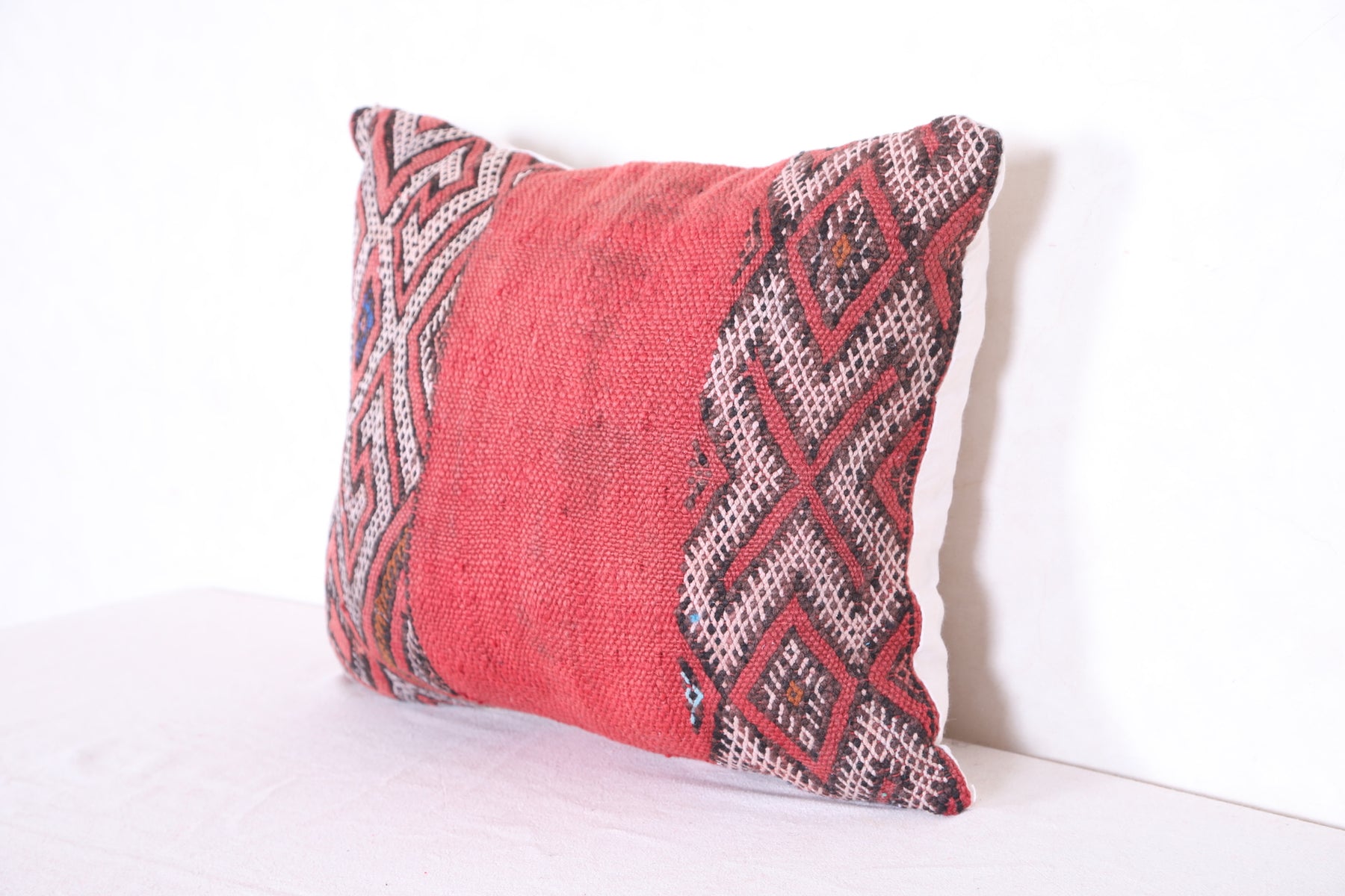 This 16.1" x 19.2" Moroccan kilim pillow is handmade with the utmost care, adding a distinguished and globally inspired element to your home or office. The kilim cover is crafted from wool, providing a soft yet durable finish.