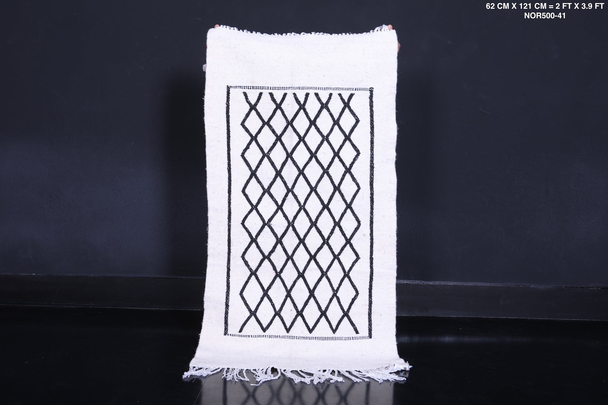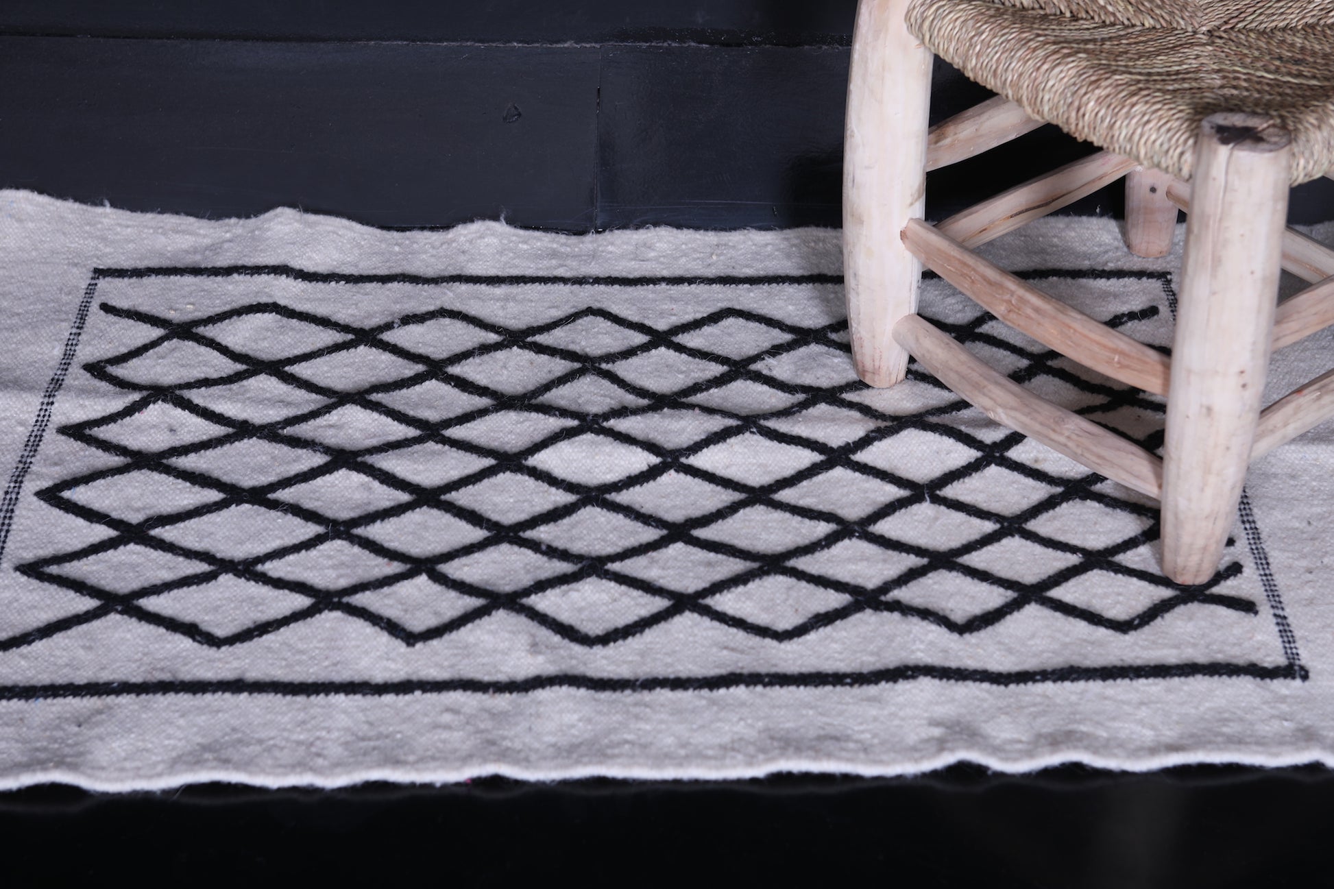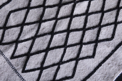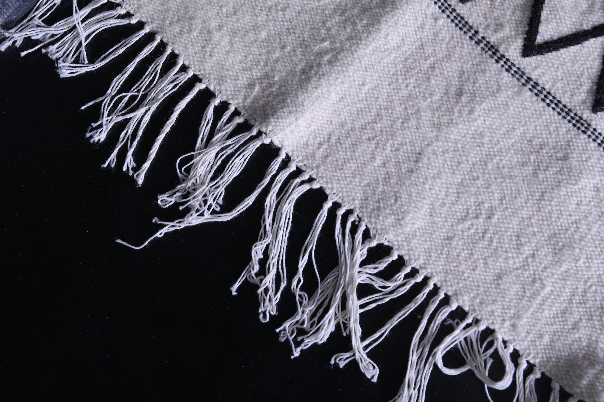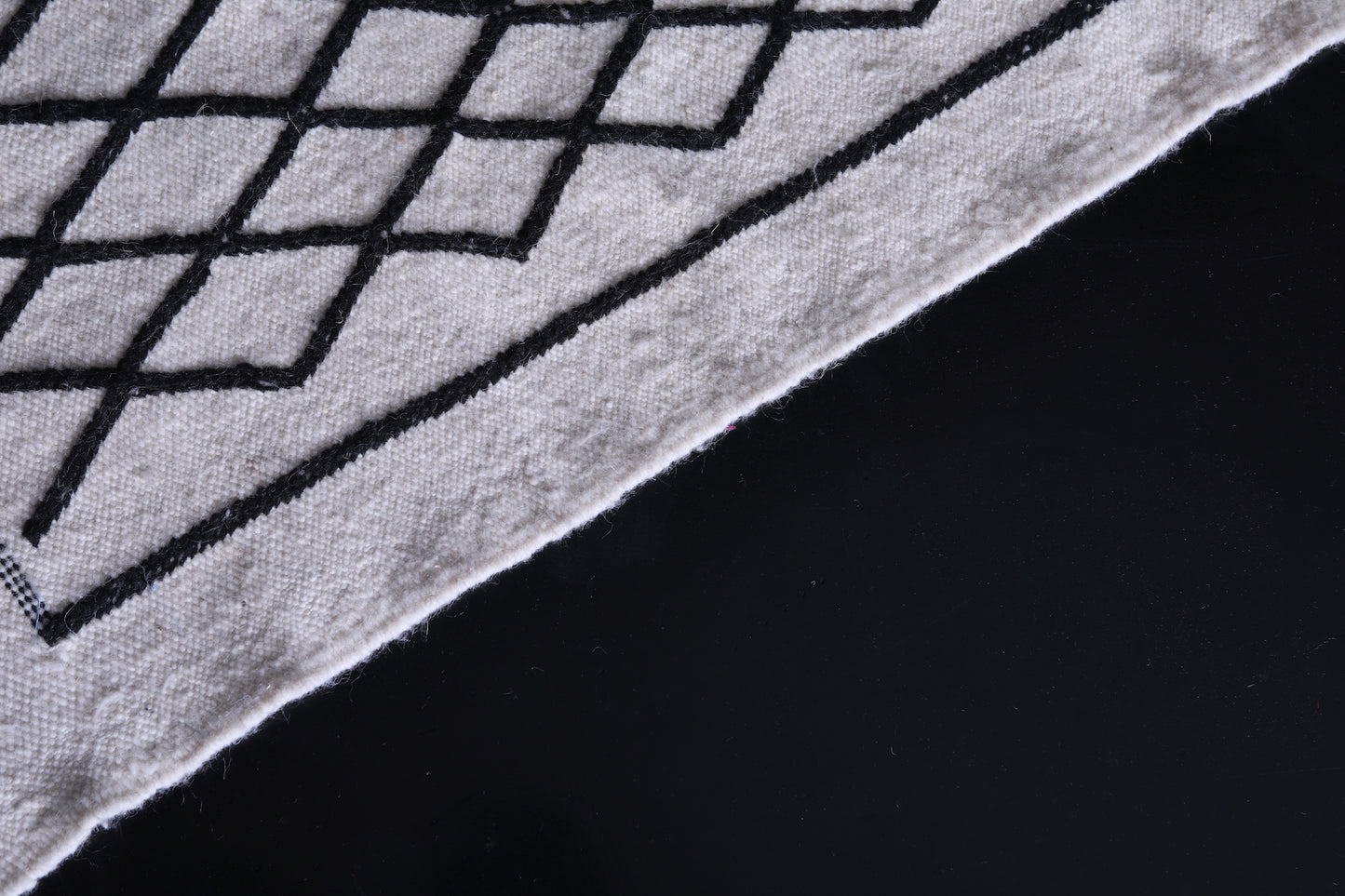 This 2 x 3.9 feet Moroccan Handwoven Kilim features a sophisticated geometric diamond pattern on a minimalist black-and-white base, blending traditional craftsmanship with modern elegance. Handwoven from premium wool, it offers exceptional durability and softness, making it ideal as an accent rug, wall hanging, or layered with larger carpets.