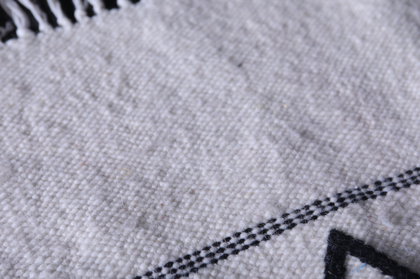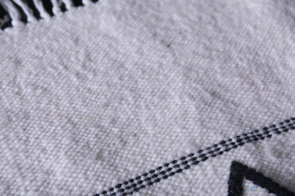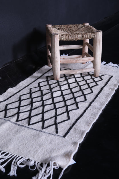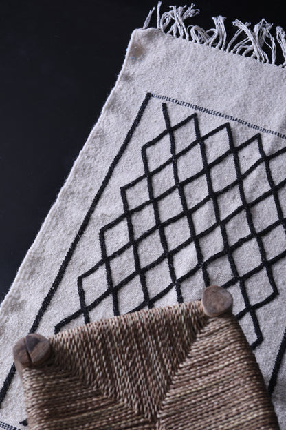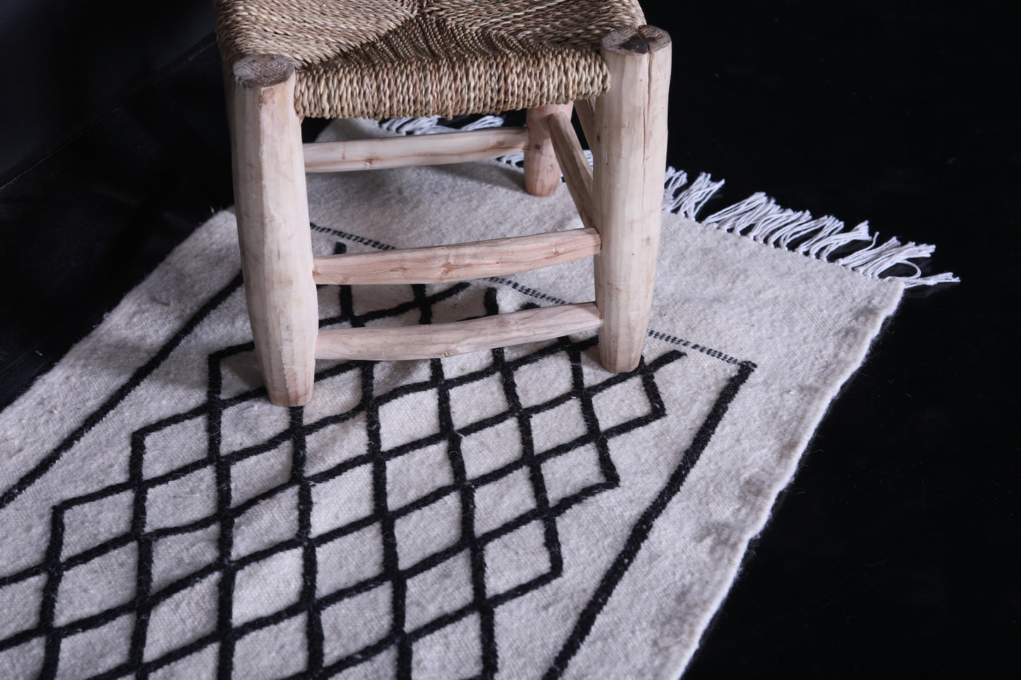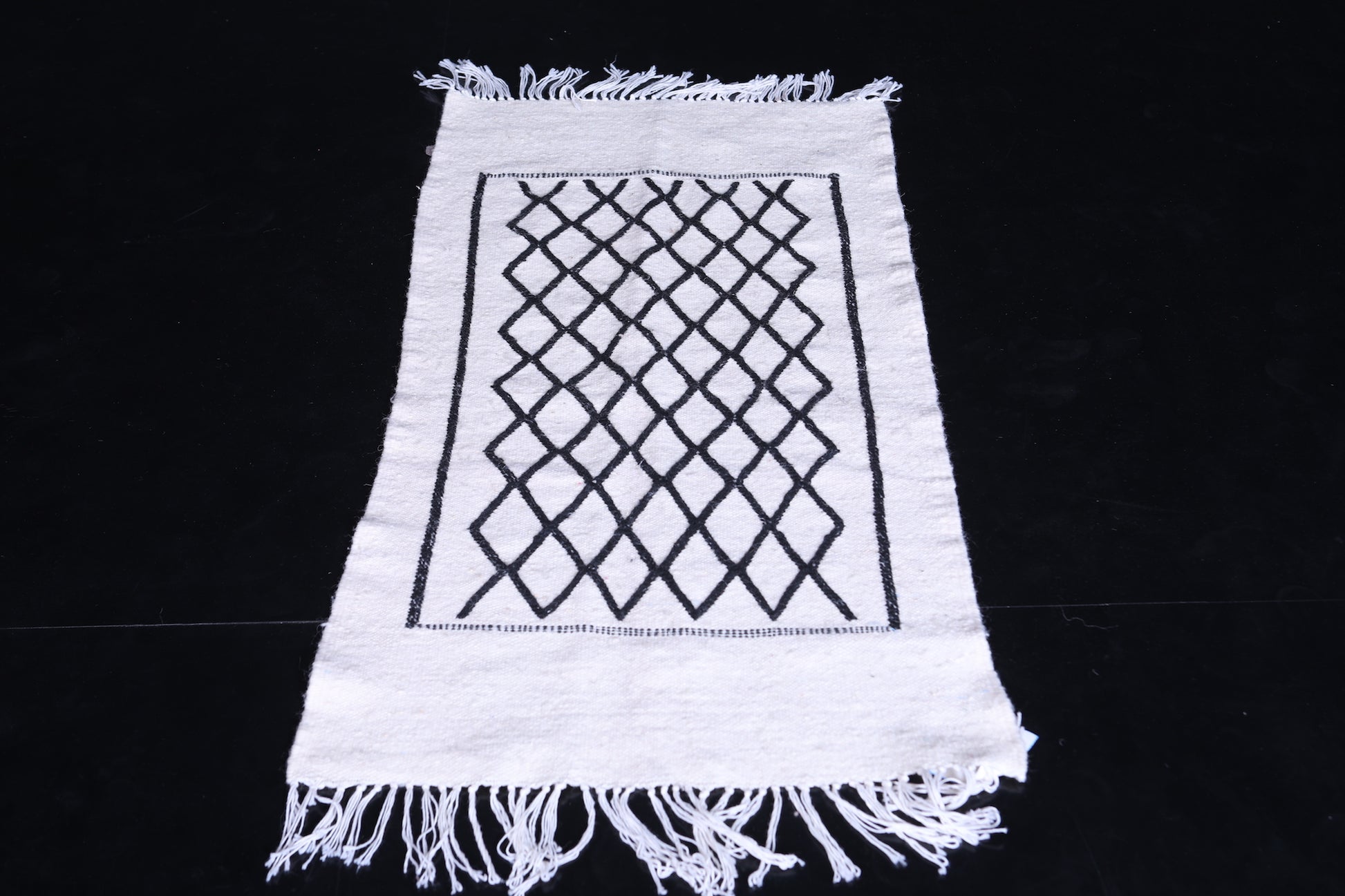 This 2 x 3.9 feet Moroccan Handwoven Kilim features a sophisticated geometric diamond pattern on a minimalist black-and-white base, blending traditional craftsmanship with modern elegance. Handwoven from premium wool, it offers exceptional durability and softness, making it ideal as an accent rug, wall hanging, or layered with larger carpets.