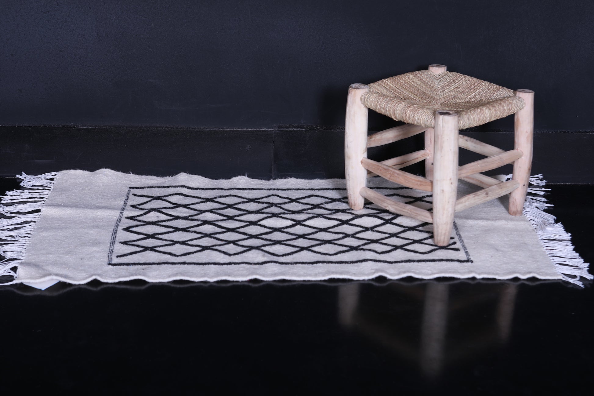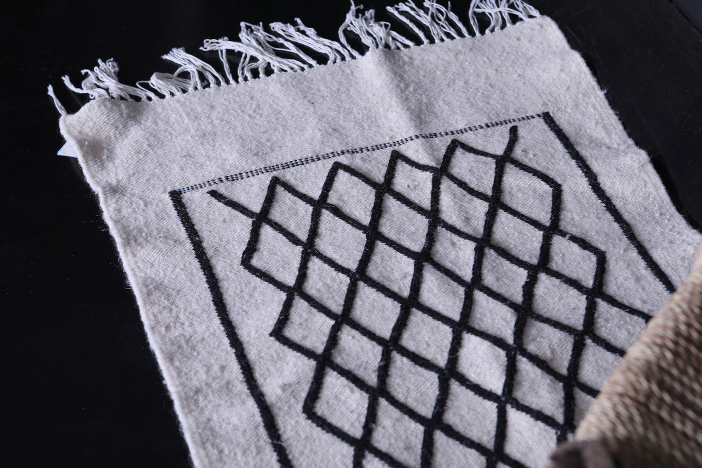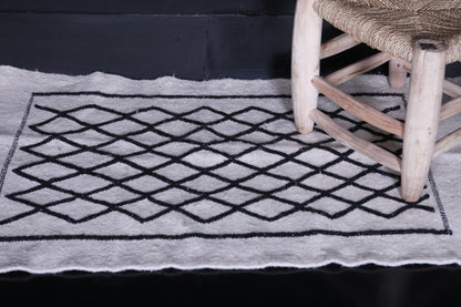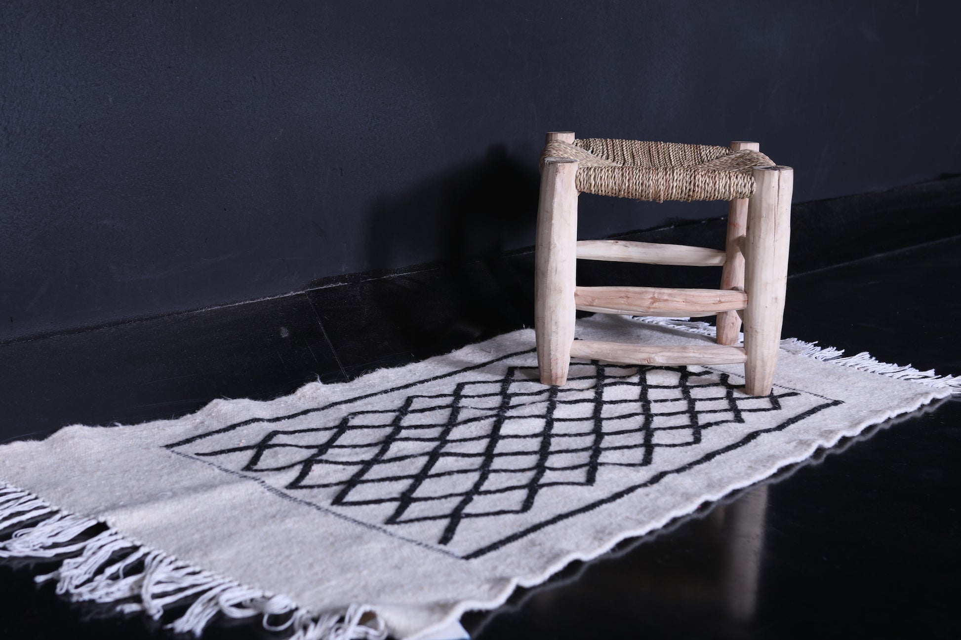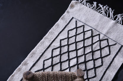 This 2 x 3.9 feet Moroccan Handwoven Kilim features a sophisticated geometric diamond pattern on a minimalist black-and-white base, blending traditional craftsmanship with modern elegance. Handwoven from premium wool, it offers exceptional durability and softness, making it ideal as an accent rug, wall hanging, or layered with larger carpets.