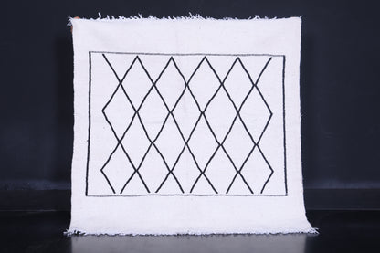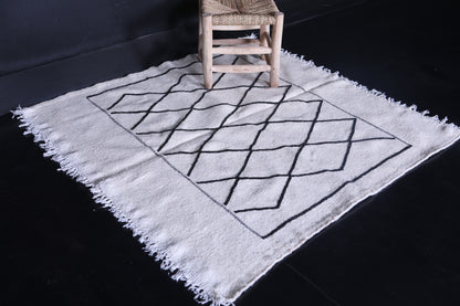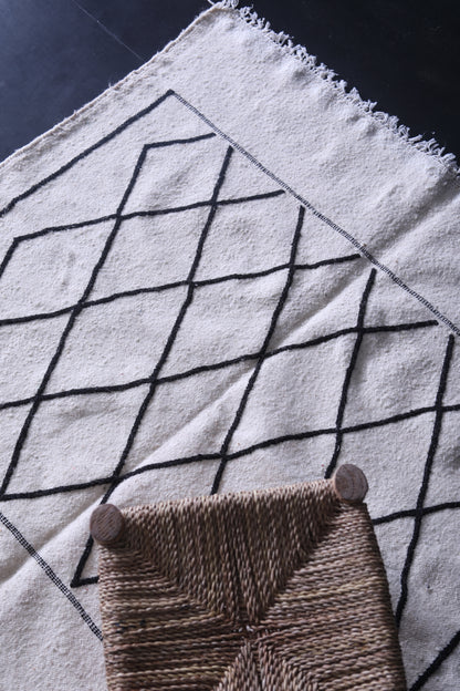 This 3.9 x 4 feet Vintage Moroccan Handwoven Kilim features a traditional black diamond pattern on a neutral cream background, blending classic craftsmanship with minimalist elegance. Handwoven from premium wool, it offers exceptional durability and softness, making it ideal for living rooms, bedrooms, or entryways.