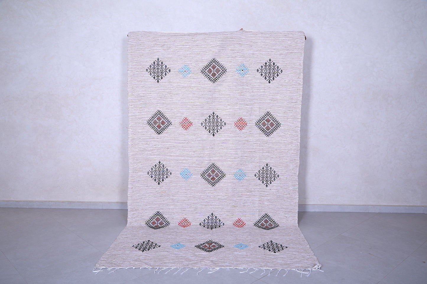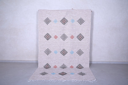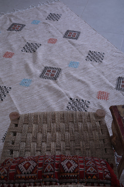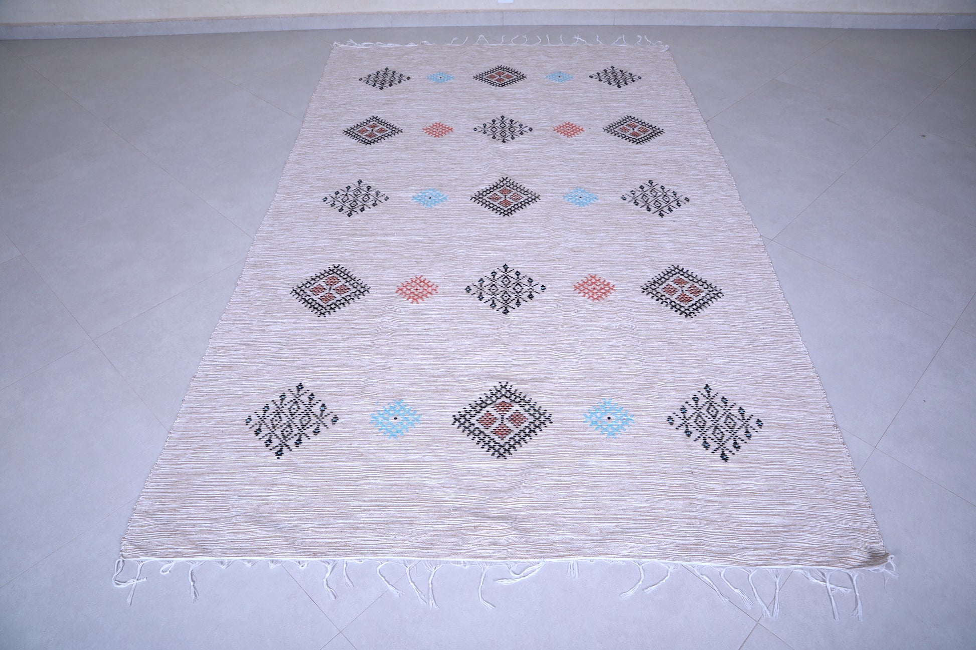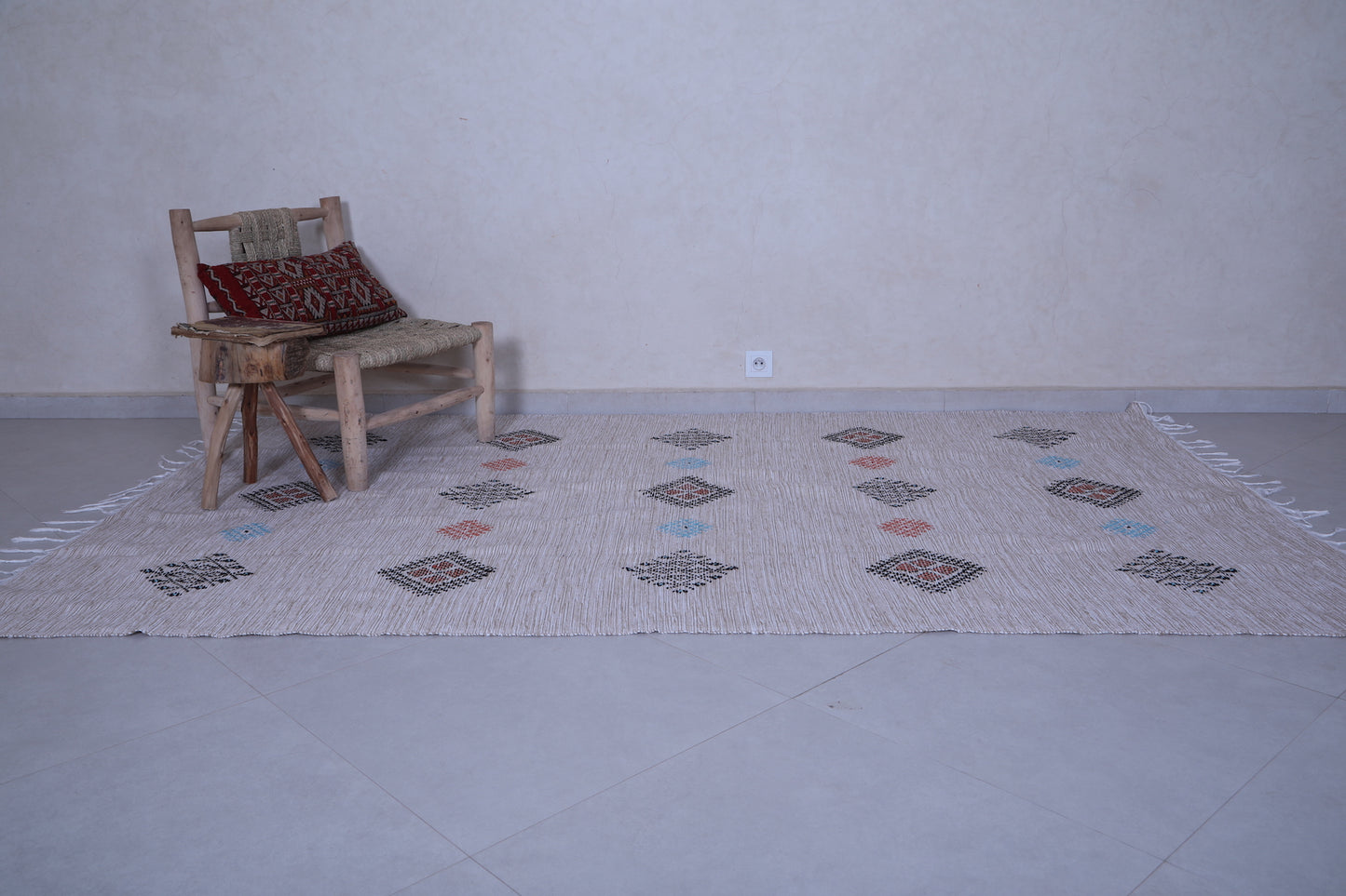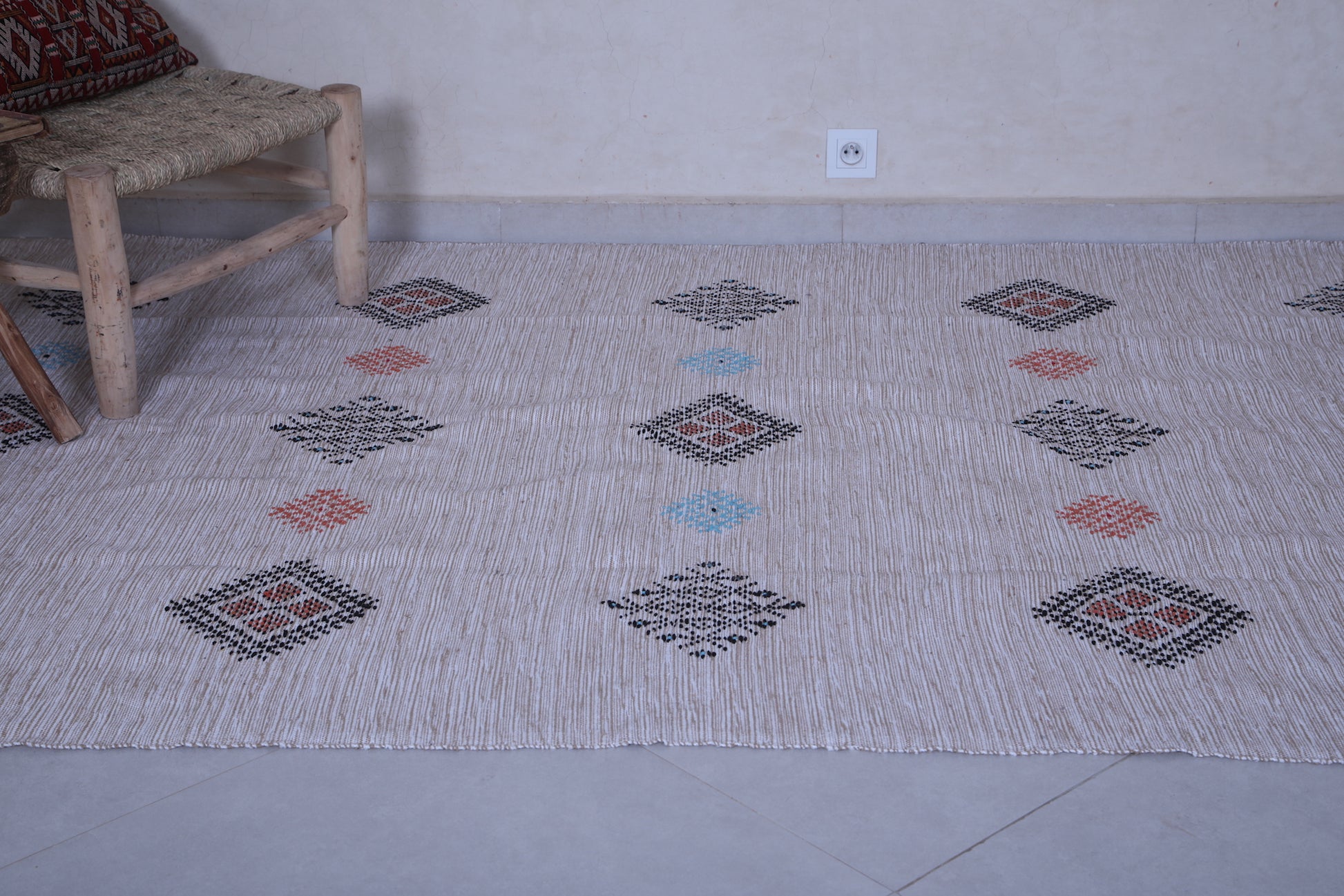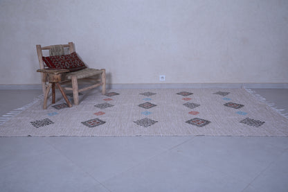 This 5.5 x 9.1 feet Moroccan Handwoven Kilim features a charming and colorful diamond pattern on a neutral base, blending traditional Moroccan craftsmanship with modern aesthetics. Handwoven from premium wool, it offers exceptional durability and softness, making it ideal for living rooms, dining areas, or bedrooms.