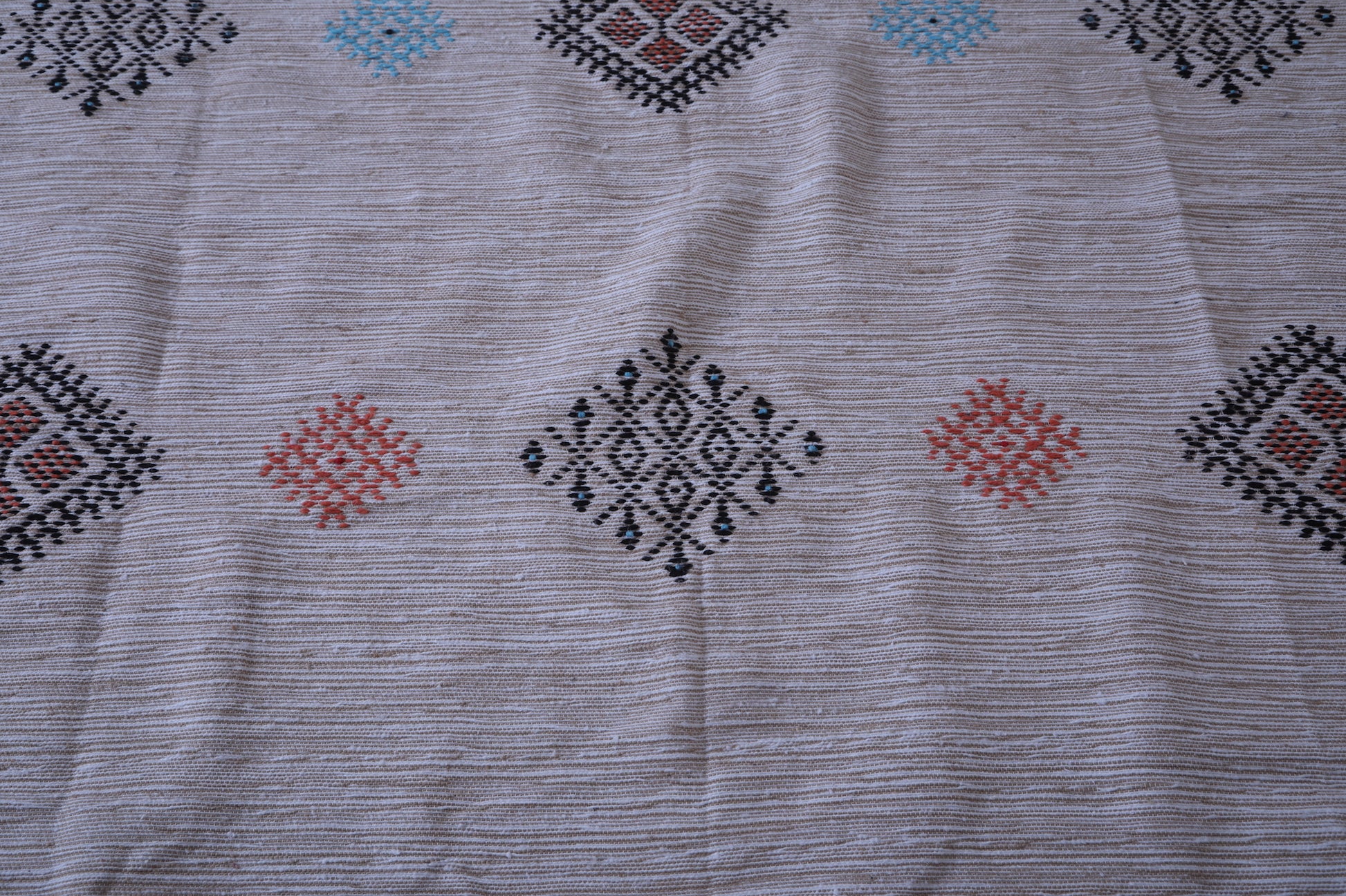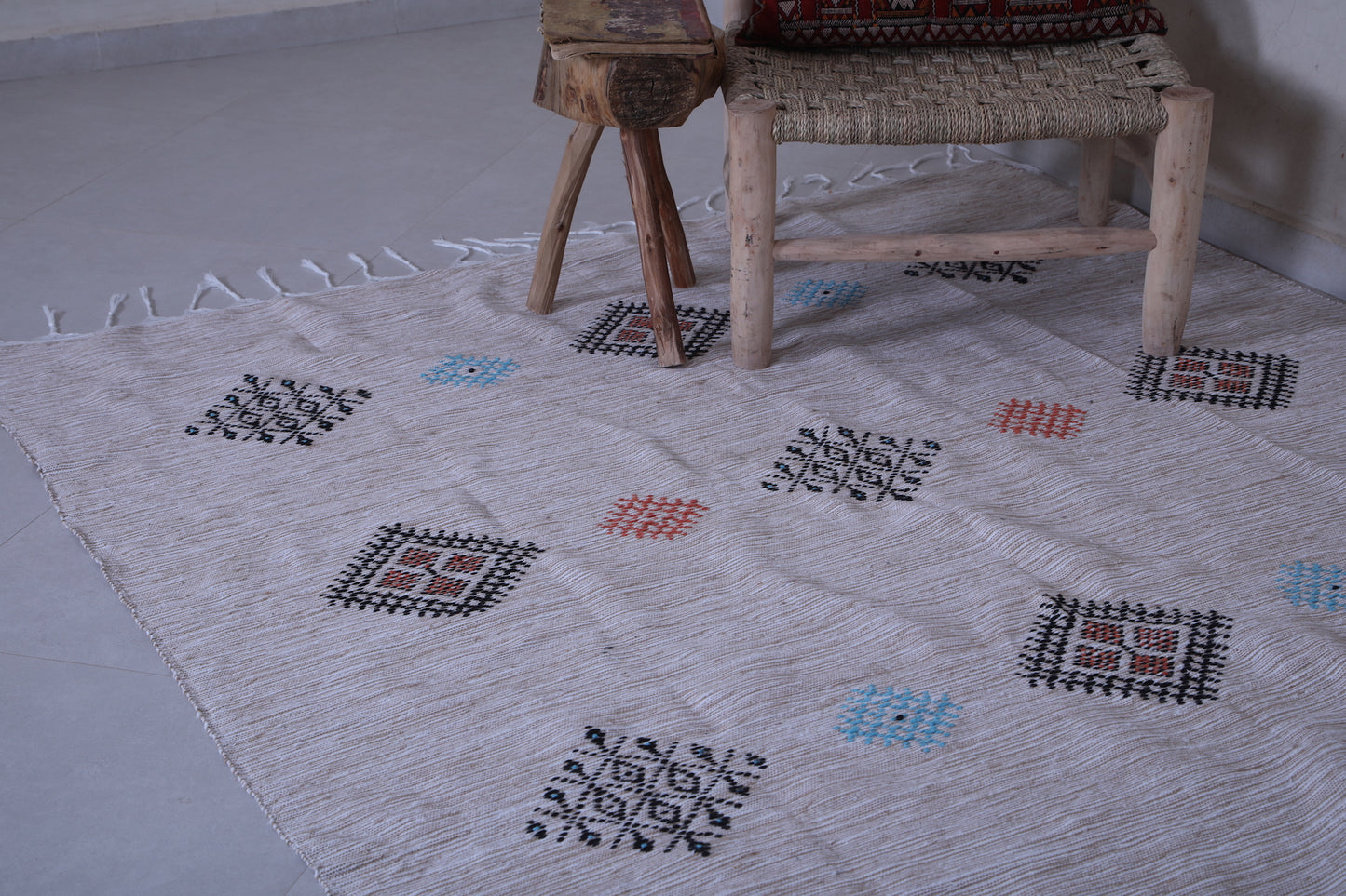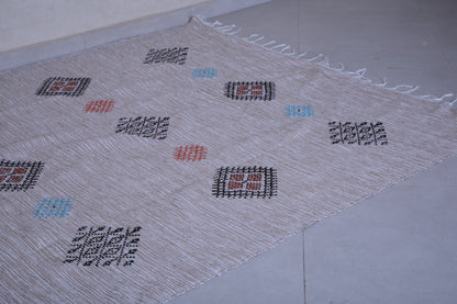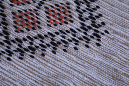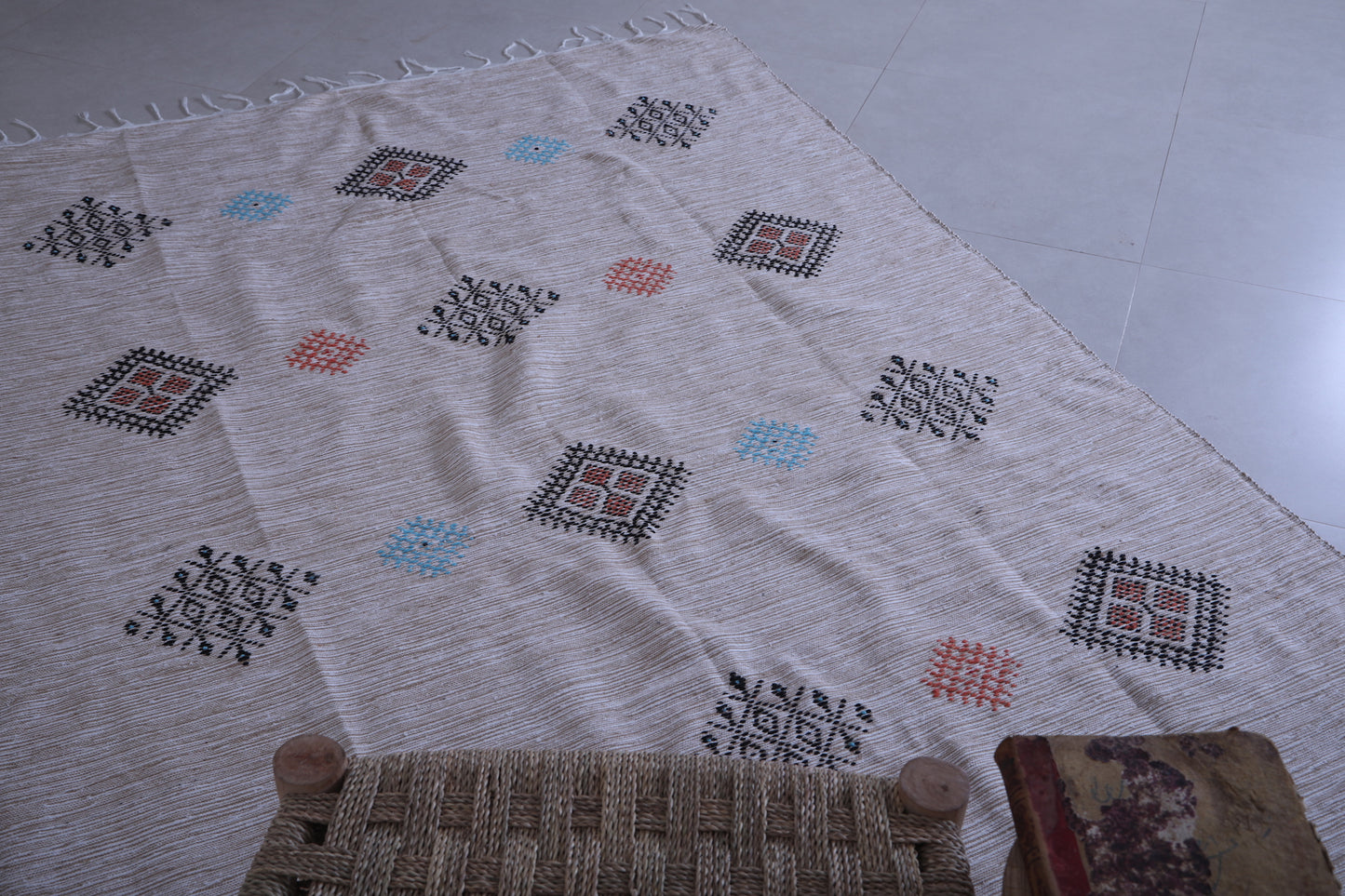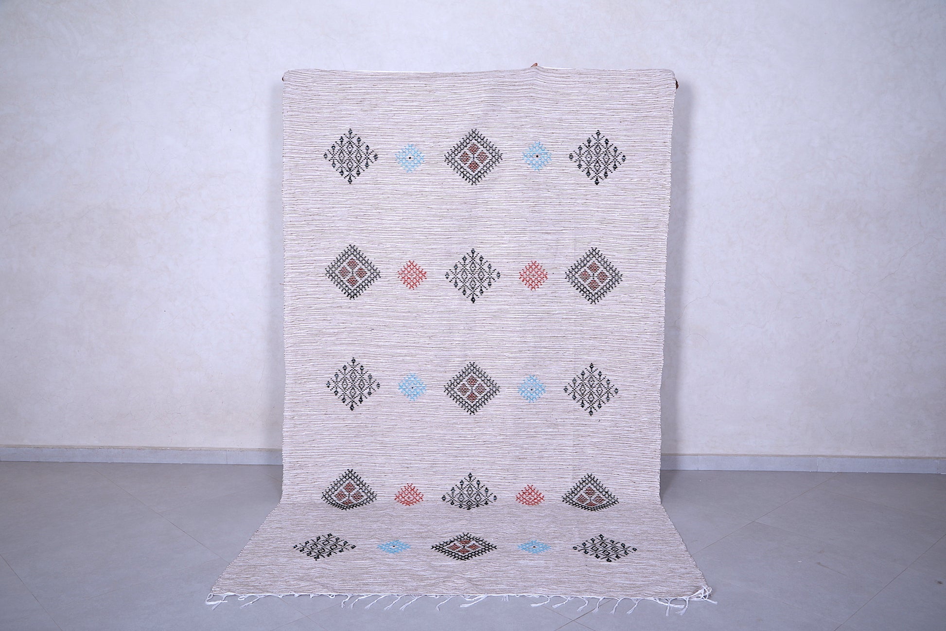 This 5.5 x 9.1 feet Moroccan Handwoven Kilim features a charming and colorful diamond pattern on a neutral base, blending traditional Moroccan craftsmanship with modern aesthetics. Handwoven from premium wool, it offers exceptional durability and softness, making it ideal for living rooms, dining areas, or bedrooms.