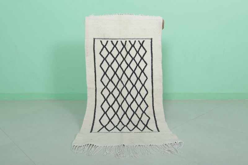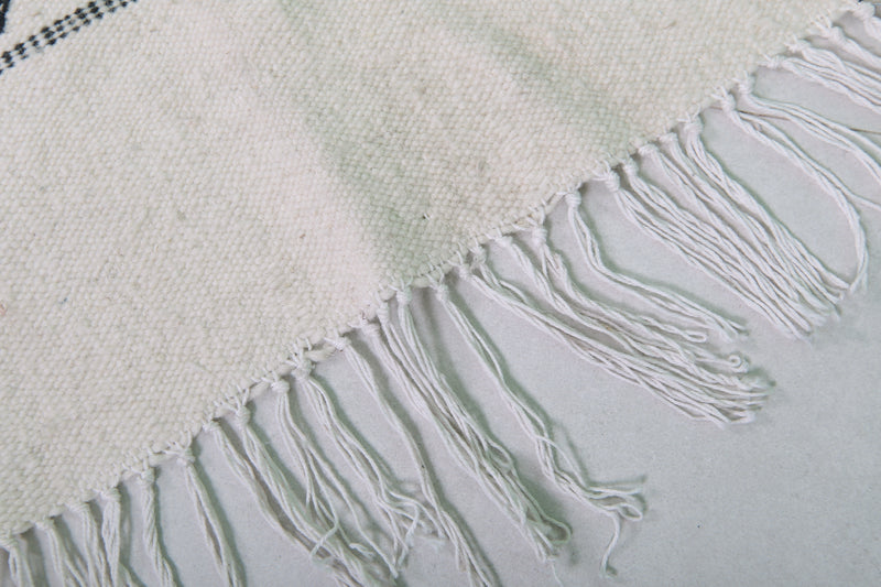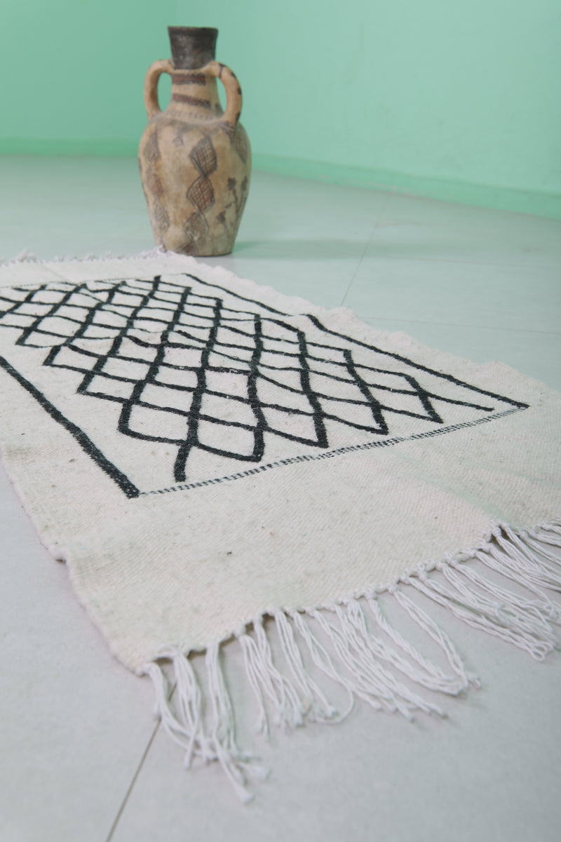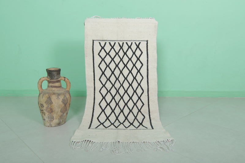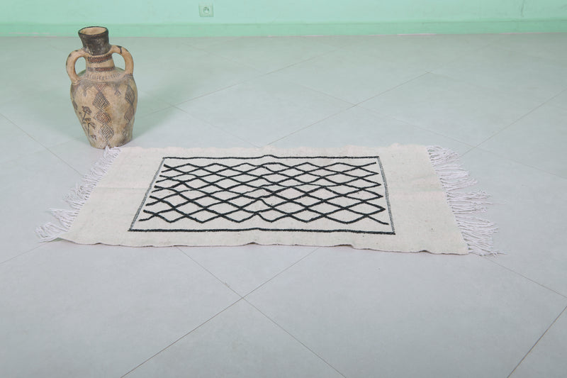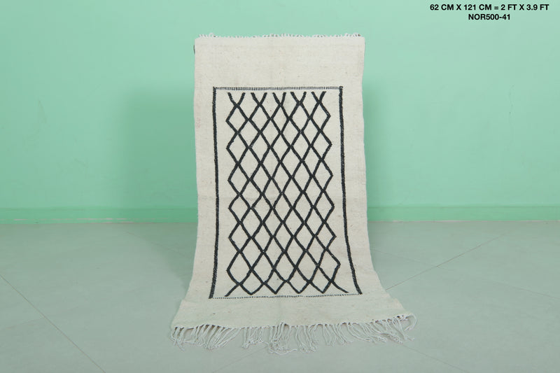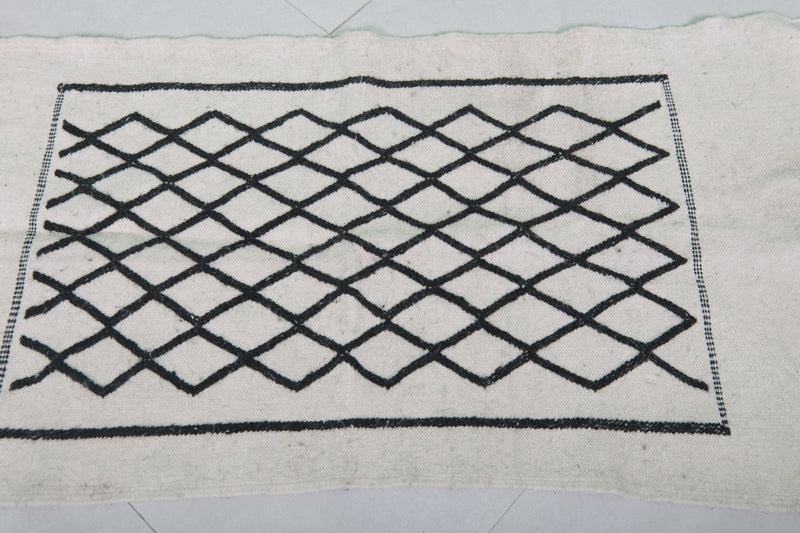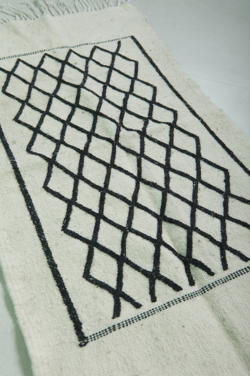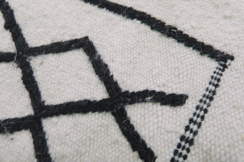 This 2 x 3.9 feet Moroccan Handwoven Kilim features a sophisticated geometric diamond pattern on a minimalist black-and-white base, blending traditional craftsmanship with modern elegance. Handwoven from premium wool, it offers exceptional durability and softness, making it ideal as an accent rug, wall hanging, or layered with larger carpets.