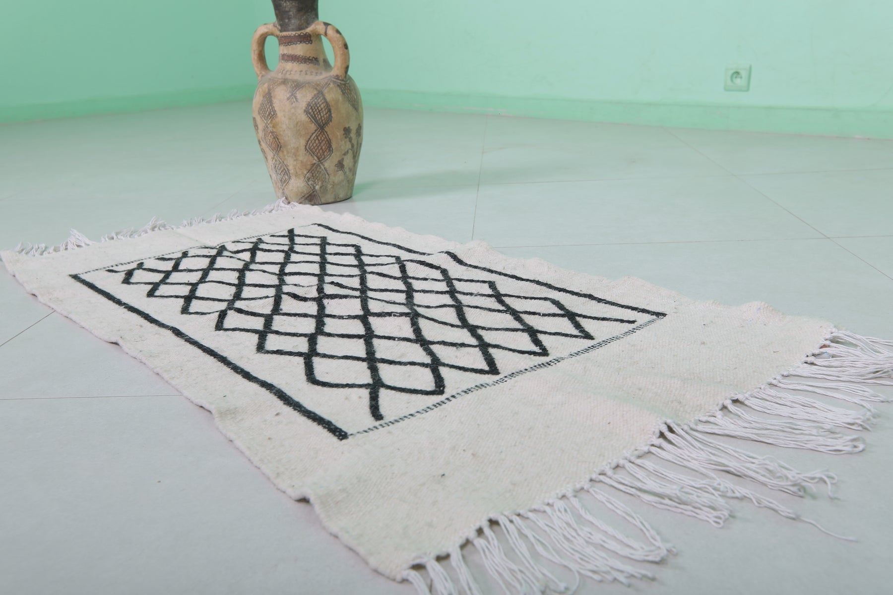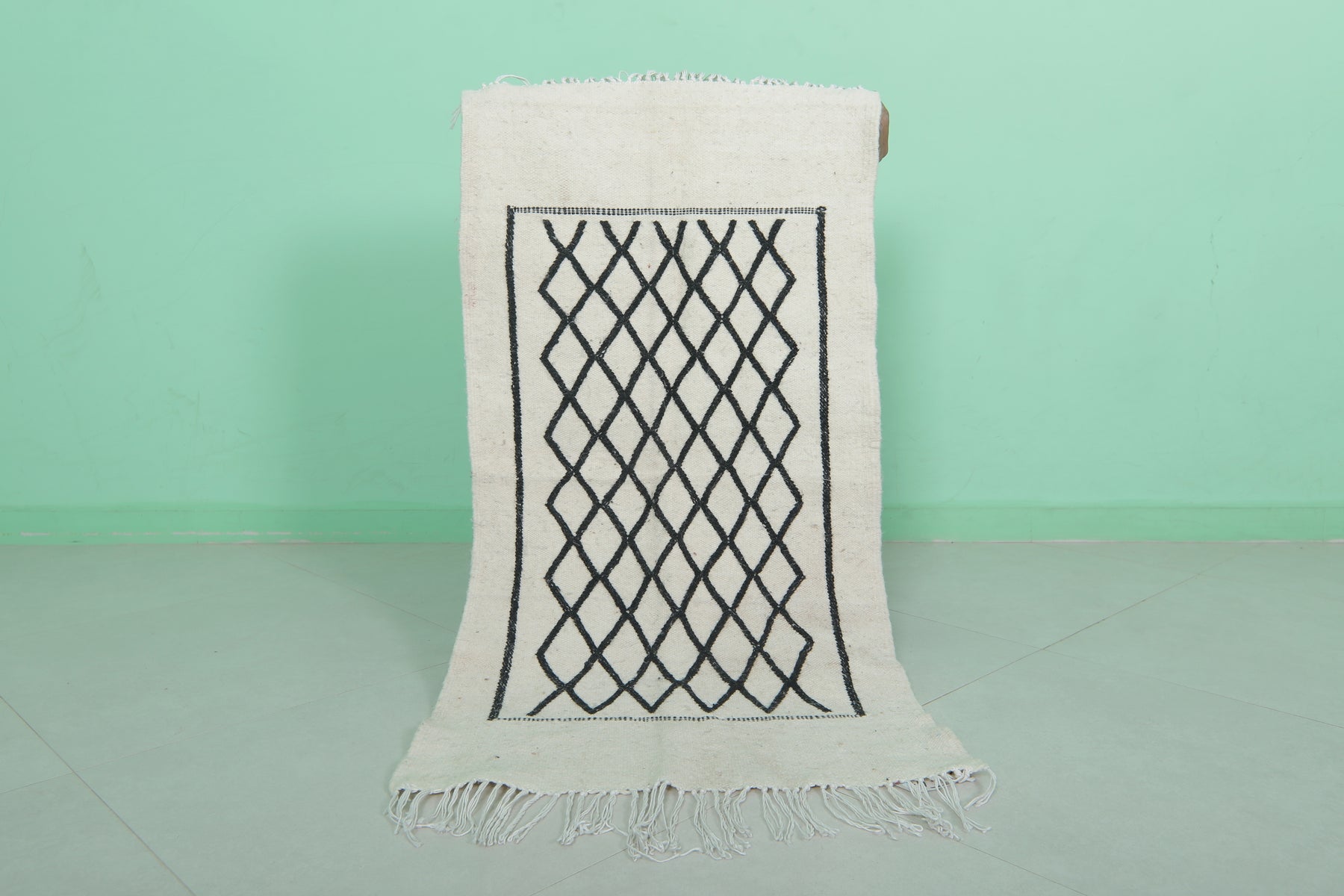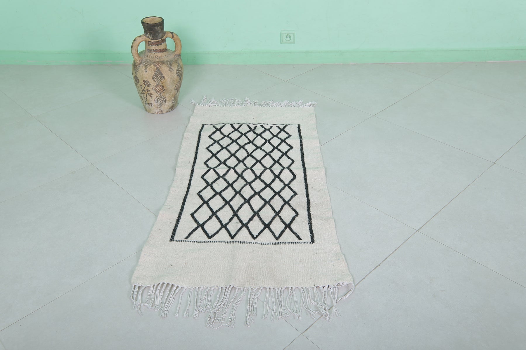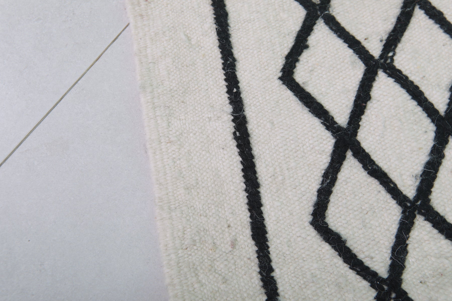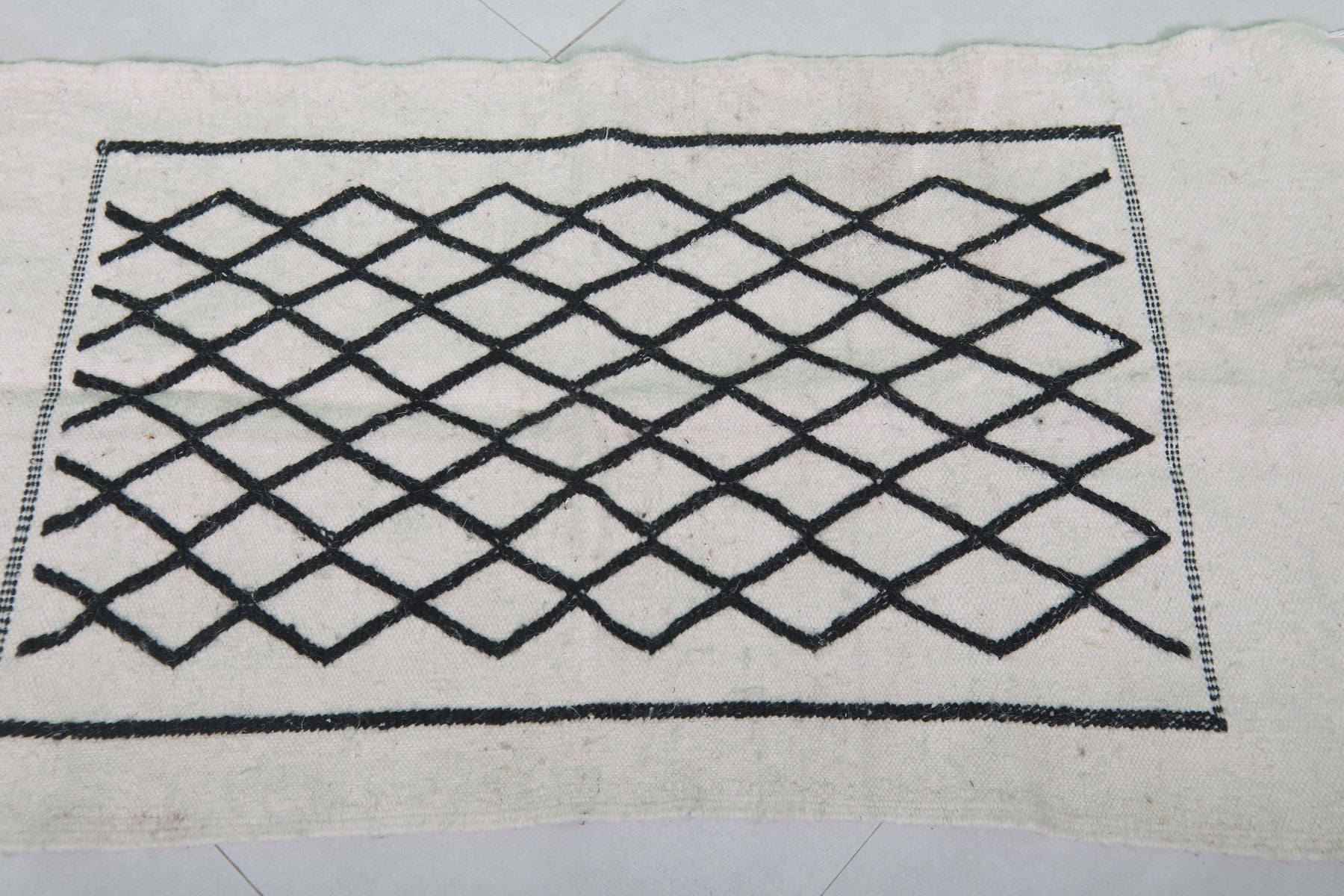 This 2 x 3.9 feet Moroccan Handwoven Kilim features a sophisticated geometric diamond pattern on a minimalist black-and-white base, blending traditional craftsmanship with modern elegance. Handwoven from premium wool, it offers exceptional durability and softness, making it ideal as an accent rug, wall hanging, or layered with larger carpets.