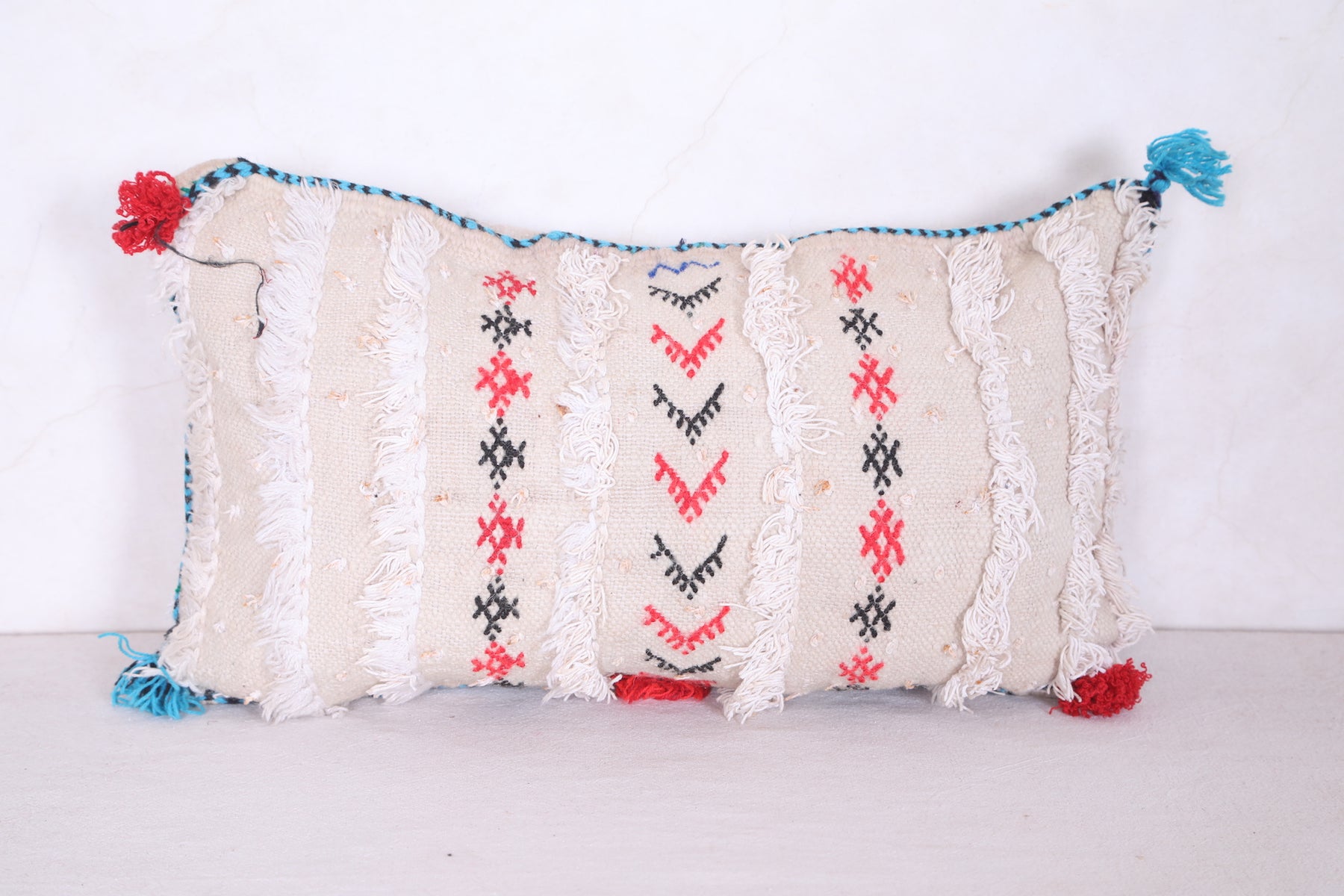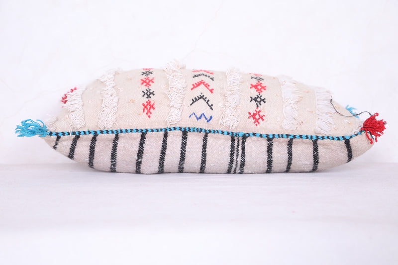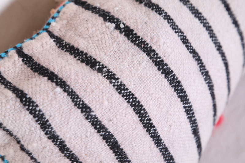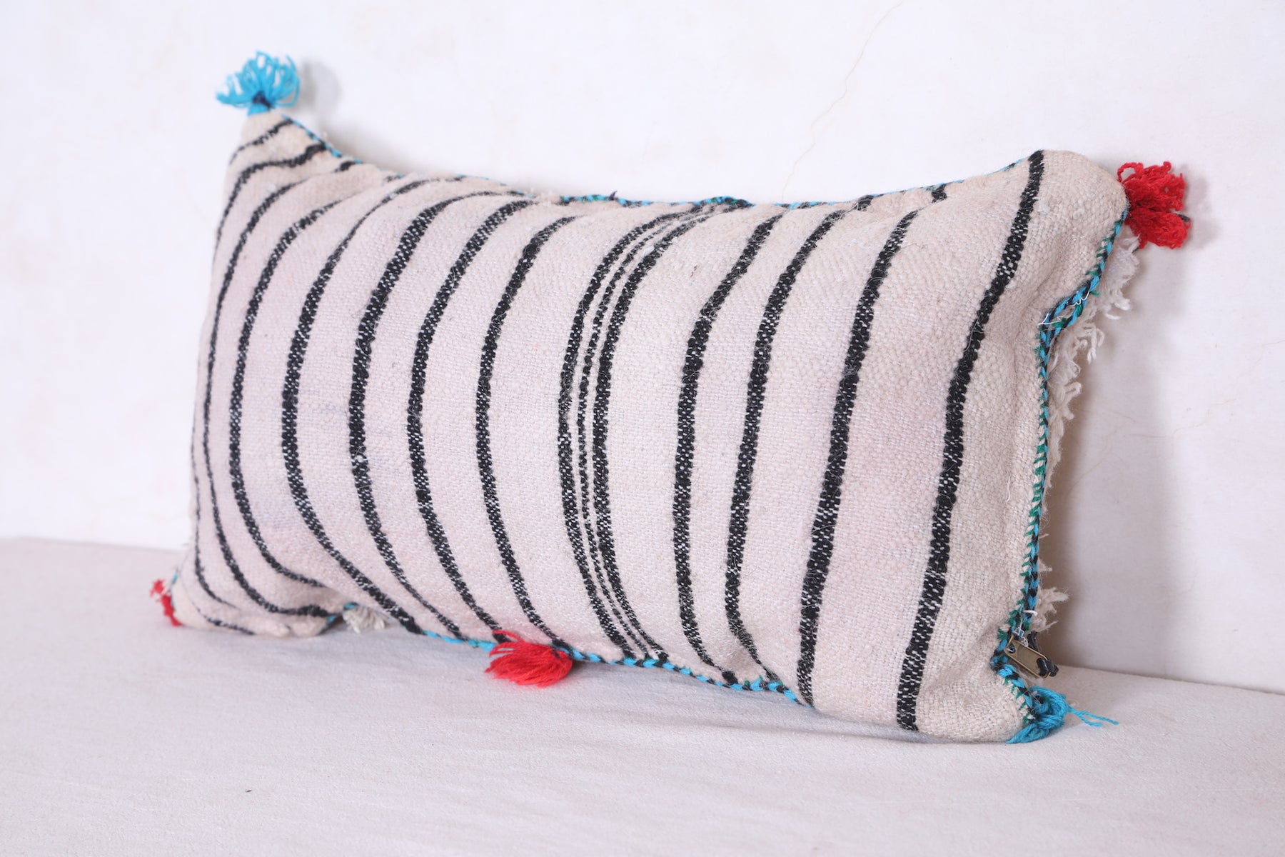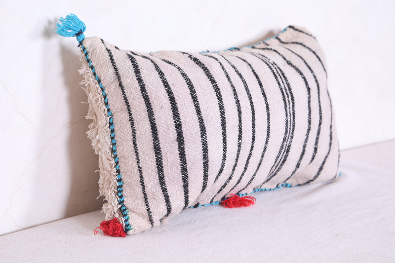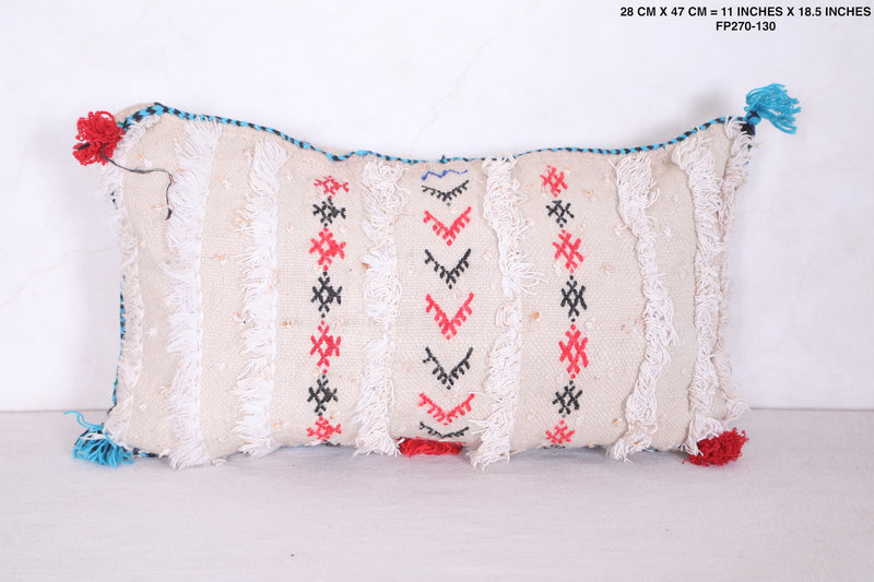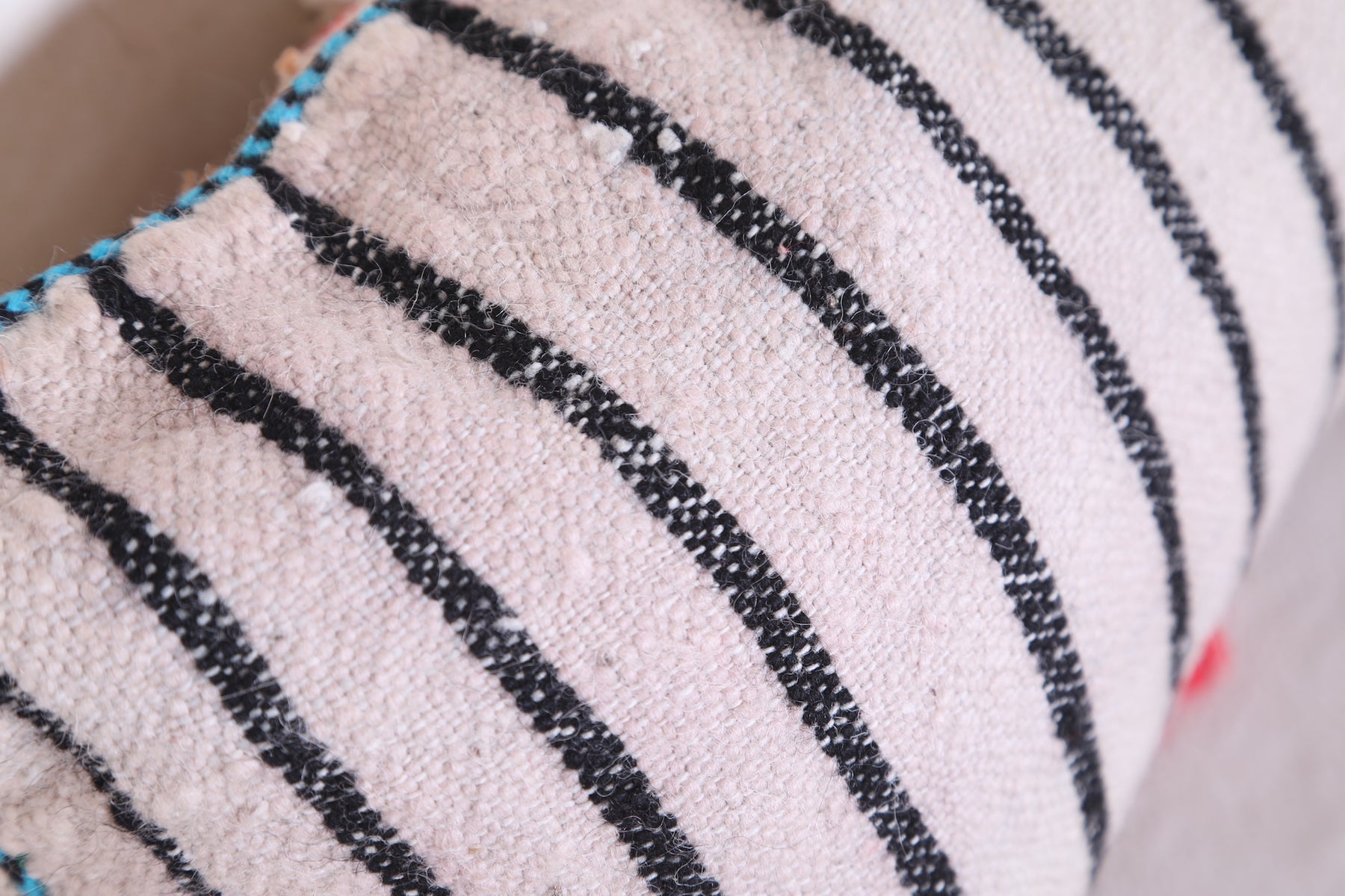 This traditional, handwoven Moroccan kilim pillow adds a stylish, unique touch to any living space. It measures 11 inches by 18.5 inches and is perfect for adding extra cushioning to your favorite chair or couch. The cover is crafted with a blend of wool and cotton for a soft and comfortable feel.