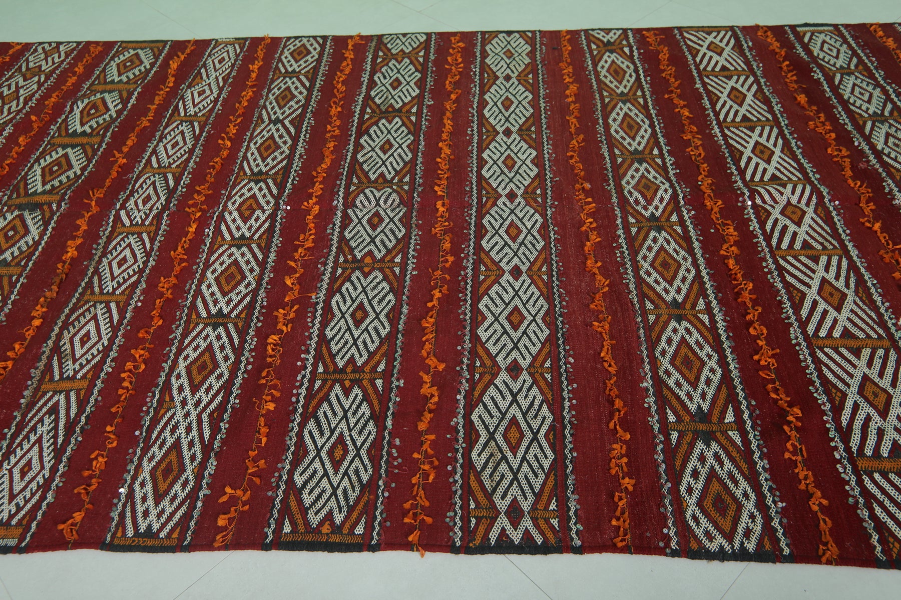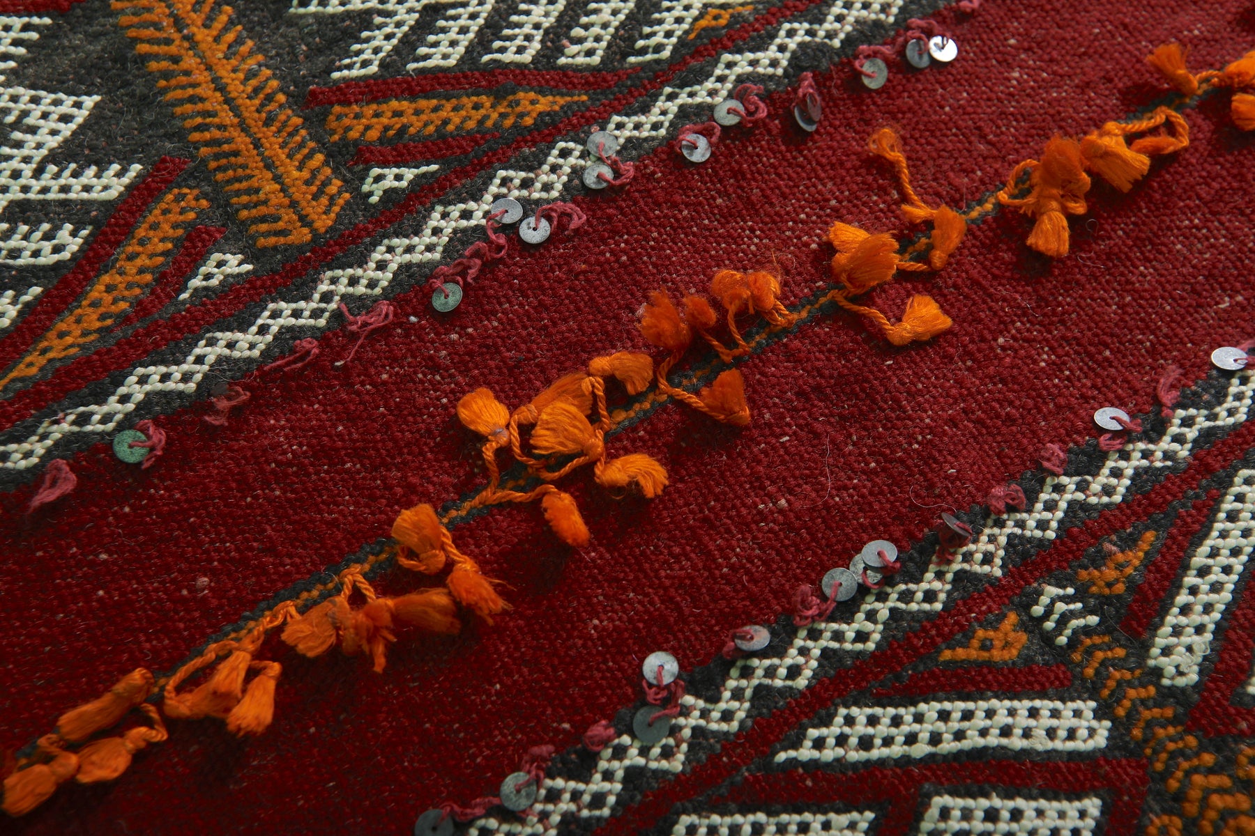 This 5.8 x 11.8 FT Moroccan Kilim Rug showcases a bold red base highlighted with intricate Berber-inspired geometric motifs. Its impressive length and vibrant design make it perfect for large living rooms, dining spaces, hallways, or statement interiors.