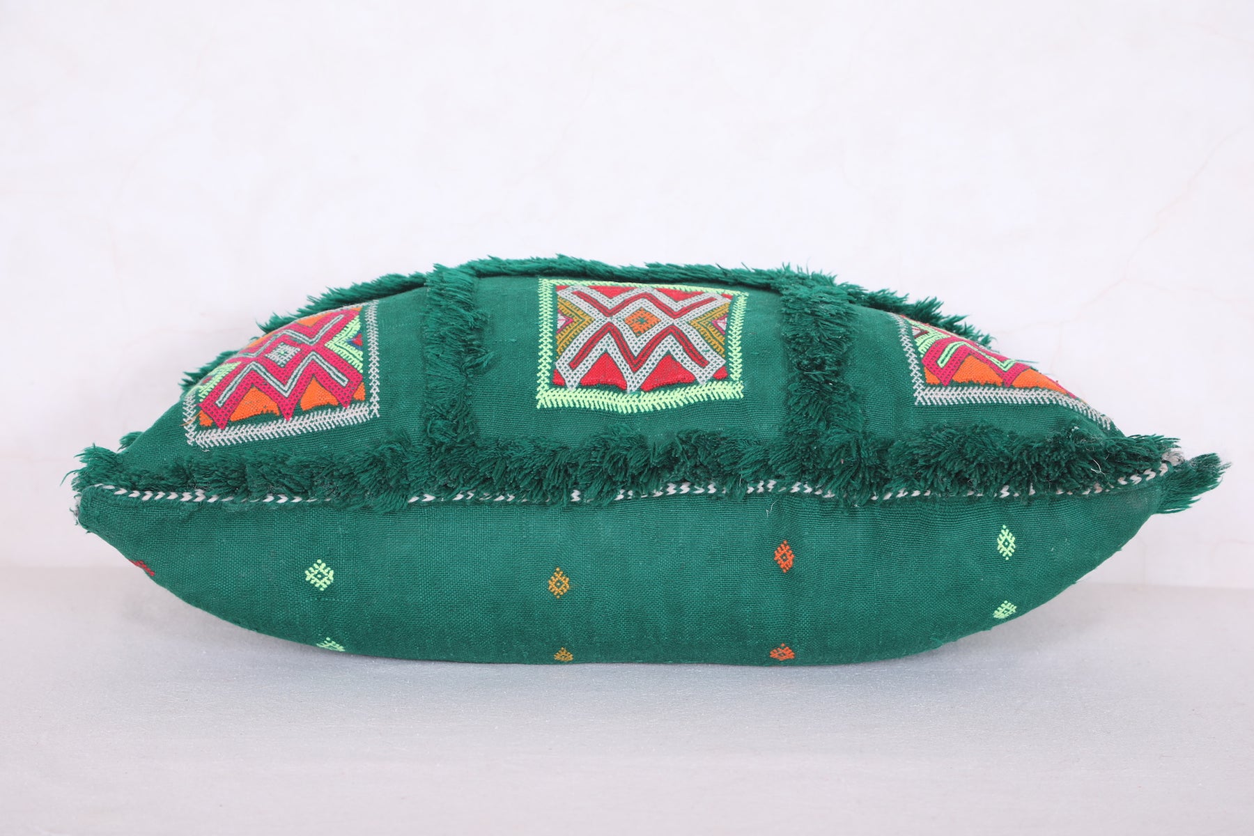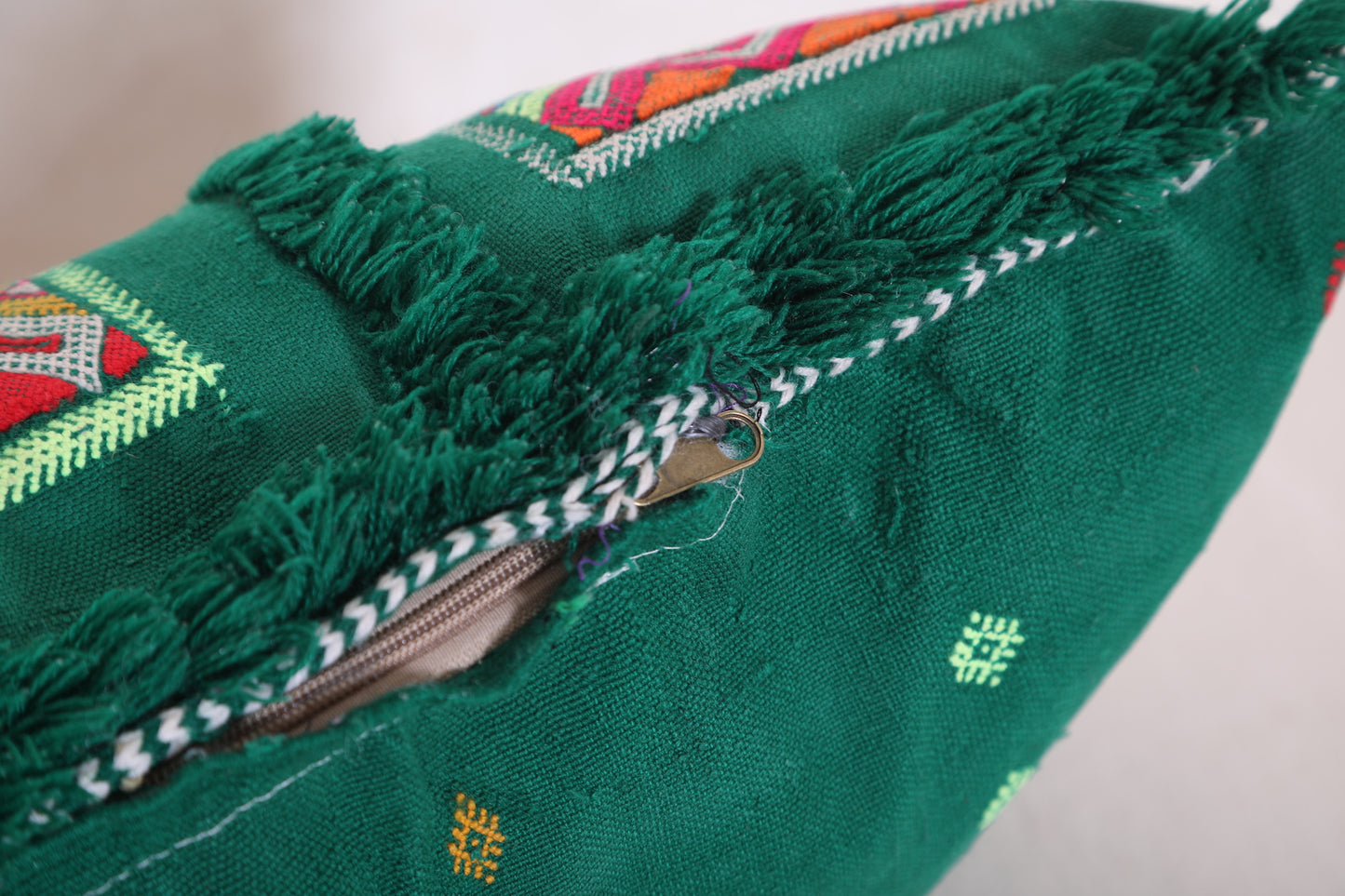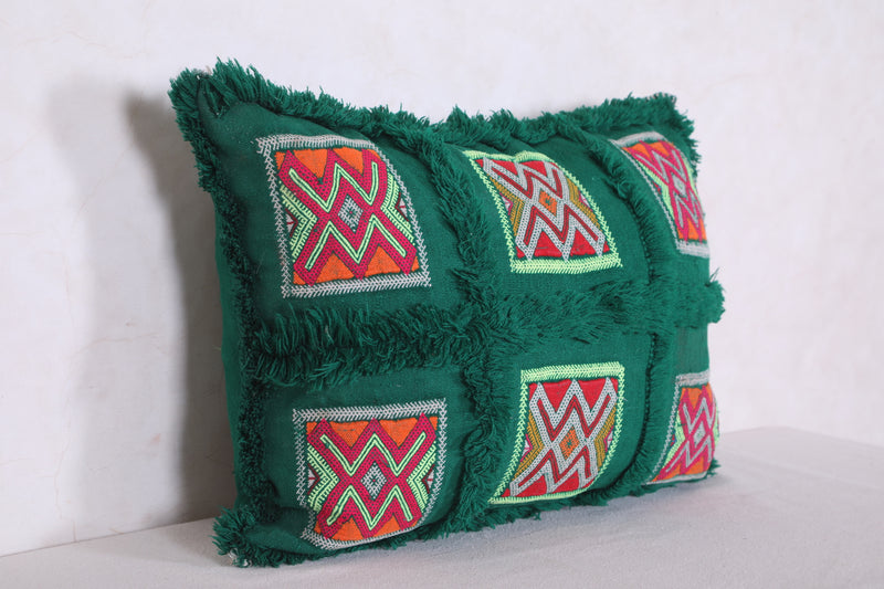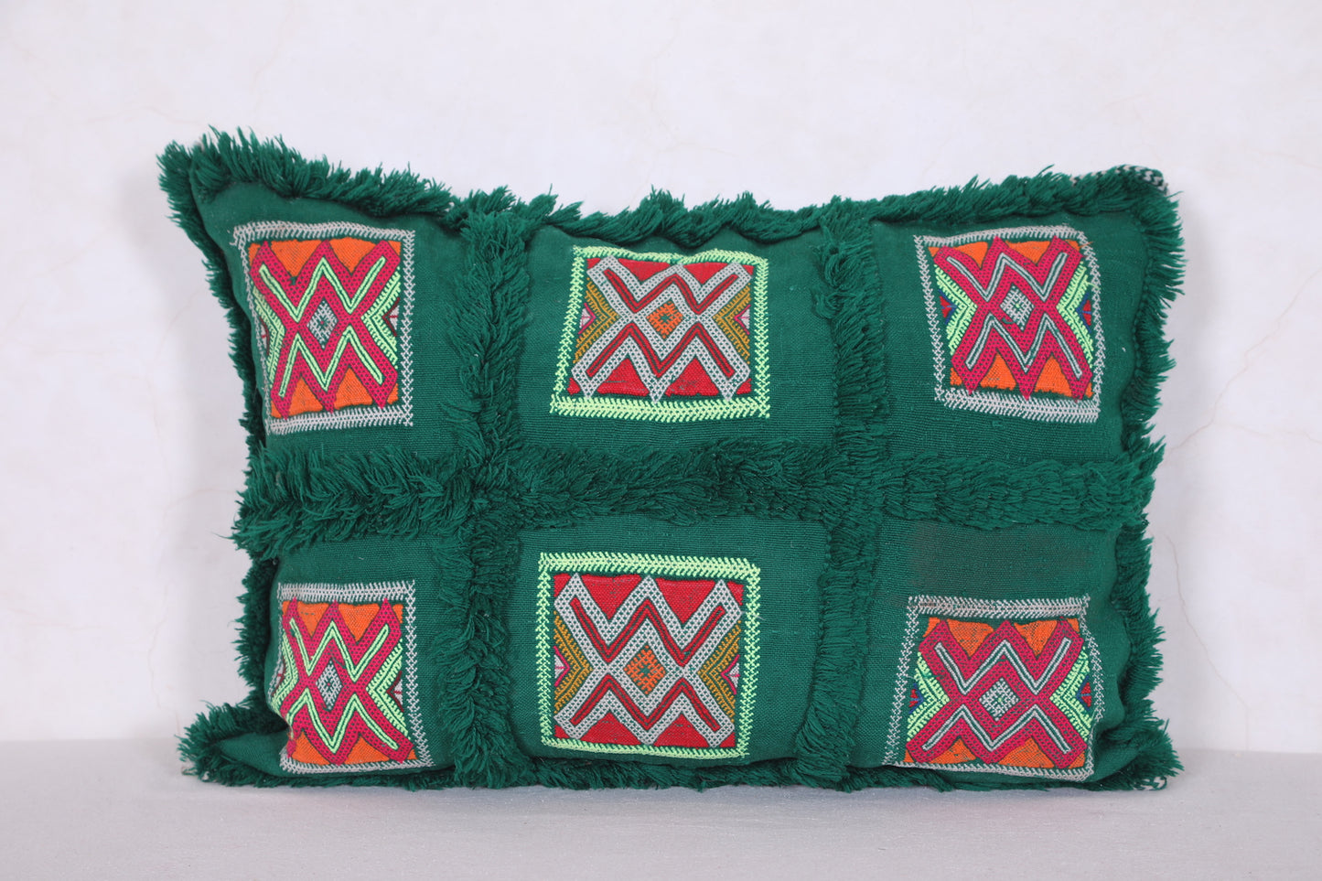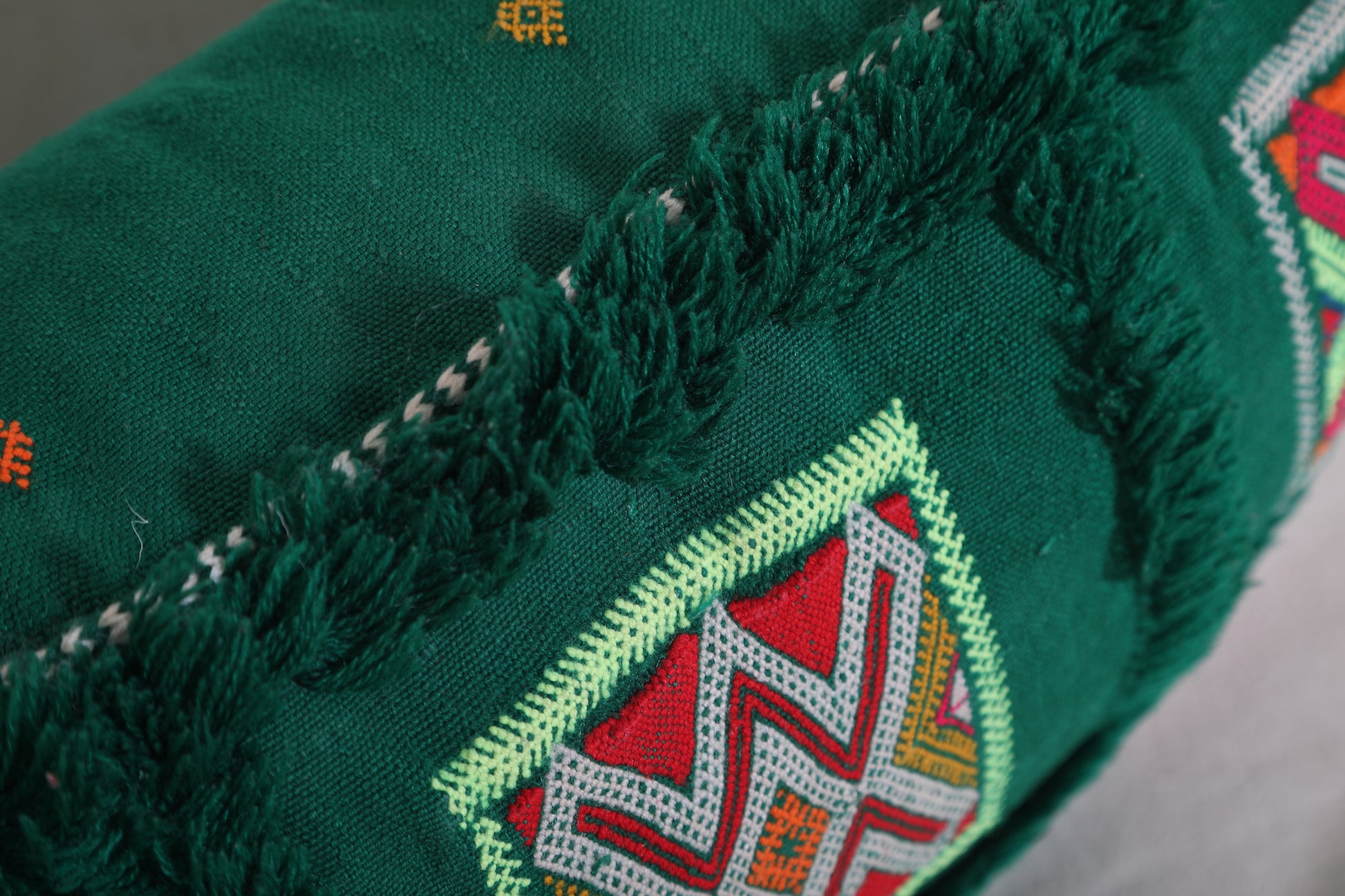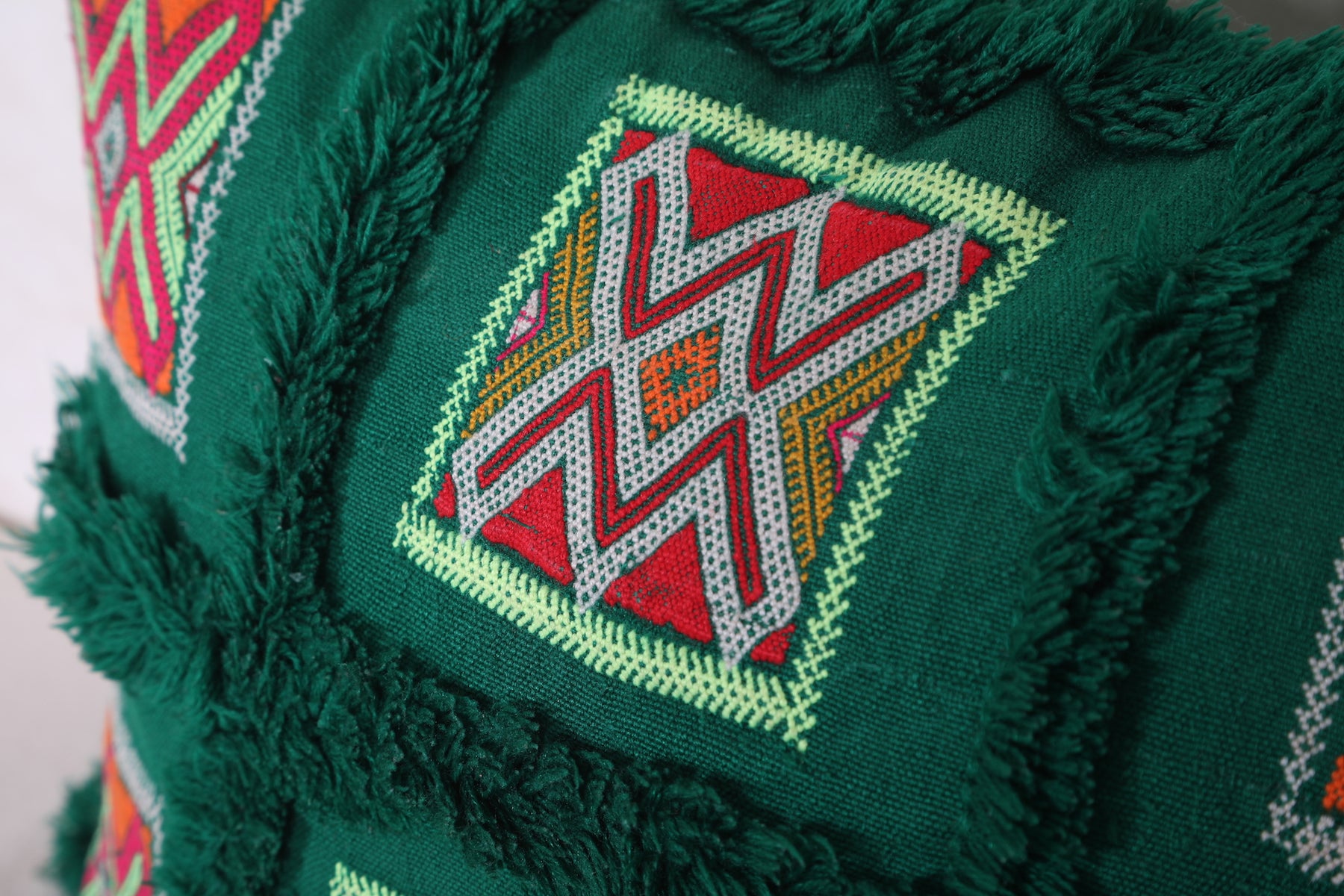 Add bold color and handcrafted artistry to your home with this handwoven Vintage Moroccan Pillow, sized at 16.1 x 22 inches (41 CM x 56 CM). Featuring a vibrant green background with red and white geometric embroidery, this pillow blends authentic Moroccan craftsmanship with eye-catching design. Perfect for enhancing your sofa, bed, or bench, it brings global character and playful charm to any space.