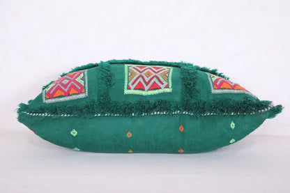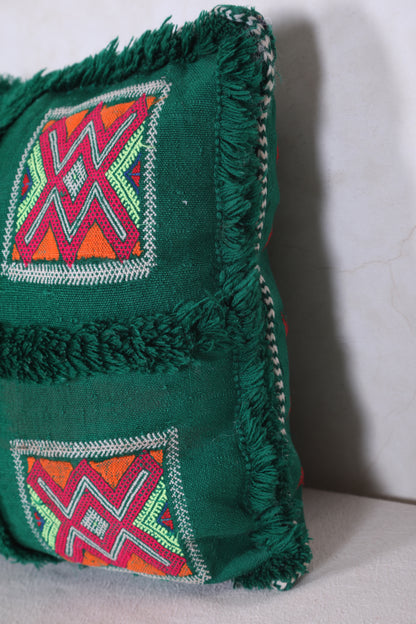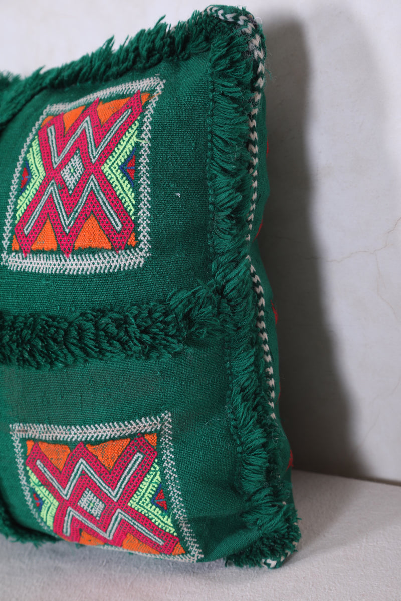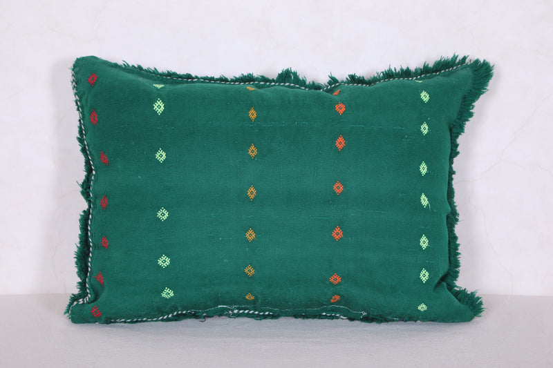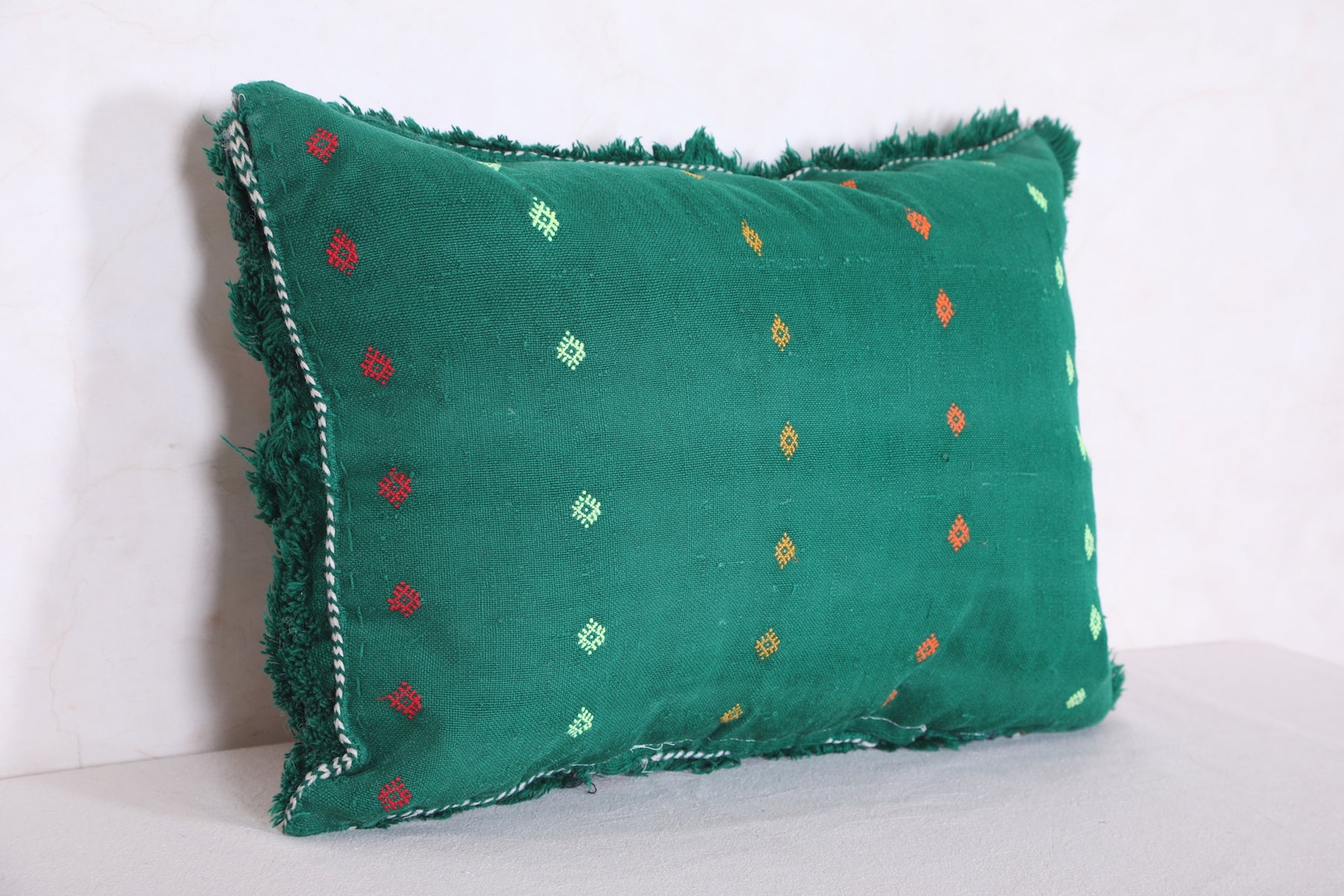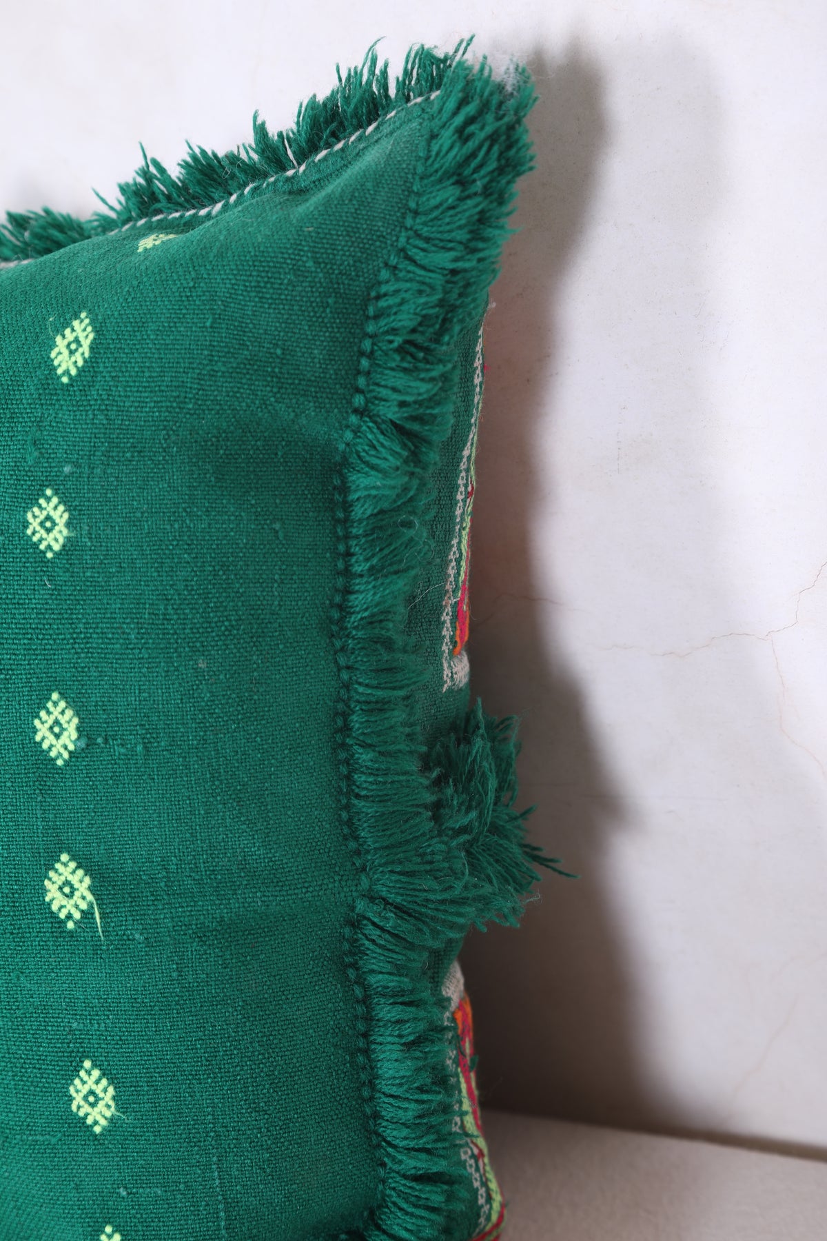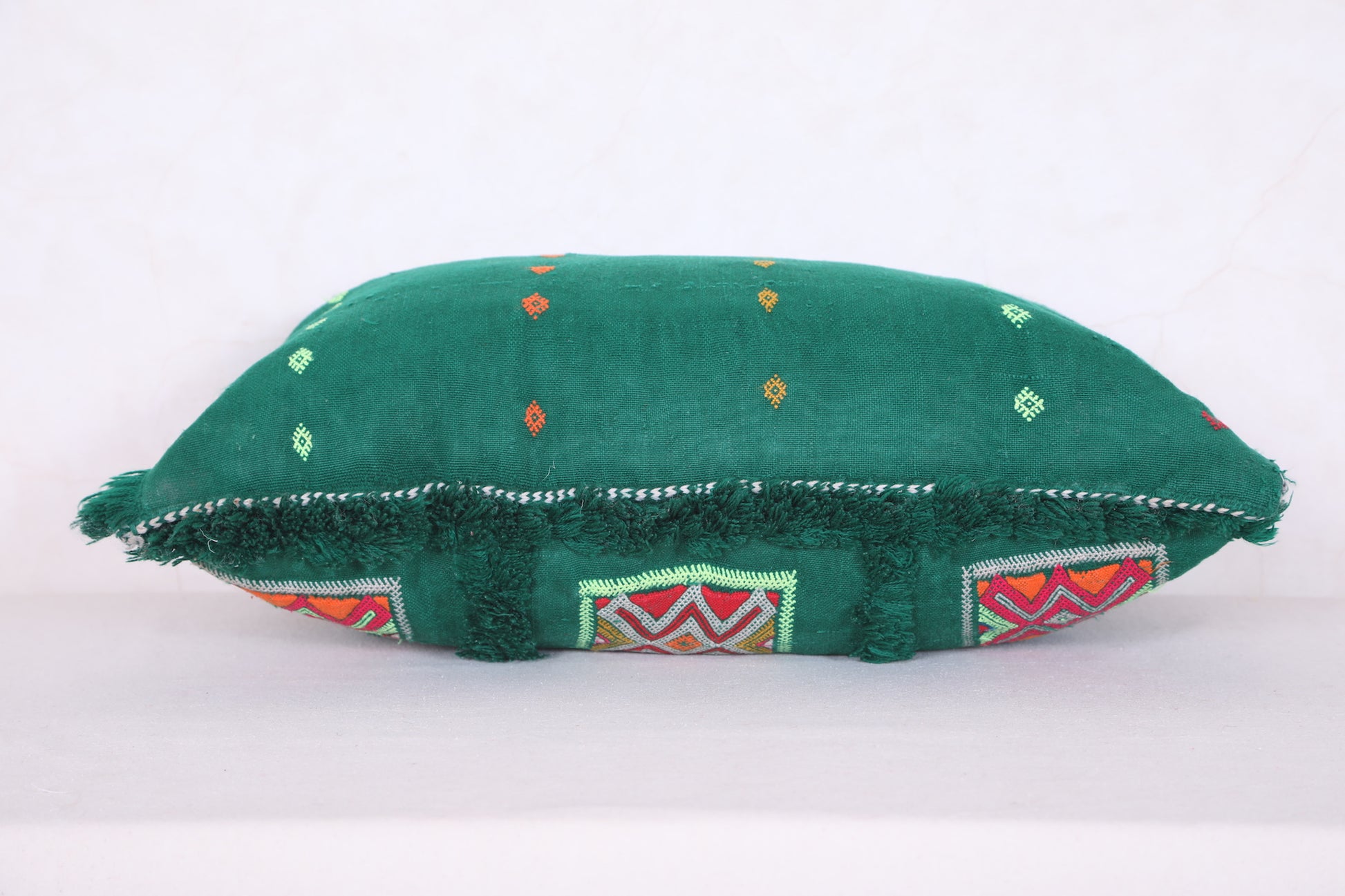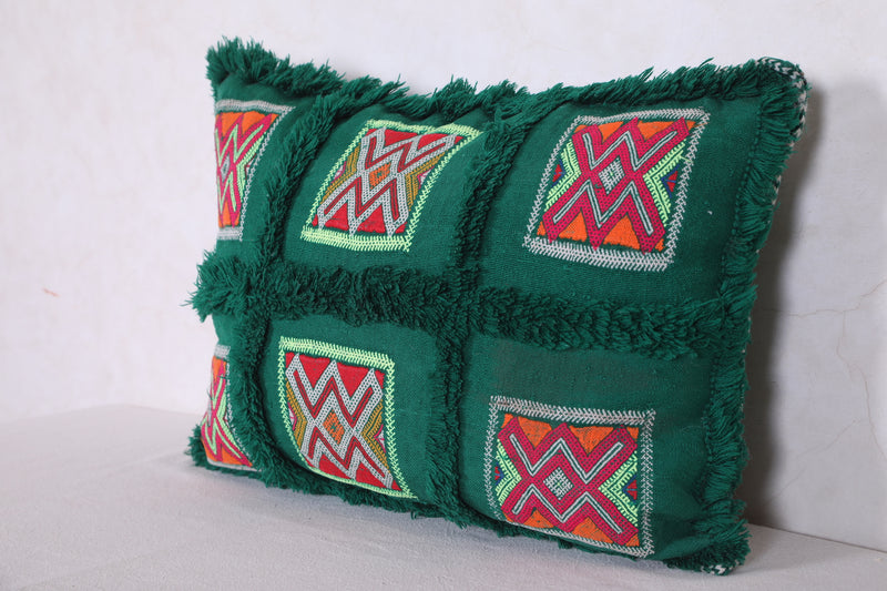 Add bold color and handcrafted artistry to your home with this handwoven Vintage Moroccan Pillow, sized at 16.1 x 22 inches (41 CM x 56 CM). Featuring a vibrant green background with red and white geometric embroidery, this pillow blends authentic Moroccan craftsmanship with eye-catching design. Perfect for enhancing your sofa, bed, or bench, it brings global character and playful charm to any space.