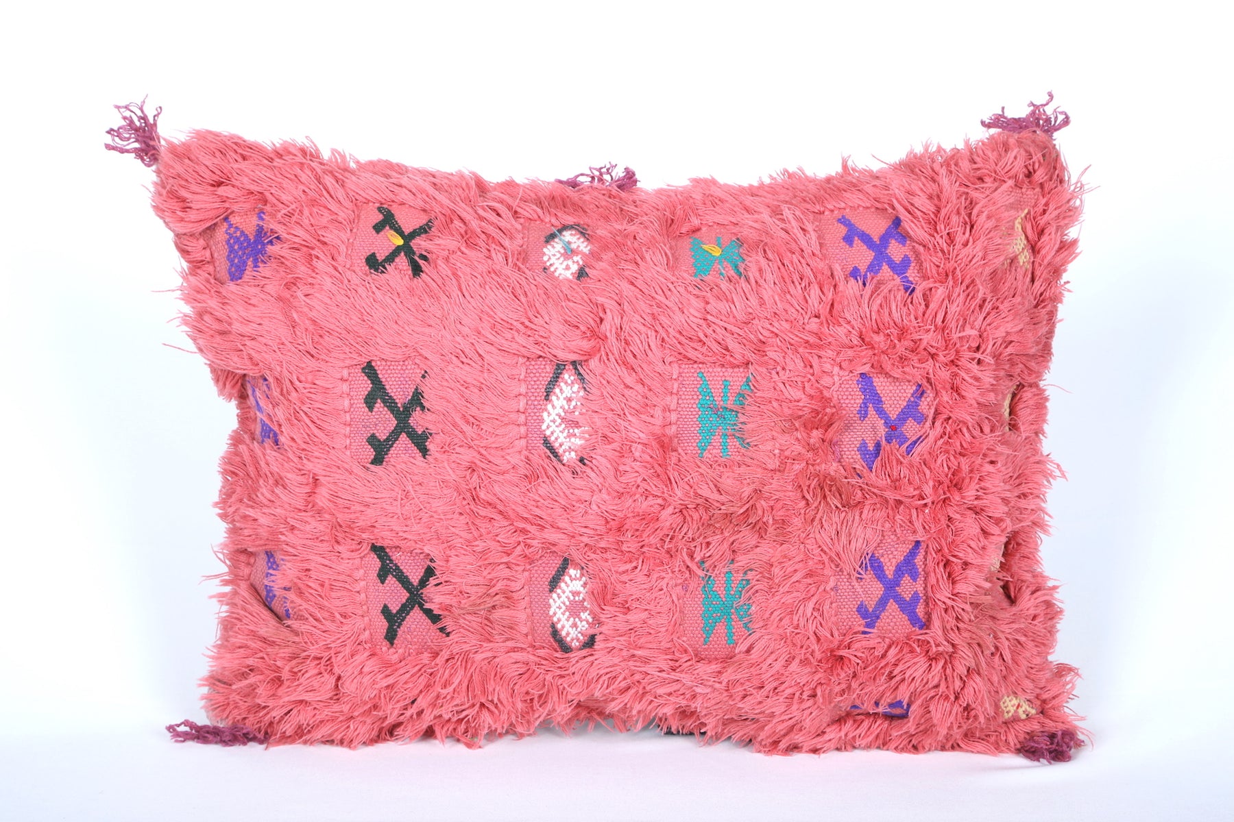 Add playful color and authentic Moroccan craftsmanship to your space with this handwoven Moroccan Pillow, sized at 15.3 x 20.4 inches (39 CM x 52 CM). Featuring a bold pink base with colorful embroidered symbols, this vibrant pillow brings personality, texture, and global charm to any room. Whether on a sofa, bed, or accent chair, it’s a conversation piece that stands out.