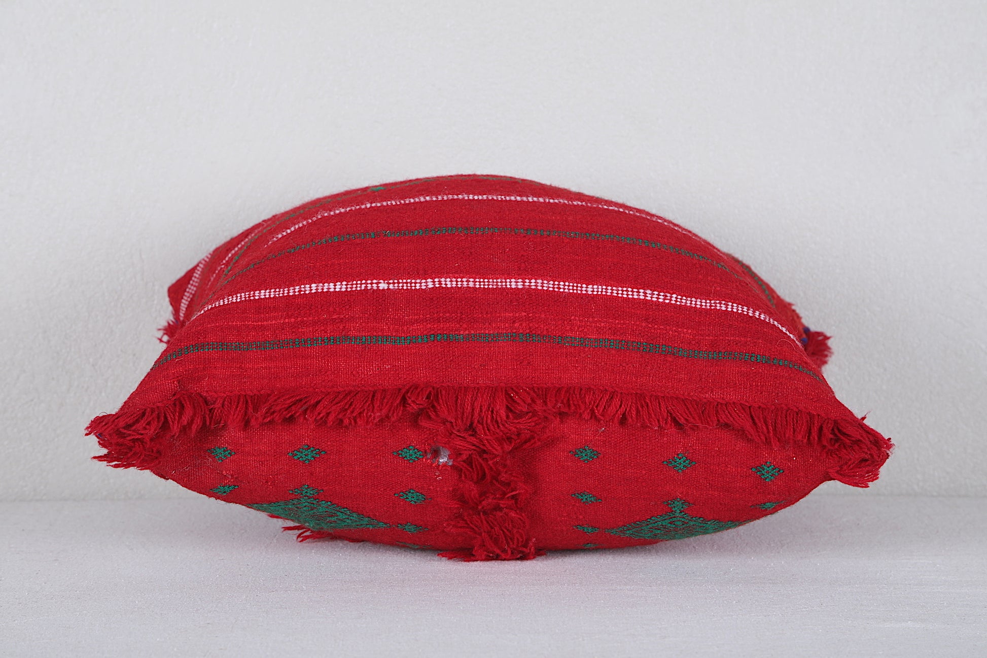 Add texture and handcrafted artistry to your home with this handwoven Striped Moroccan Pillow, sized at 14.9 x 18.1 inches (38 CM x 46 CM). Featuring a bold red background with intricate green embroidered motifs and textured fringe accents, this pillow blends authentic Moroccan craftsmanship with boho charm. Perfect for adding a statement piece to your sofa, bed, or favorite chair, it brings rich color and global style to your space.