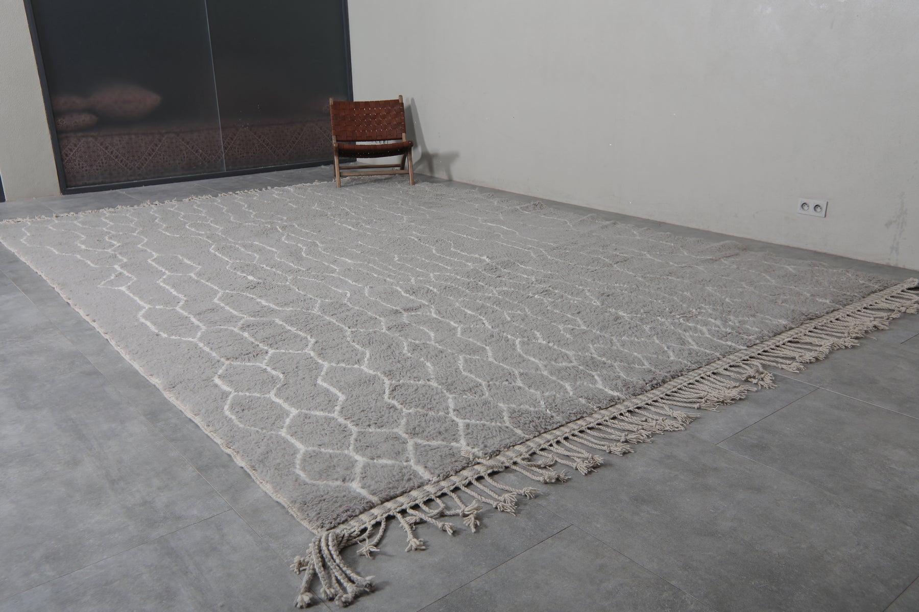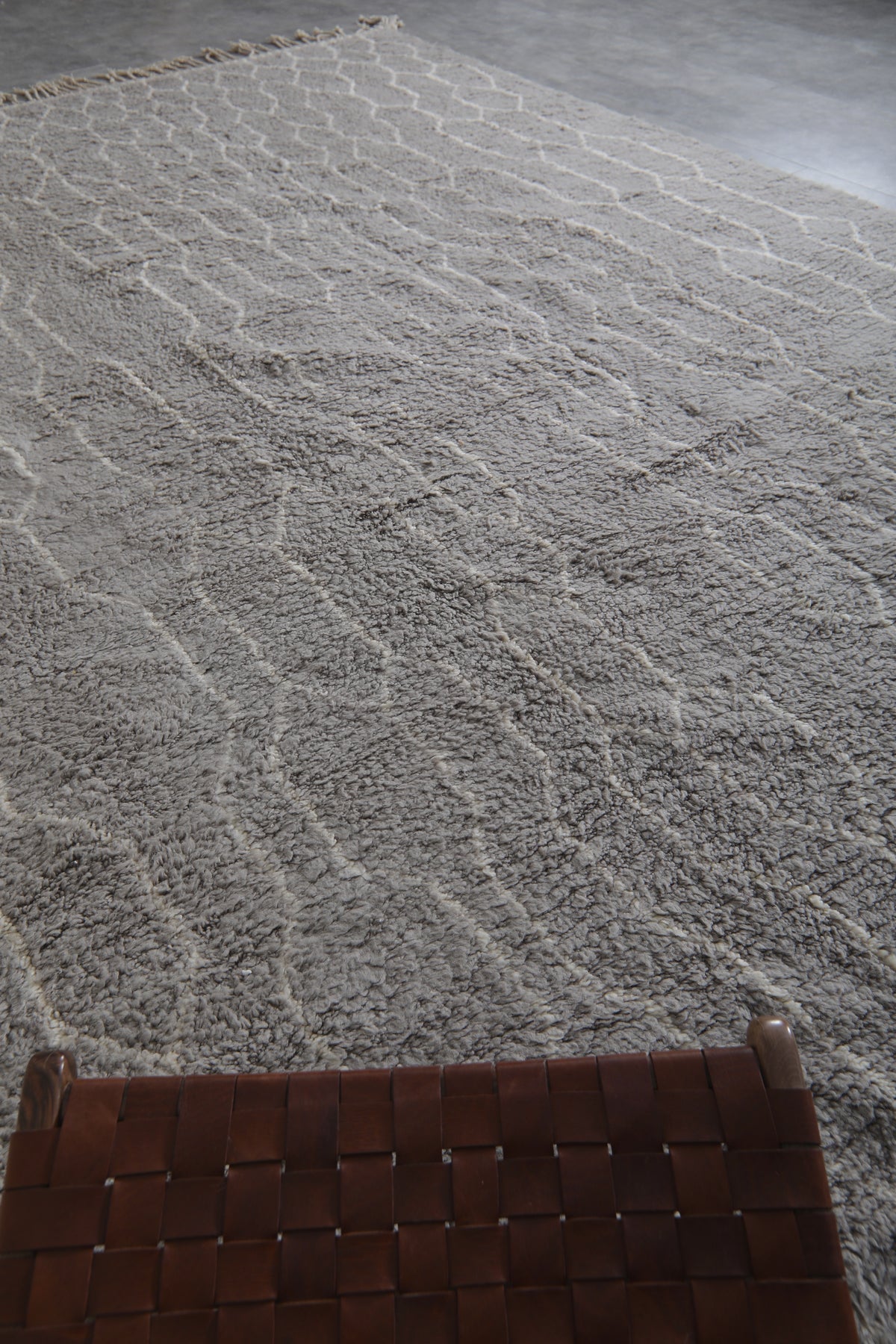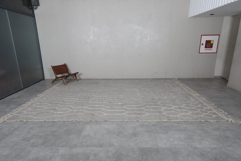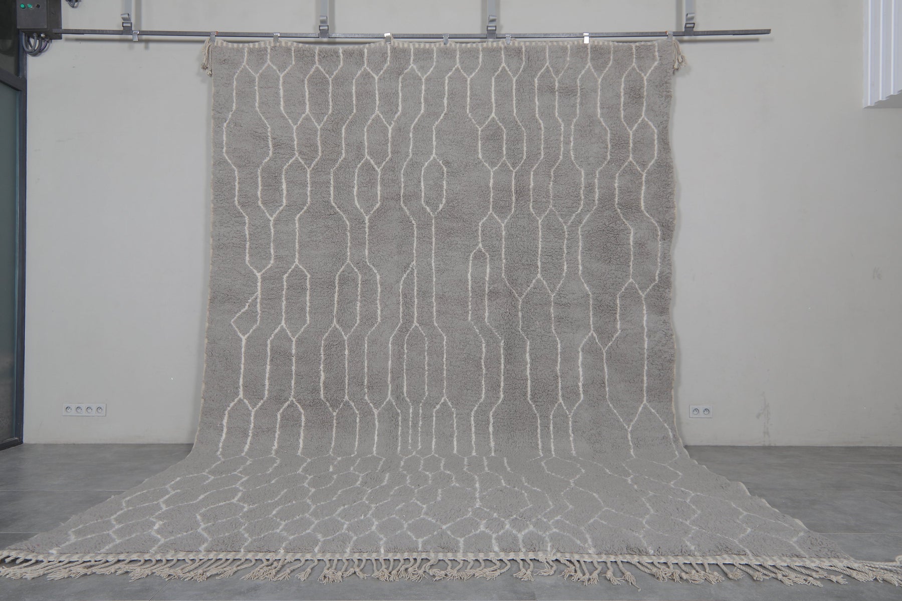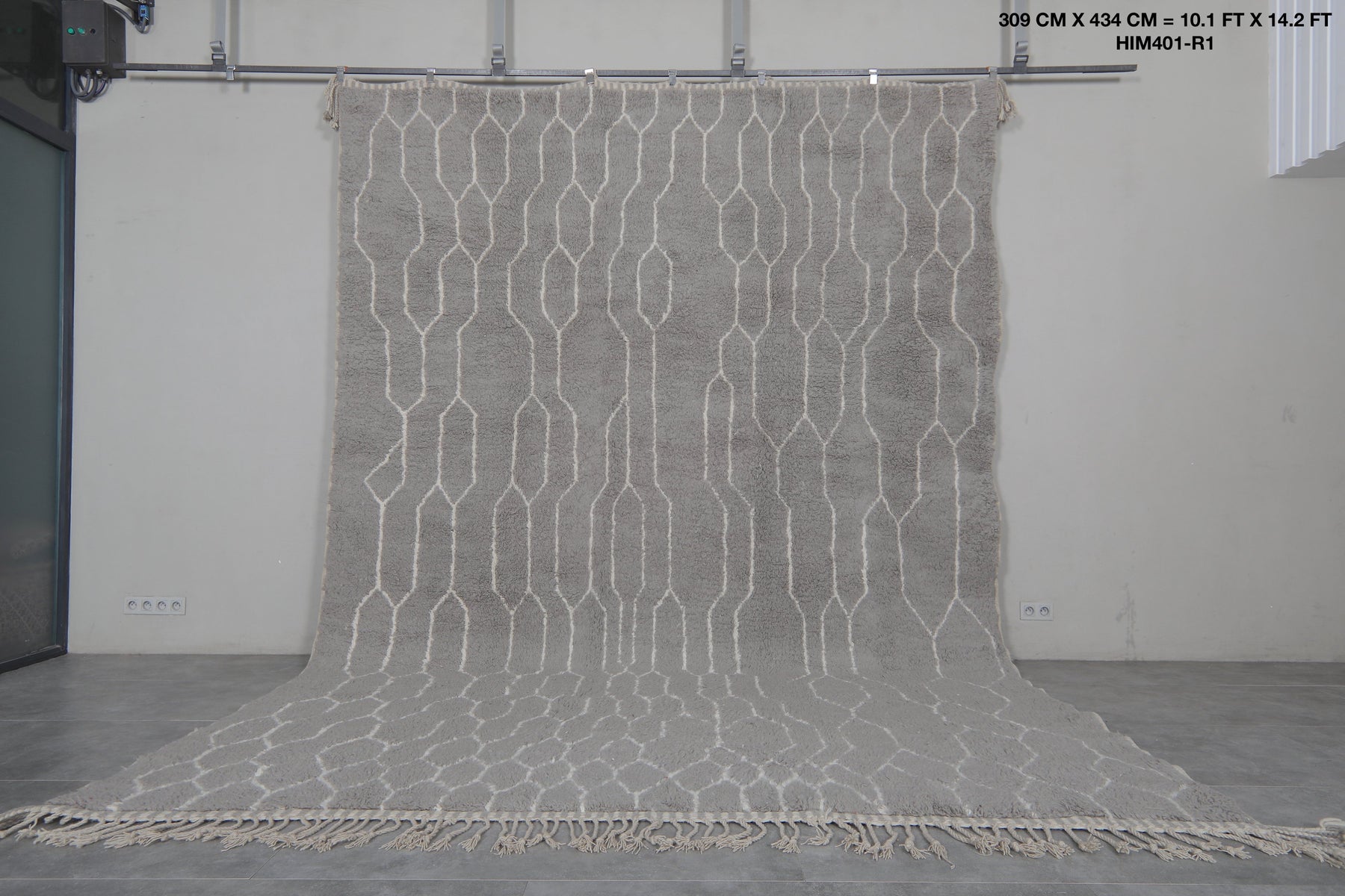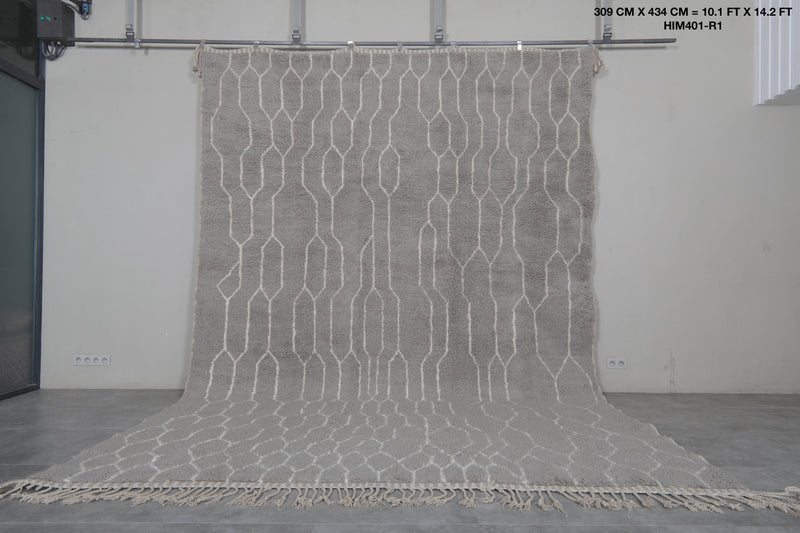 Enhance your home with this Large Moroccan Rug, sized at 10.1 x 14.2 feet (309 CM x 434 CM). Featuring an intricate white geometric pattern on a soft gray background, this spacious handwoven rug adds elegance and depth to large living rooms or bedrooms. Combining modern design with Moroccan craftsmanship, it brings warmth and sophistication to any interior.
