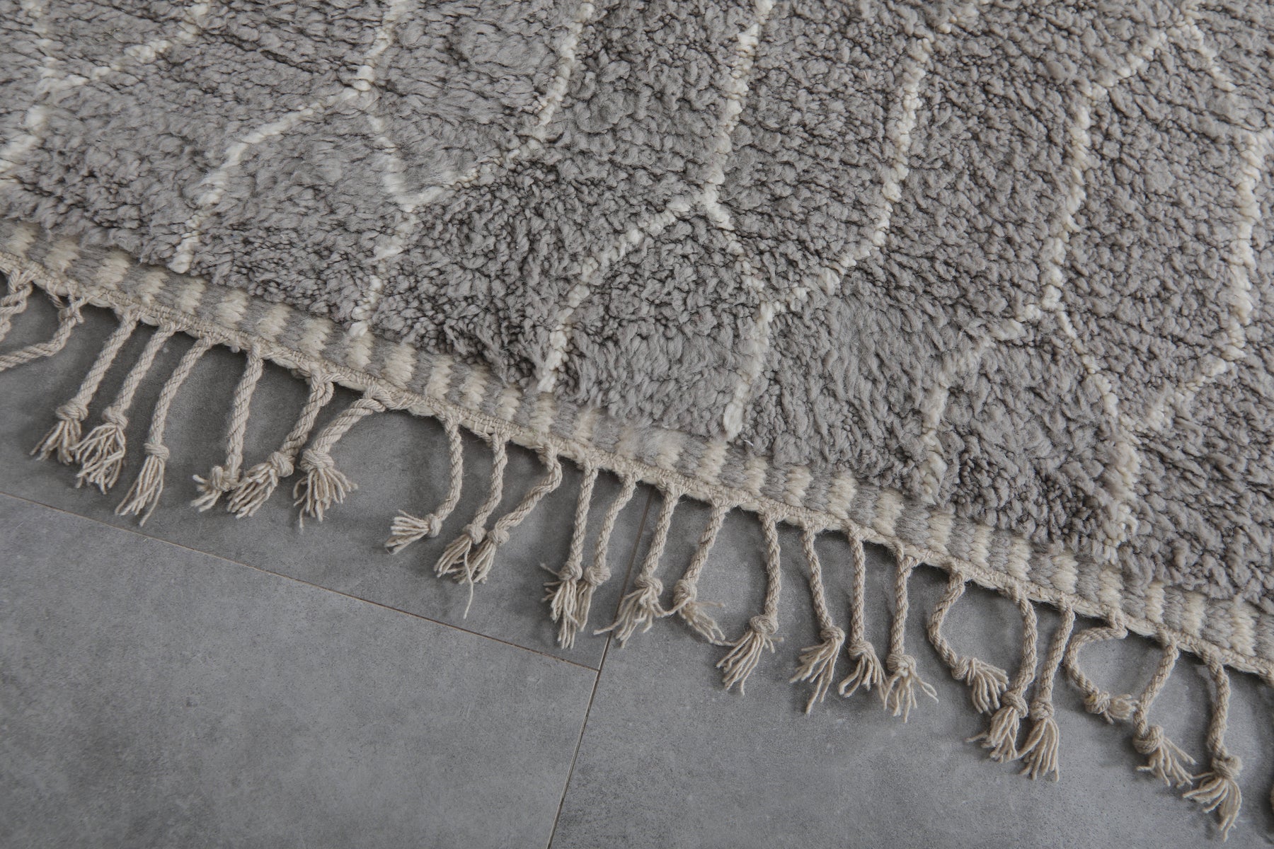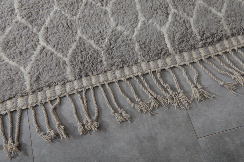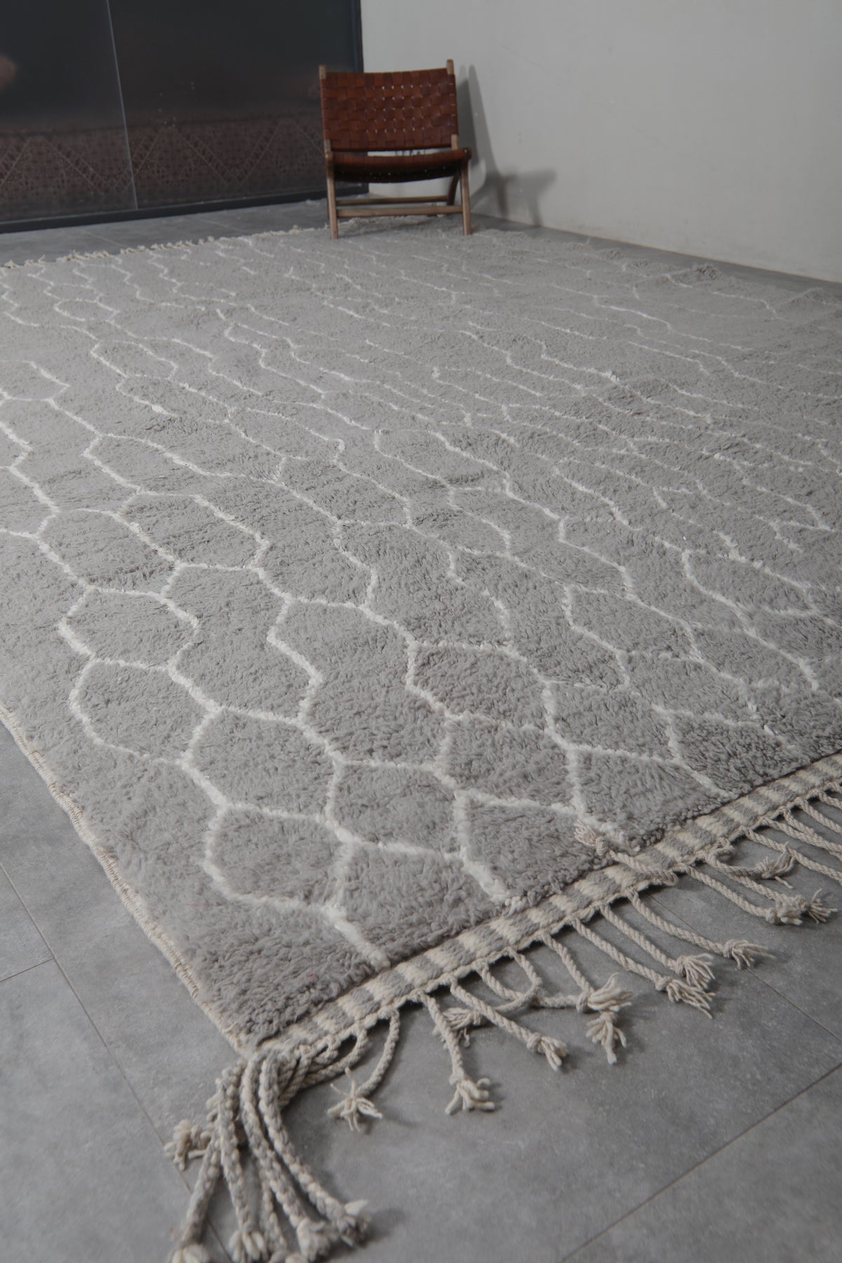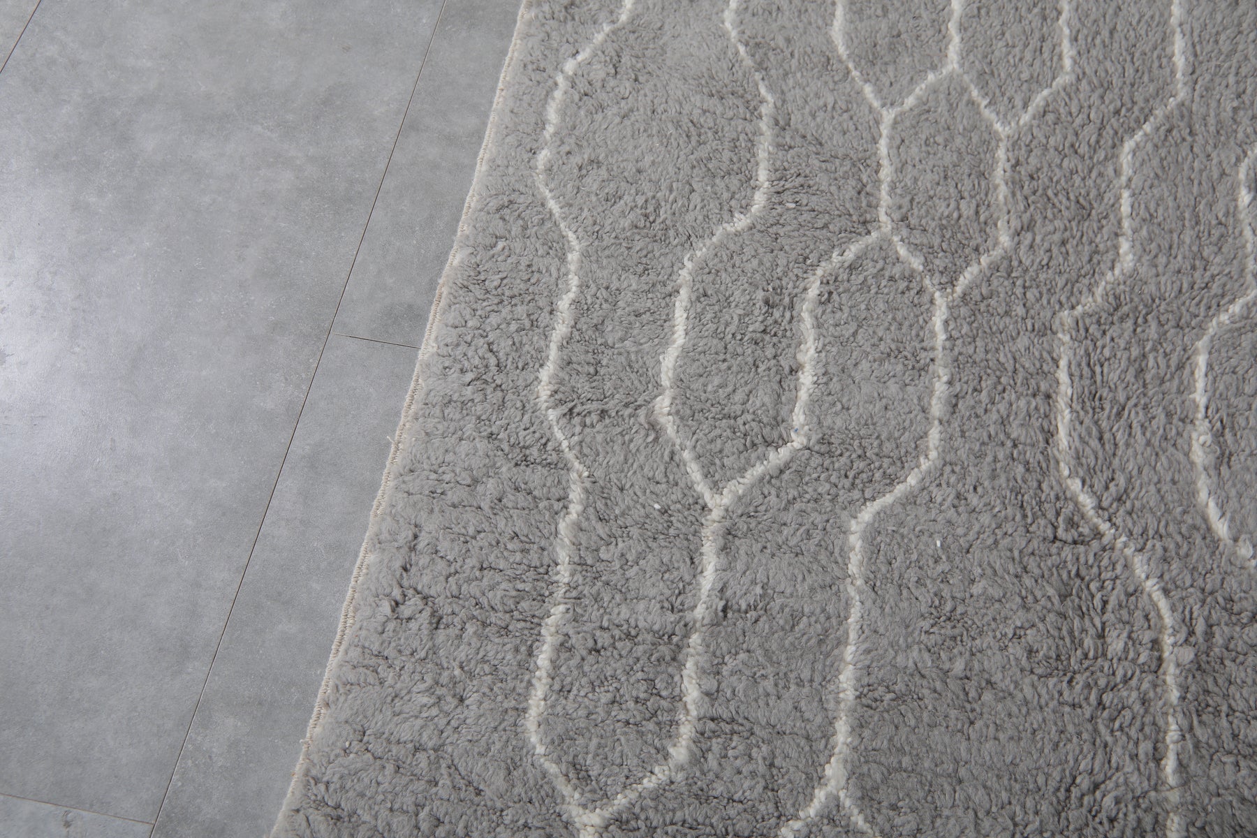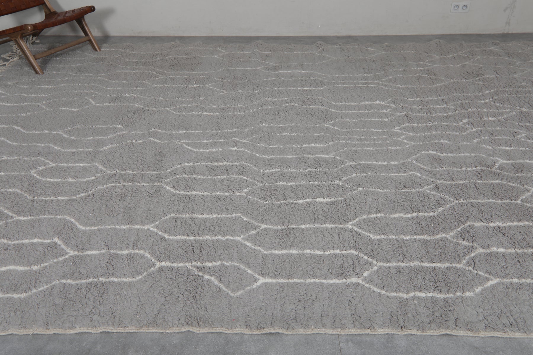 Enhance your home with this Large Moroccan Rug, sized at 10.1 x 14.2 feet (309 CM x 434 CM). Featuring an intricate white geometric pattern on a soft gray background, this spacious handwoven rug adds elegance and depth to large living rooms or bedrooms. Combining modern design with Moroccan craftsmanship, it brings warmth and sophistication to any interior.