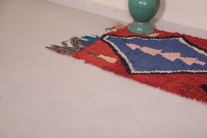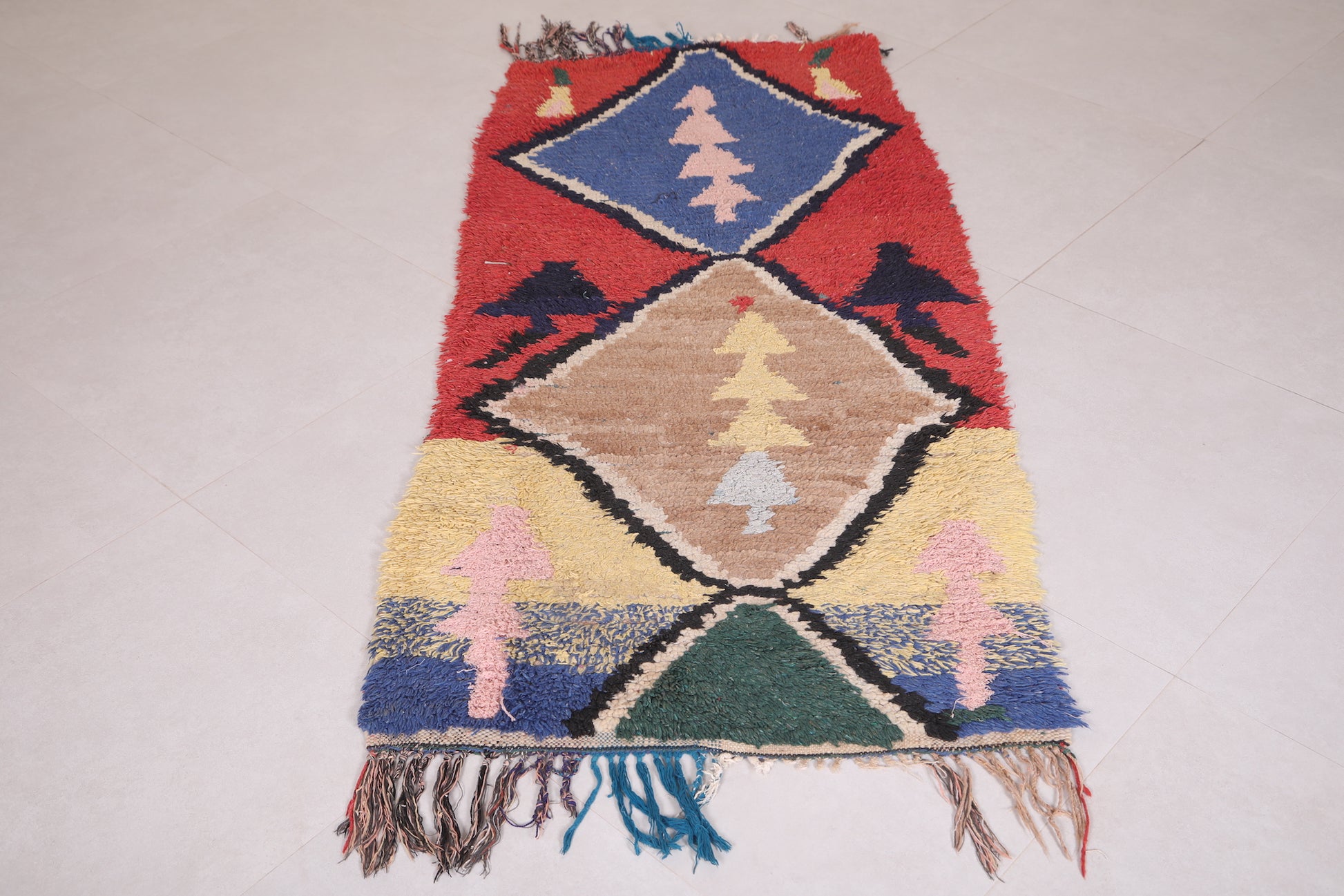 This Moroccan rug, sized 2.7 x 6.1 feet, features a striking design with geometric tree motifs in bold colors like red, blue, and yellow. The rich color palette and contemporary patterns make it a vibrant addition to any modern or eclectic interior. Perfect for adding warmth and personality to living rooms, bedrooms, or hallways, this rug creates an eye-catching focal point in any space. The soft texture and unique design offer both comfort and style to your home décor.