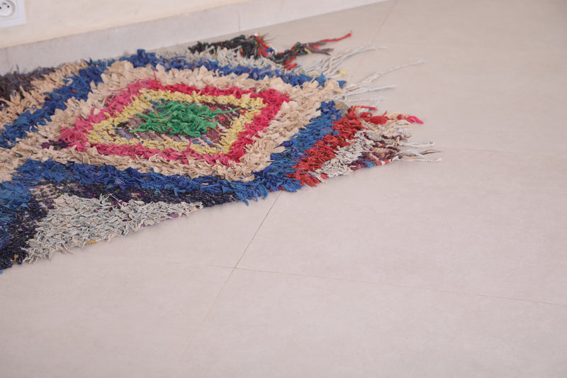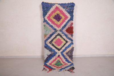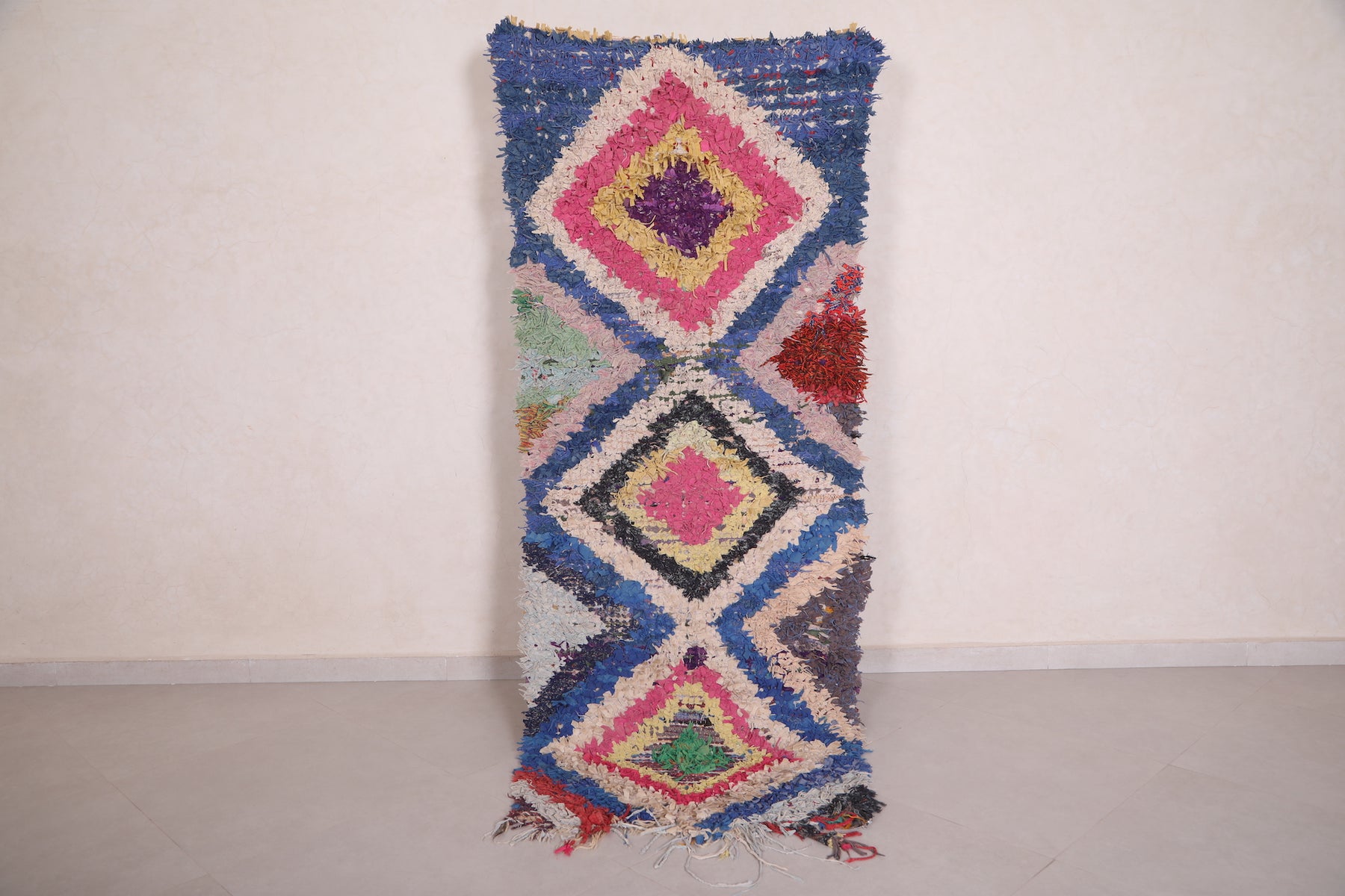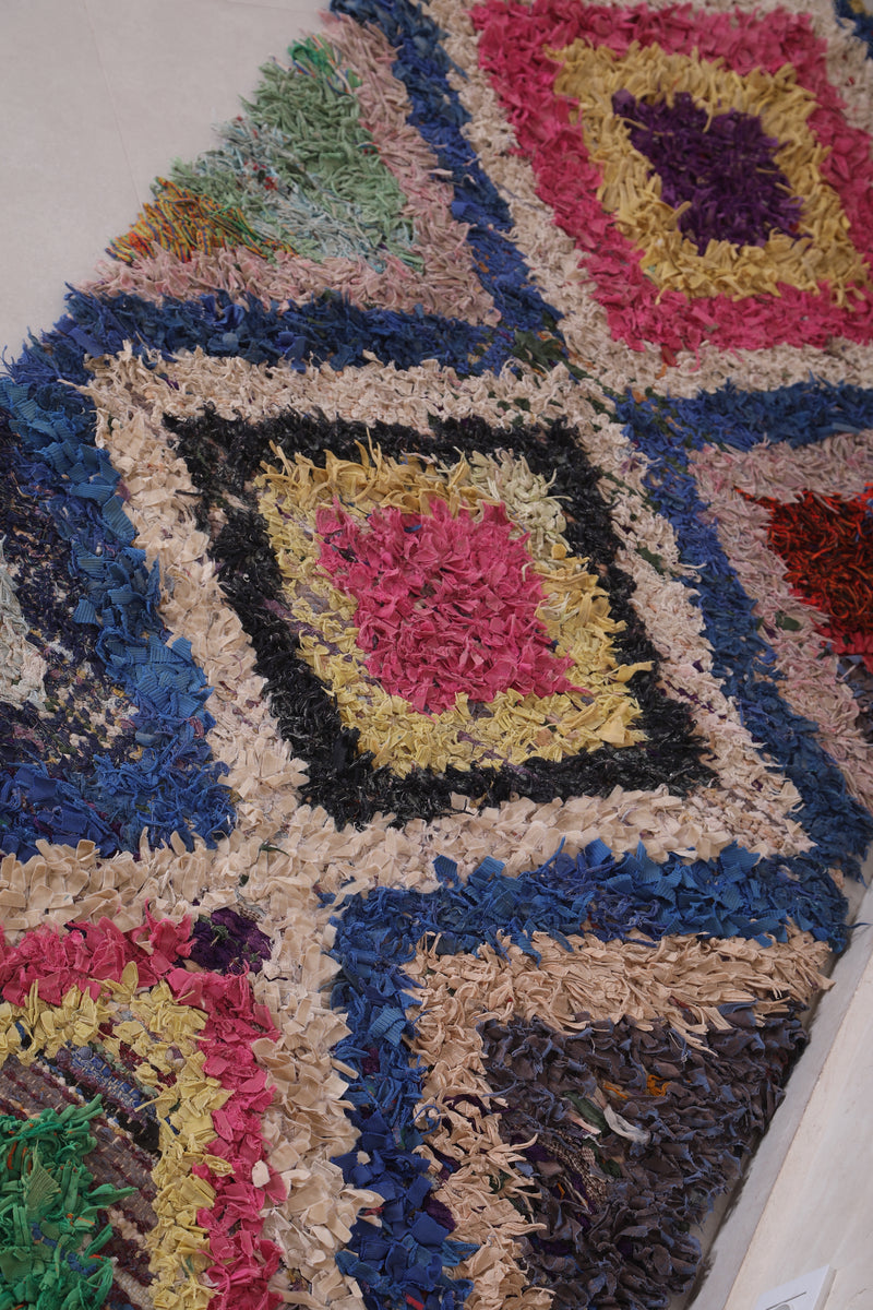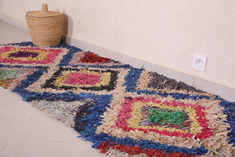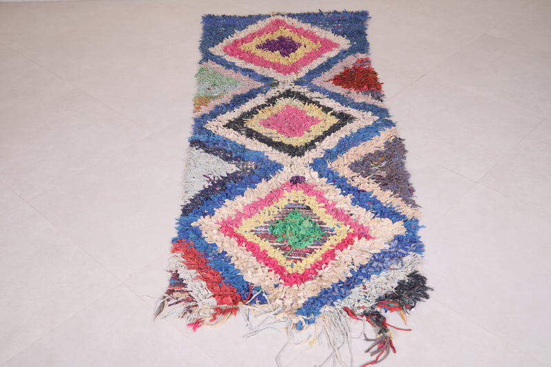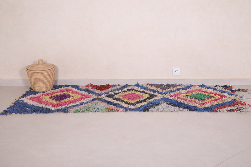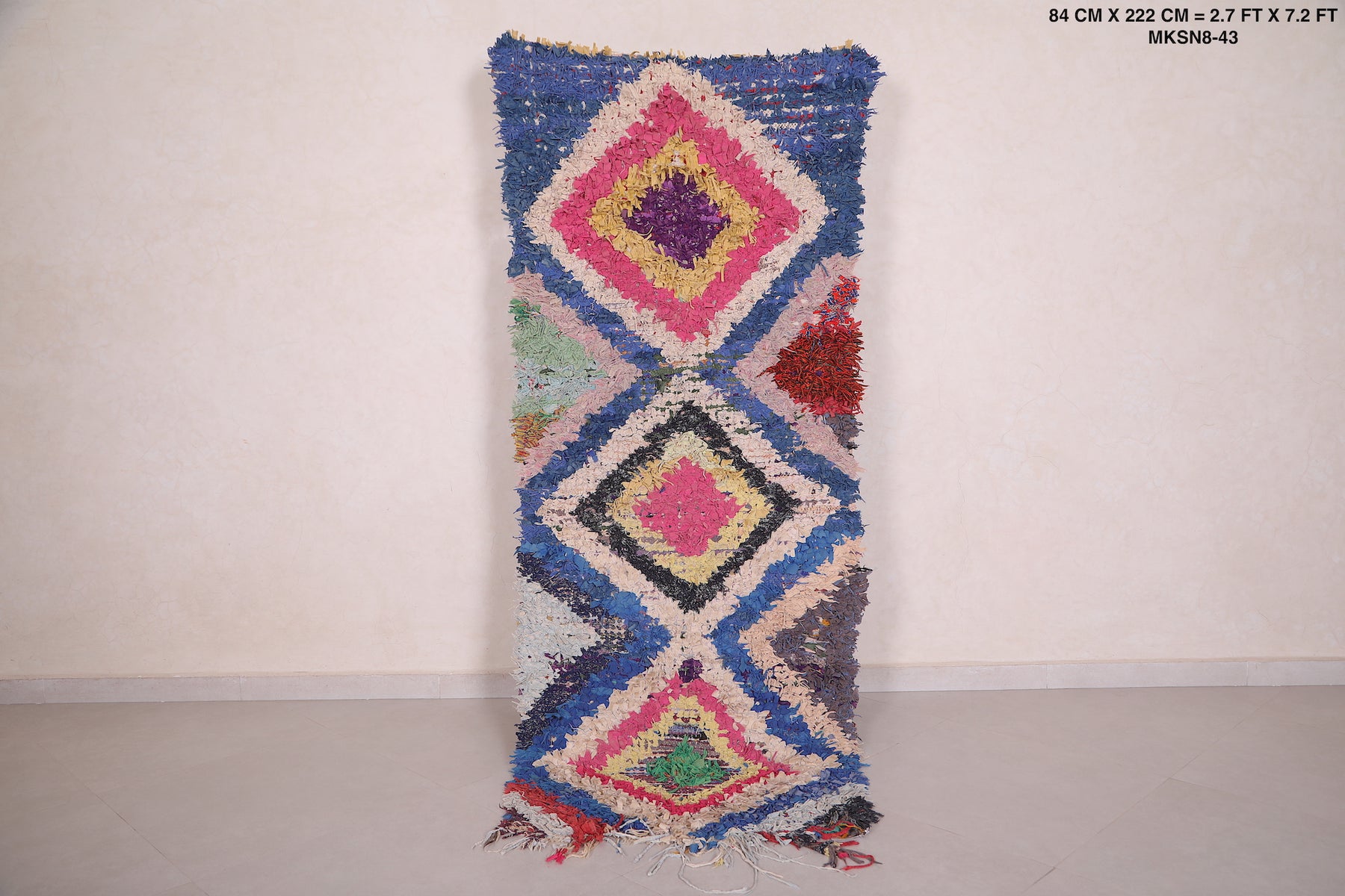 Make a bold statement in your home with this handwoven Moroccan rug, featuring striking geometric diamond patterns in vibrant shades of pink, blue, yellow, and black. Measuring 2.7 x 7.2 feet, this unique piece is perfect for hallways, statement spaces, or layering, adding charm and character to any setting.