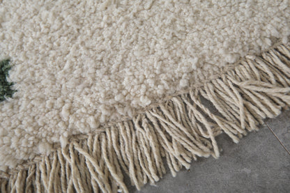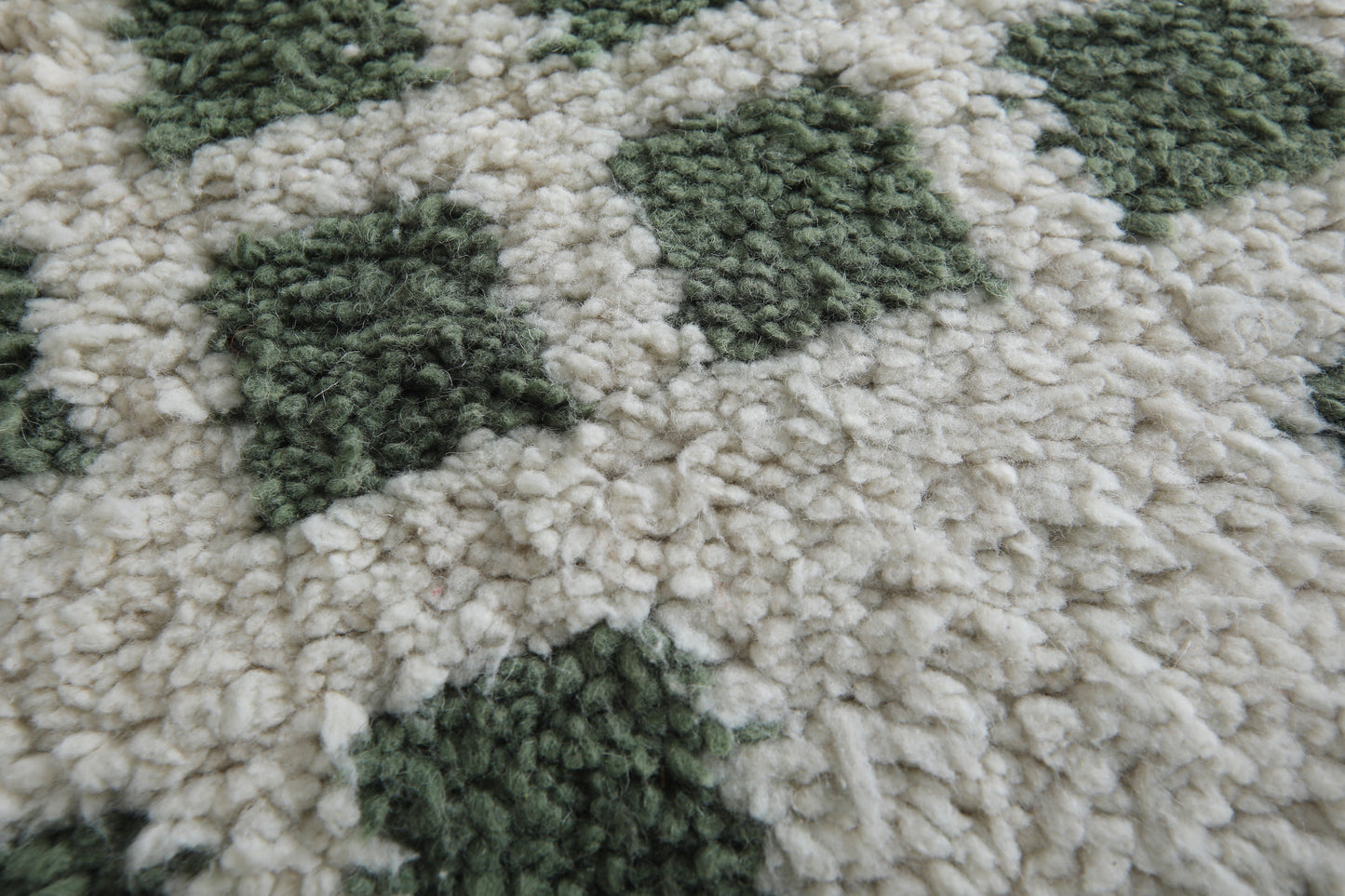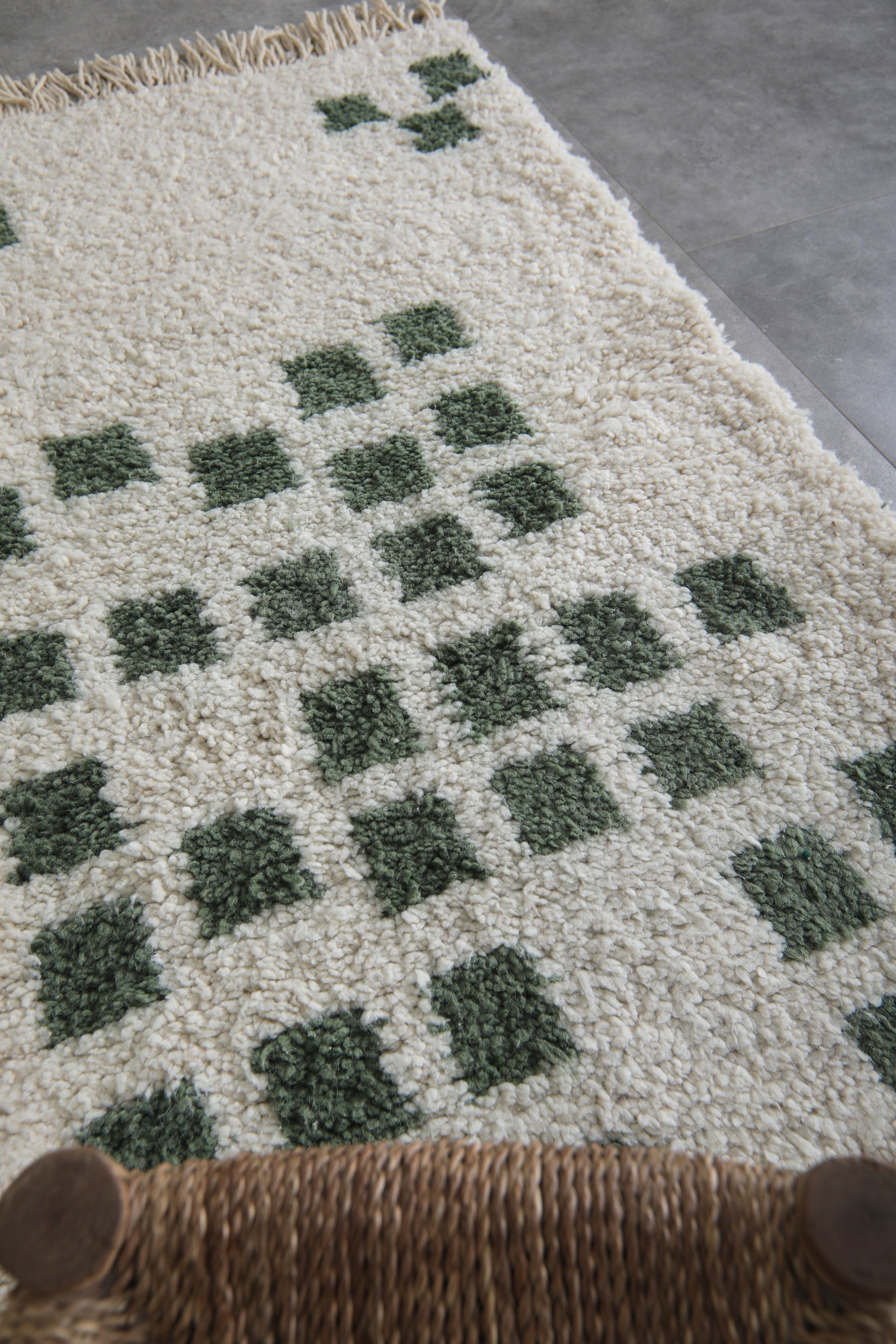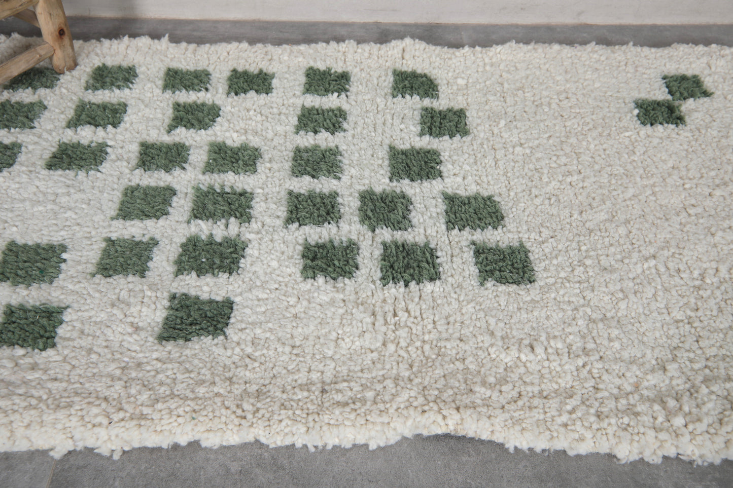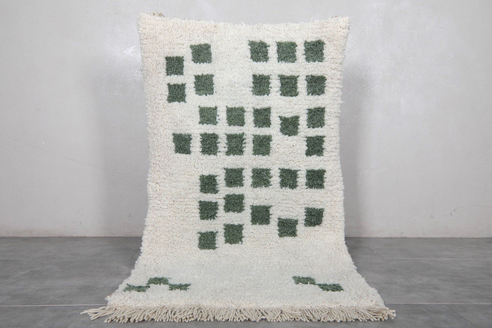 Add a touch of Moroccan elegance with this Green Pattern Beni Ourain Rug, measuring 2.8 x 5 feet (88 CM x 154 CM). Handwoven by skilled artisans, this wool rug features a modern green geometric design on a creamy white backdrop, blending contemporary style with traditional craftsmanship. Perfect for small spaces such as entryways, offices, or as a statement rug in any room. Its soft texture and minimalist design make it an ideal accent for modern or rustic interiors. Upgrade your décor with this timeless Moroccan treasure!