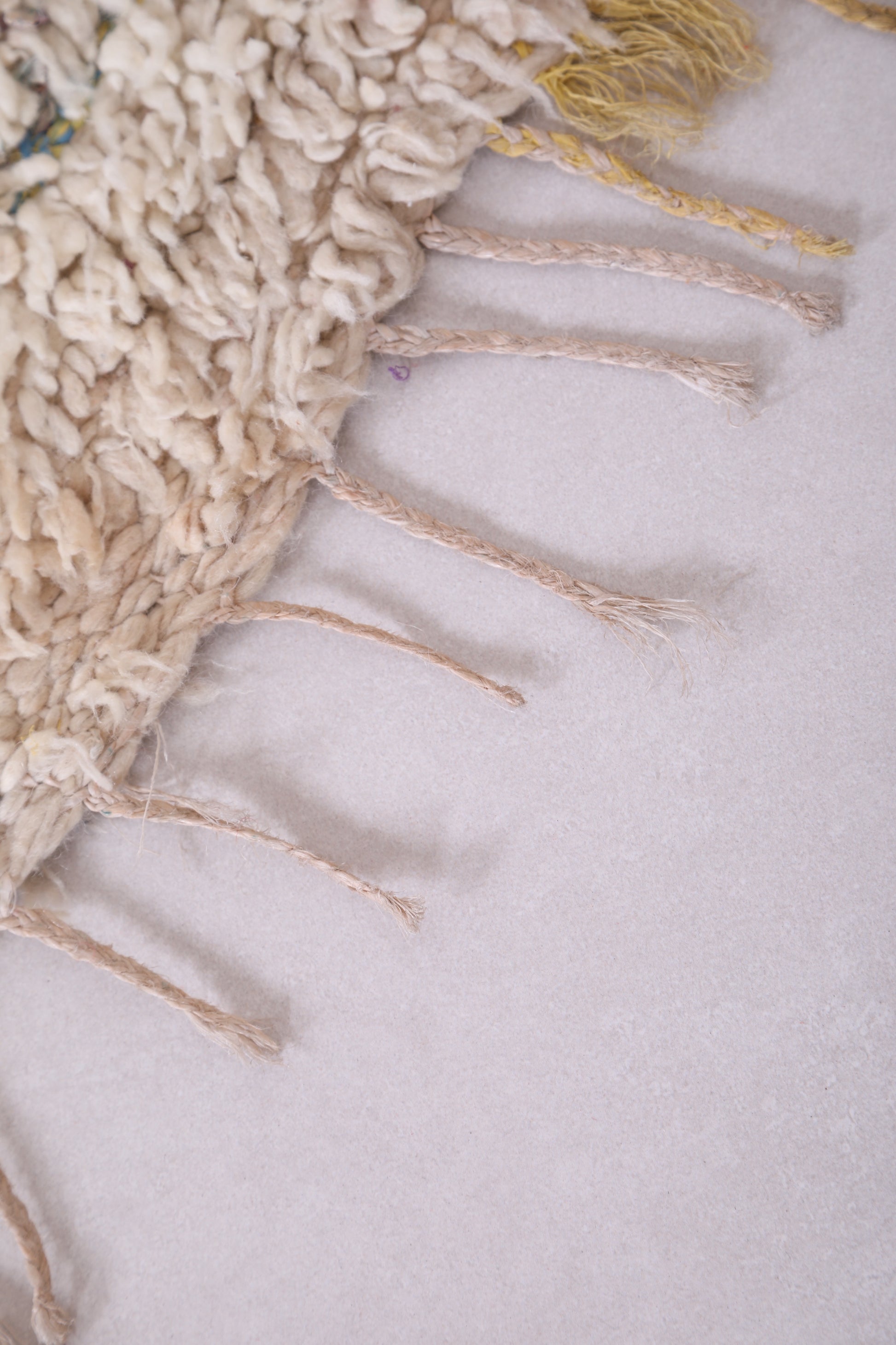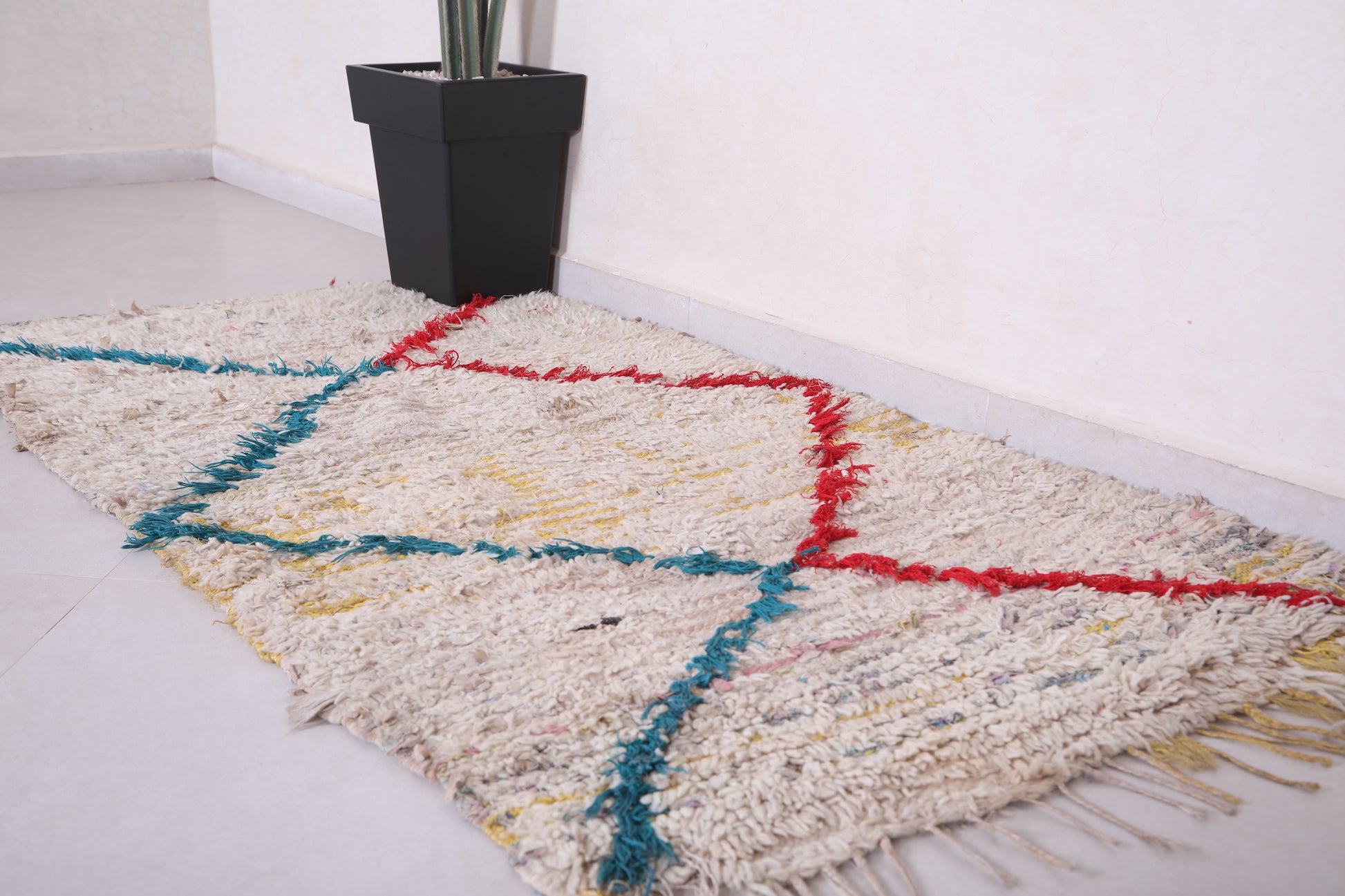 This 3.2 x 5.8 feet Moroccan rug features a minimalist design with bold colorful accents in red, blue, and yellow, creating a vibrant contrast against the neutral background. Handwoven with care, this rug blends traditional craftsmanship with a contemporary feel, making it a perfect statement piece for entryways, living rooms, or small spaces. Its soft texture and unique design enhance both modern and rustic interiors.
