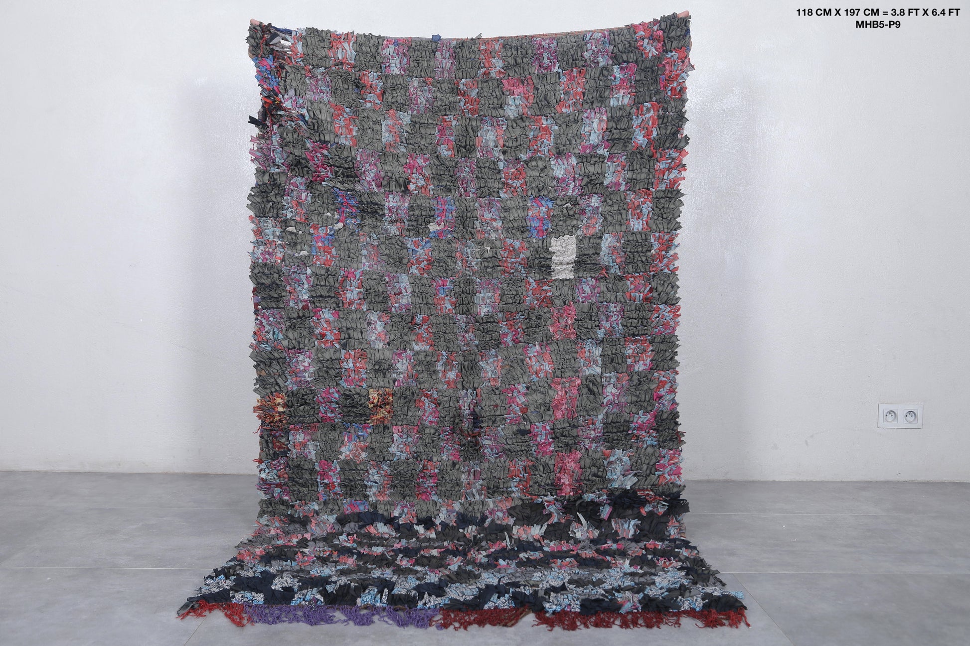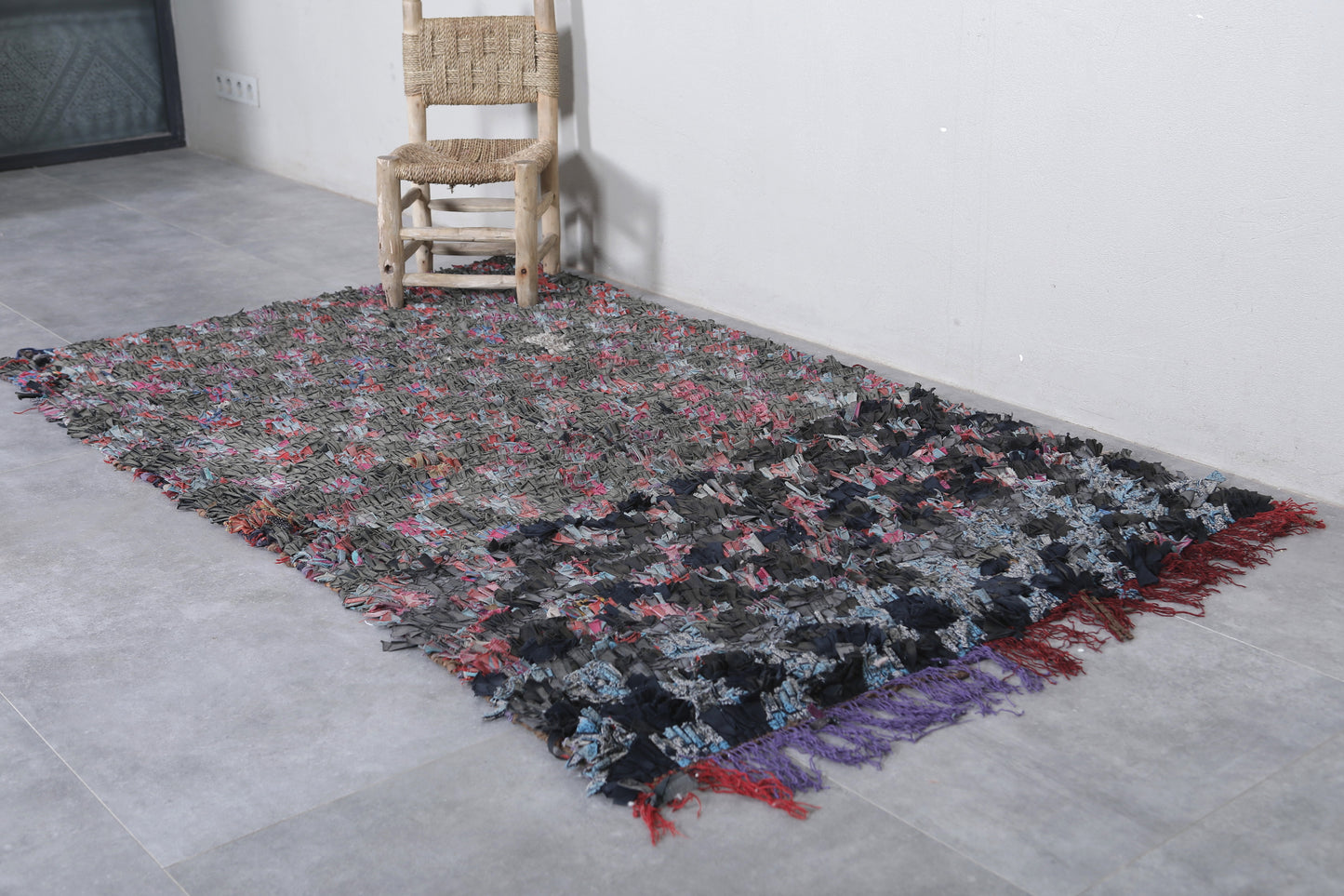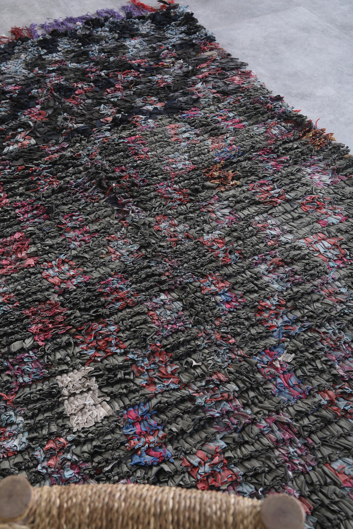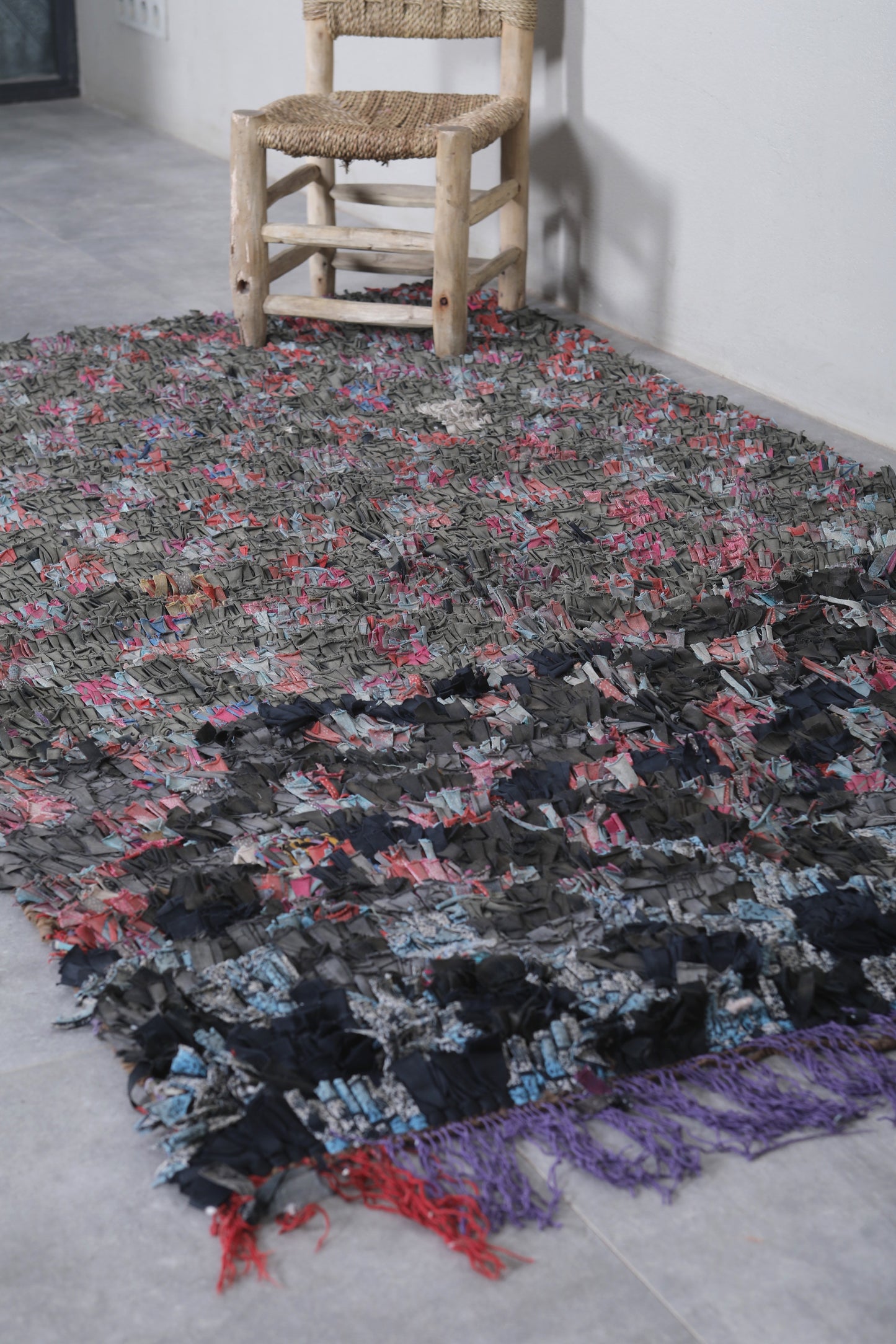 Discover the charm of this Moroccan rug featuring a captivating patchwork design with vibrant accents. The rug boasts a rich gray base interwoven with pops of red, blue, and purple, creating a striking visual appeal. Handmade with recycled fabric, it embodies sustainability and traditional craftsmanship. Measuring 3.8 x 6.4 feet, this piece is perfect for adding a unique touch to your living room, bedroom, or office. Its texture and dynamic color palette bring a cozy and artistic vibe to any space.