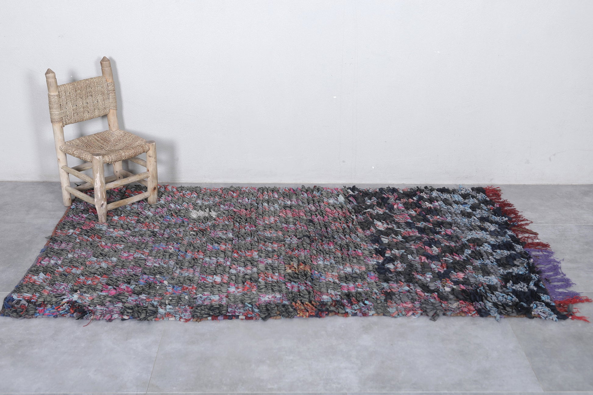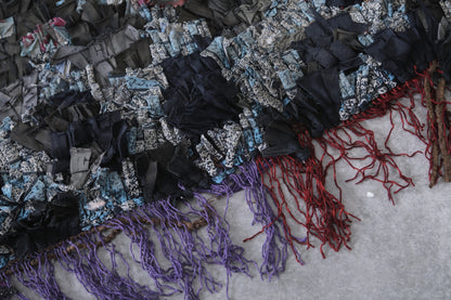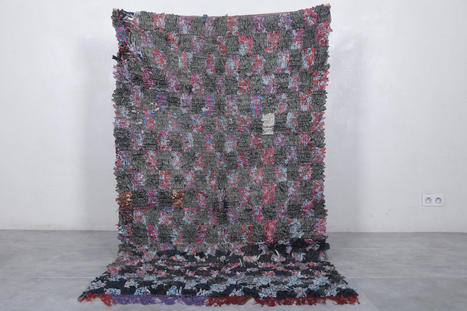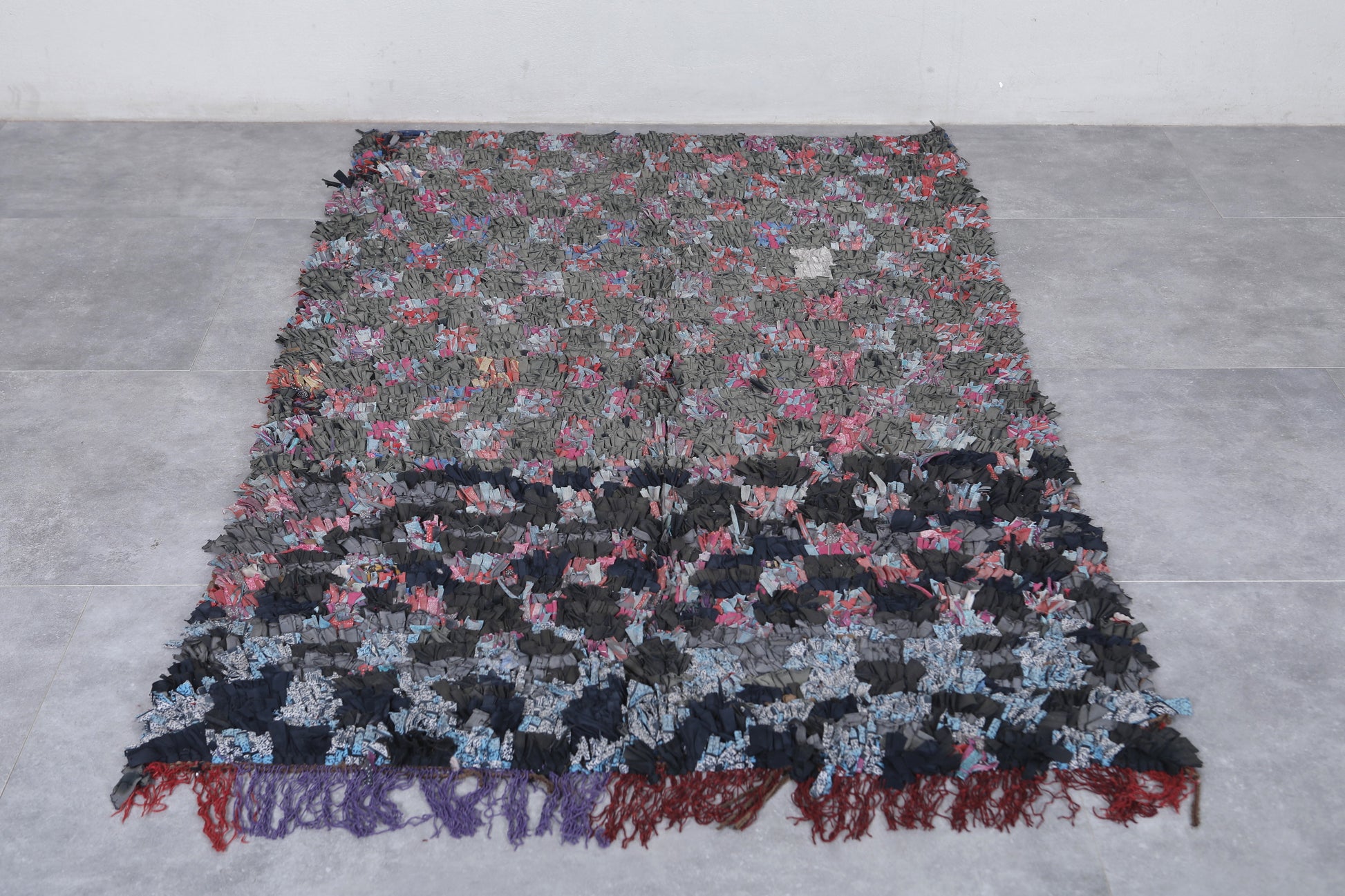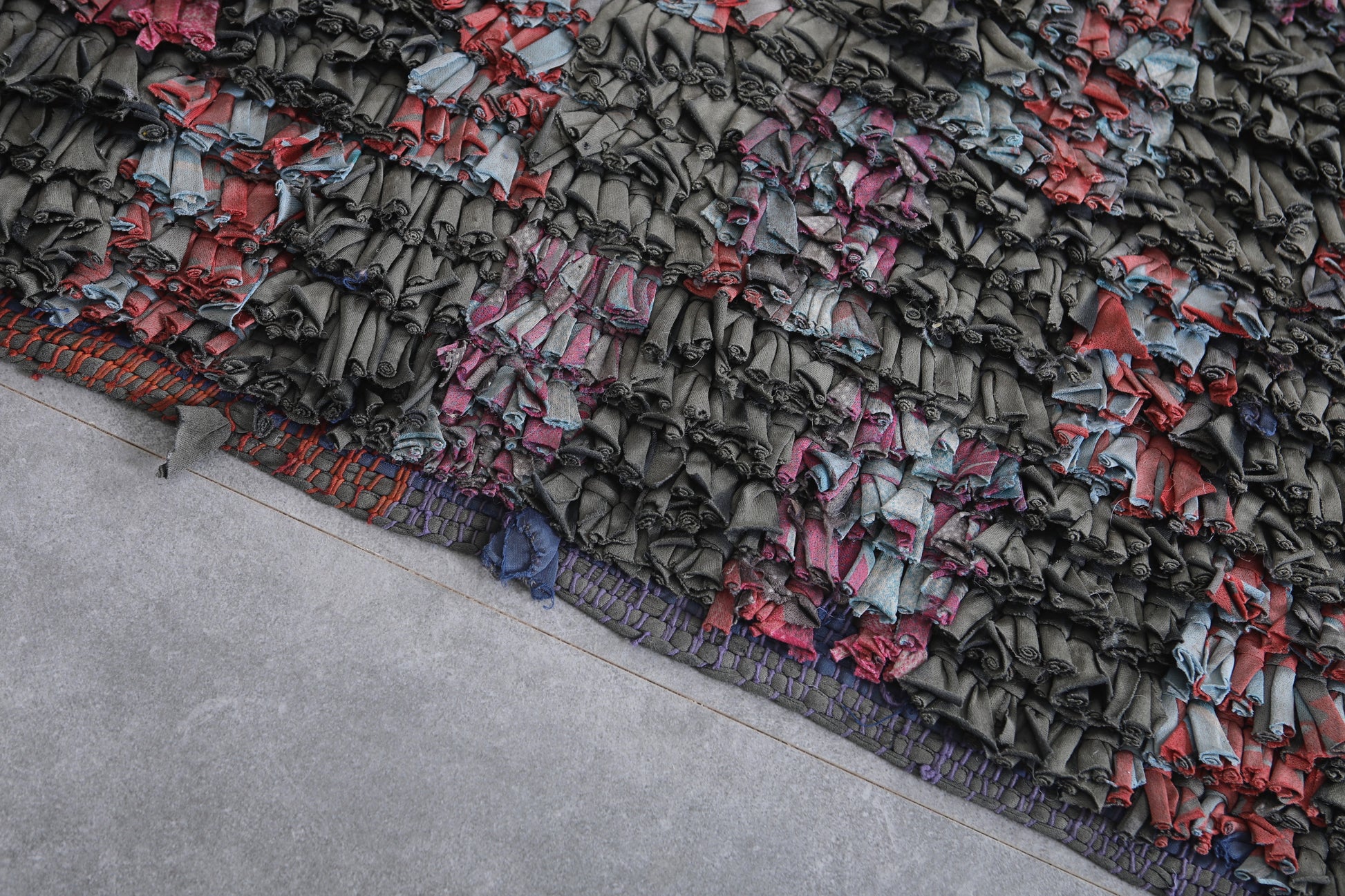 Discover the charm of this Moroccan rug featuring a captivating patchwork design with vibrant accents. The rug boasts a rich gray base interwoven with pops of red, blue, and purple, creating a striking visual appeal. Handmade with recycled fabric, it embodies sustainability and traditional craftsmanship. Measuring 3.8 x 6.4 feet, this piece is perfect for adding a unique touch to your living room, bedroom, or office. Its texture and dynamic color palette bring a cozy and artistic vibe to any space.