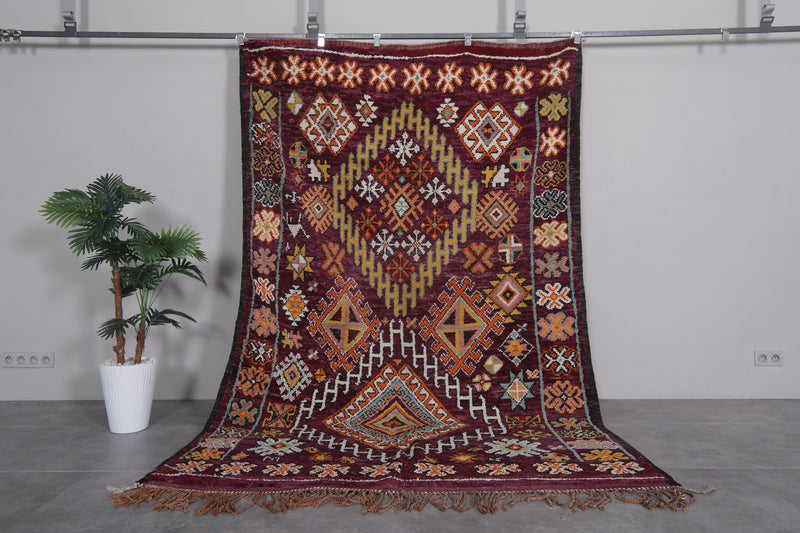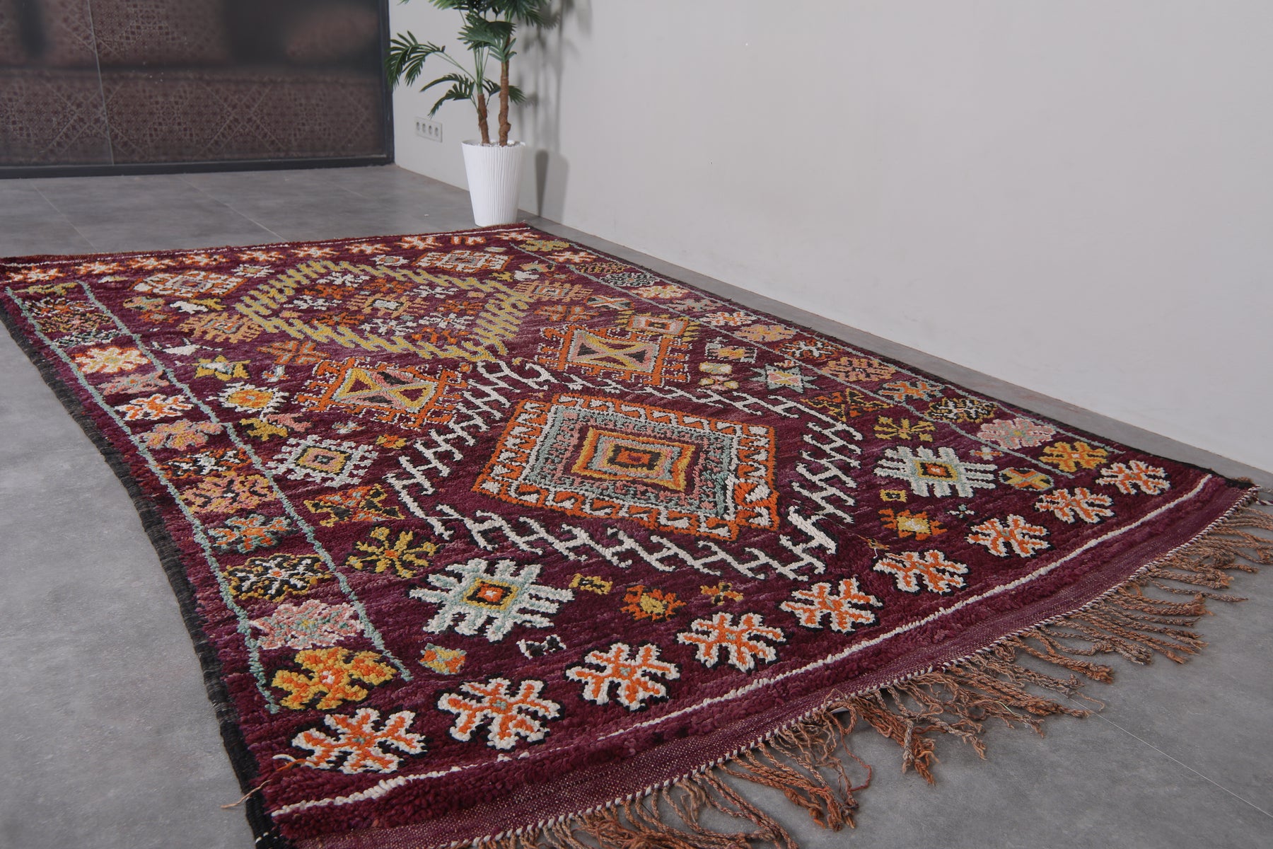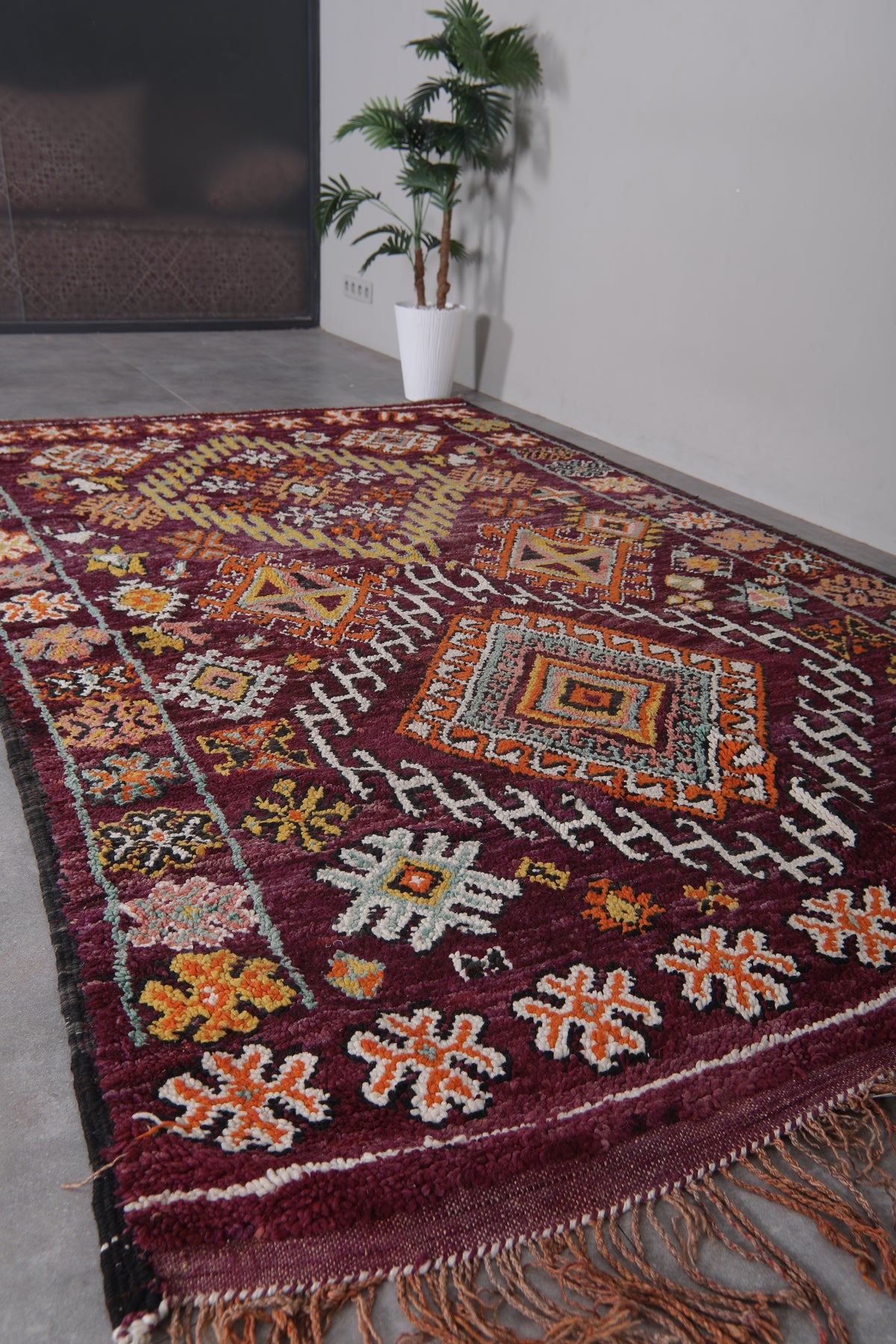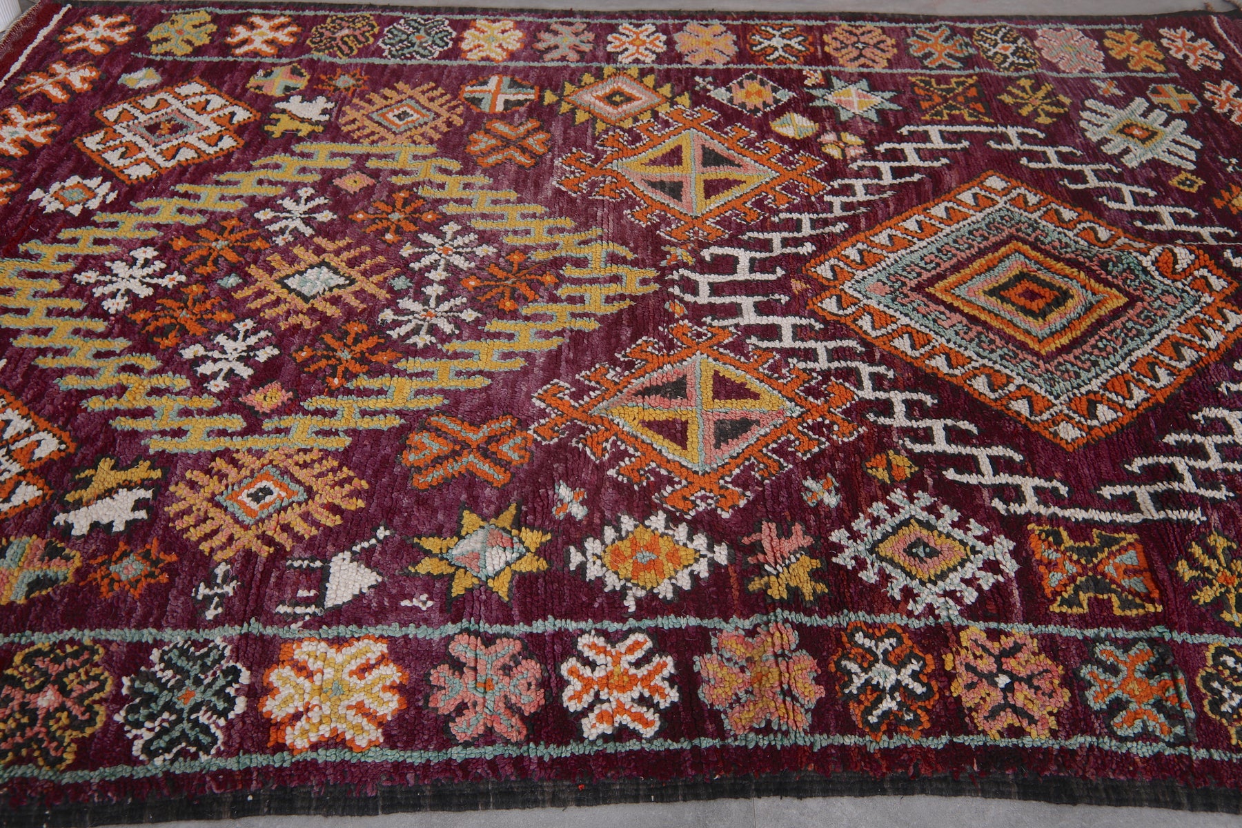 Add timeless elegance to your space with this 6.1 x 9.4 feet Moroccan rug. Its vibrant burgundy background is adorned with intricate geometric patterns, diamond motifs, and traditional Berber symbols in rich hues of orange, yellow, and white.