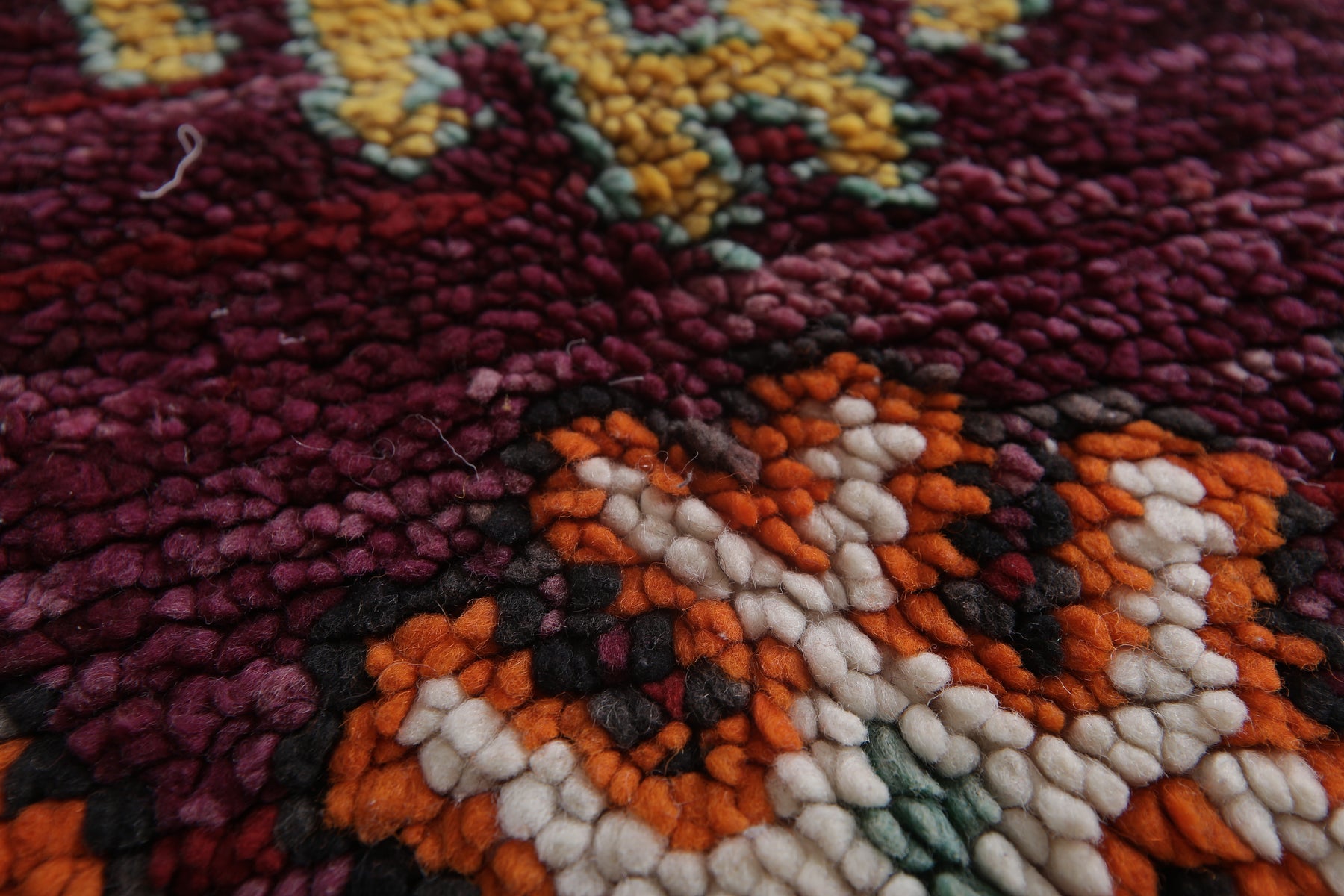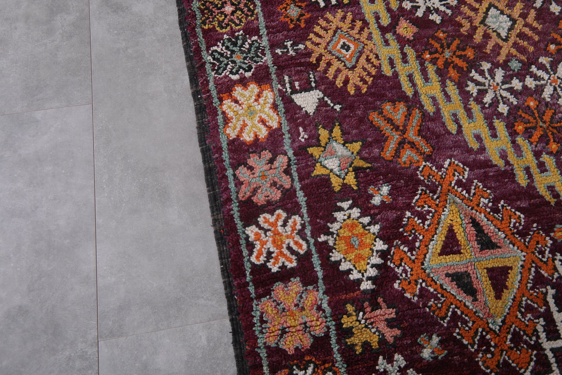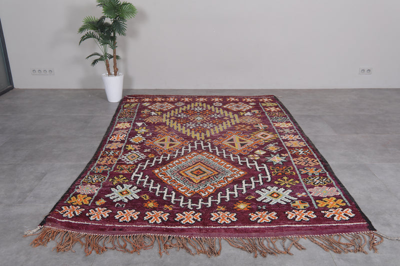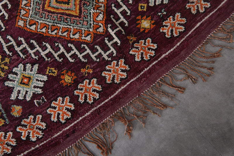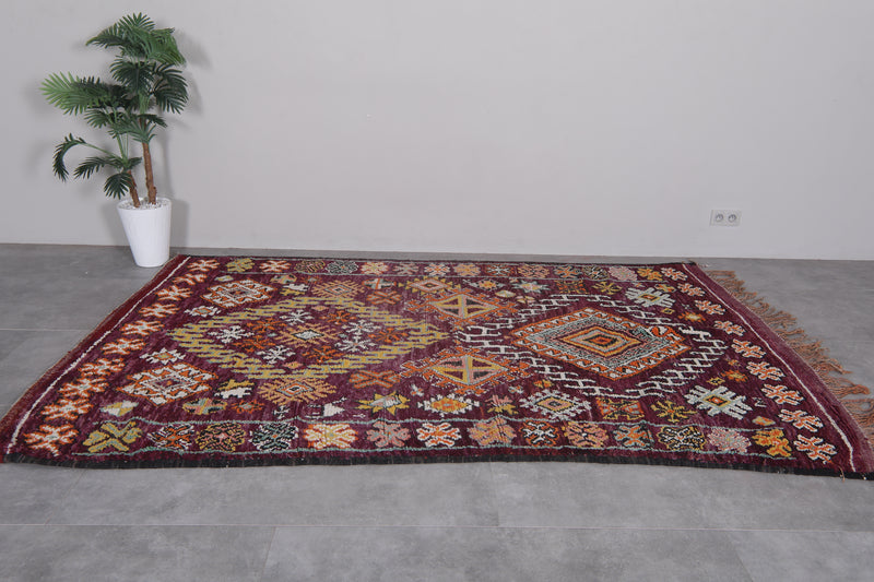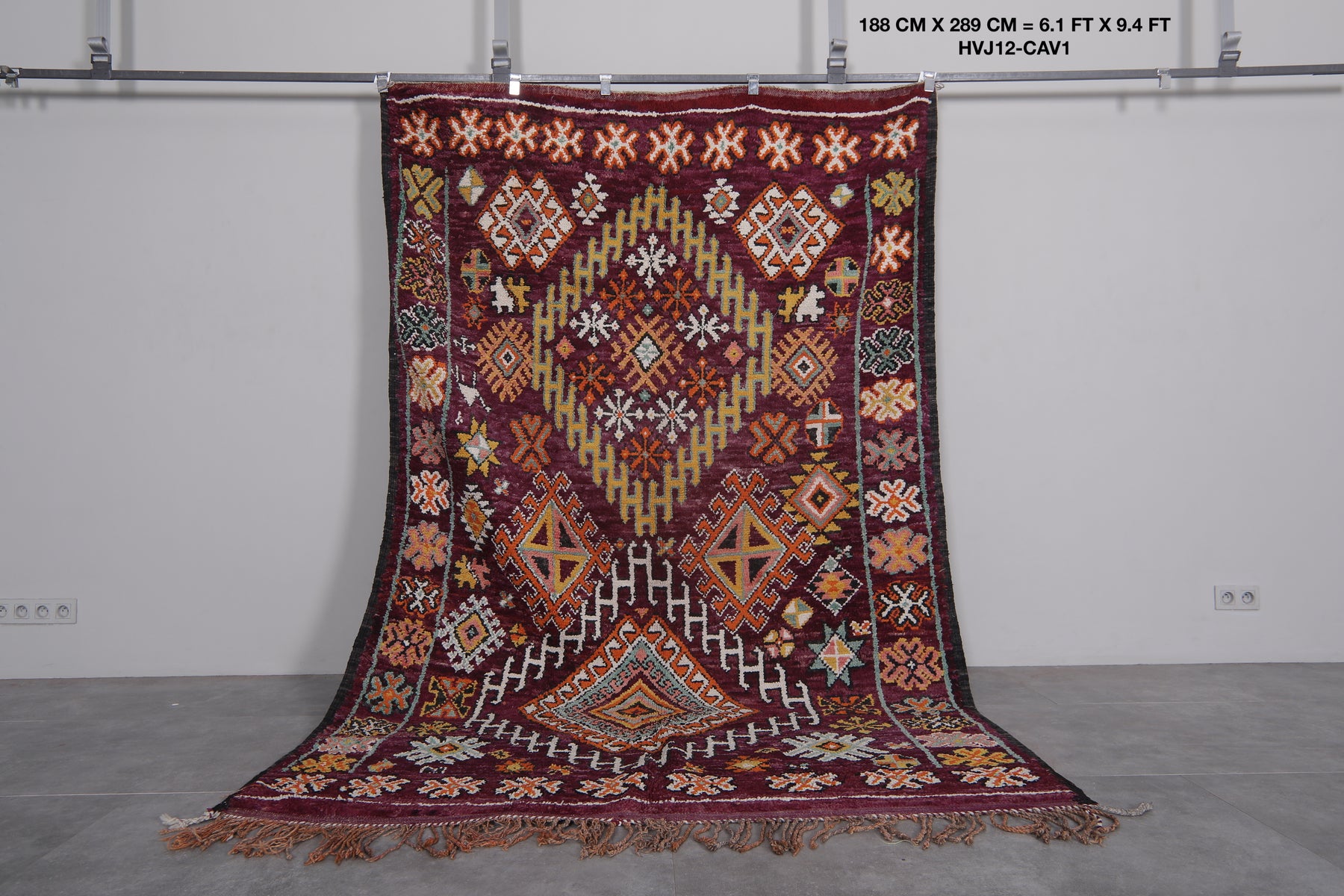 Add timeless elegance to your space with this 6.1 x 9.4 feet Moroccan rug. Its vibrant burgundy background is adorned with intricate geometric patterns, diamond motifs, and traditional Berber symbols in rich hues of orange, yellow, and white.