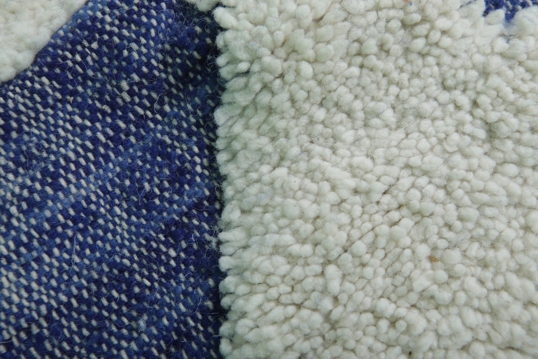 This 5.3 x 9.1 feet Moroccan rug is a bold artistic masterpiece, featuring an abstract blue and white geometric design. A fusion of modern expression and traditional craftsmanship, it makes a striking statement in living rooms, bedrooms, or office spaces.