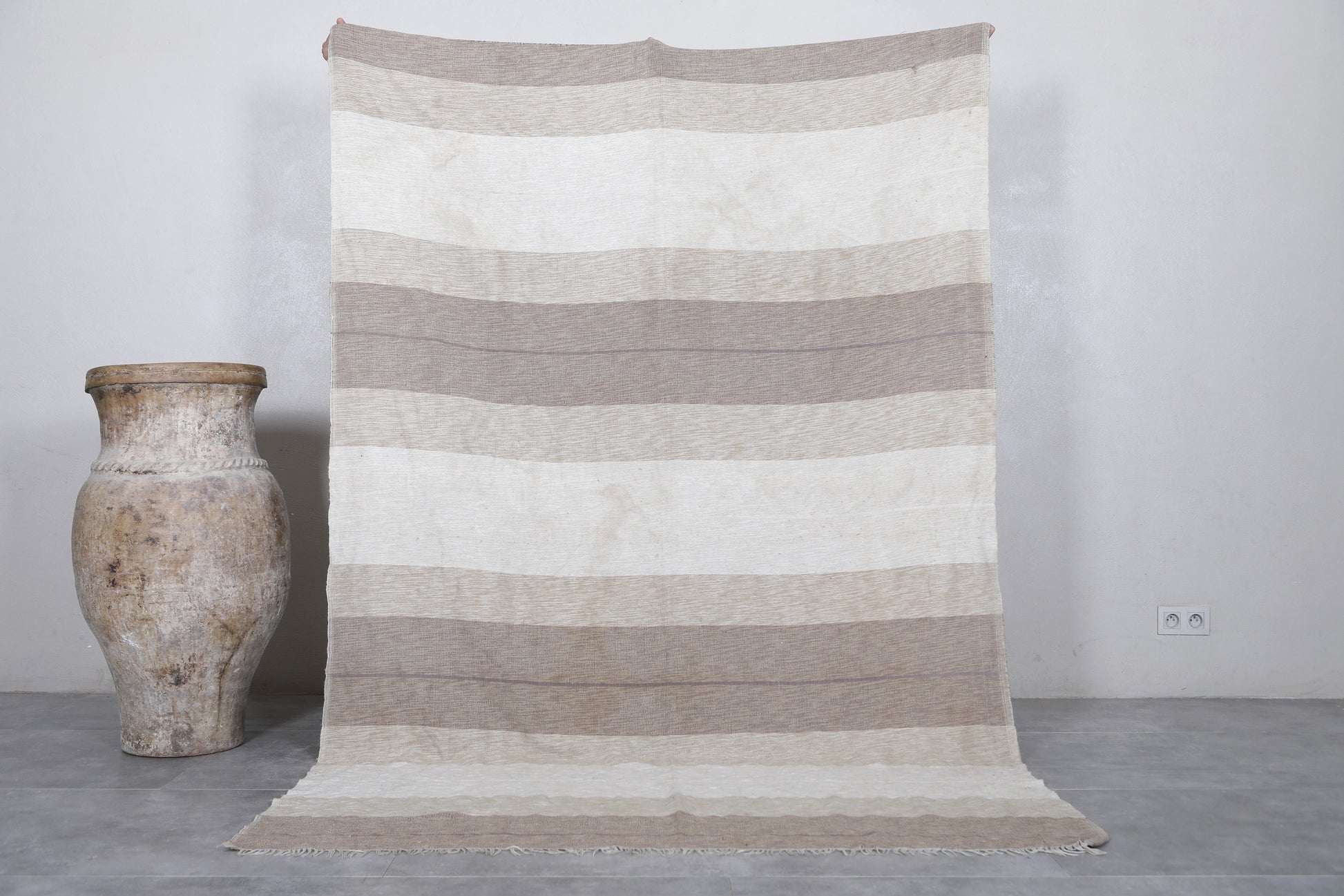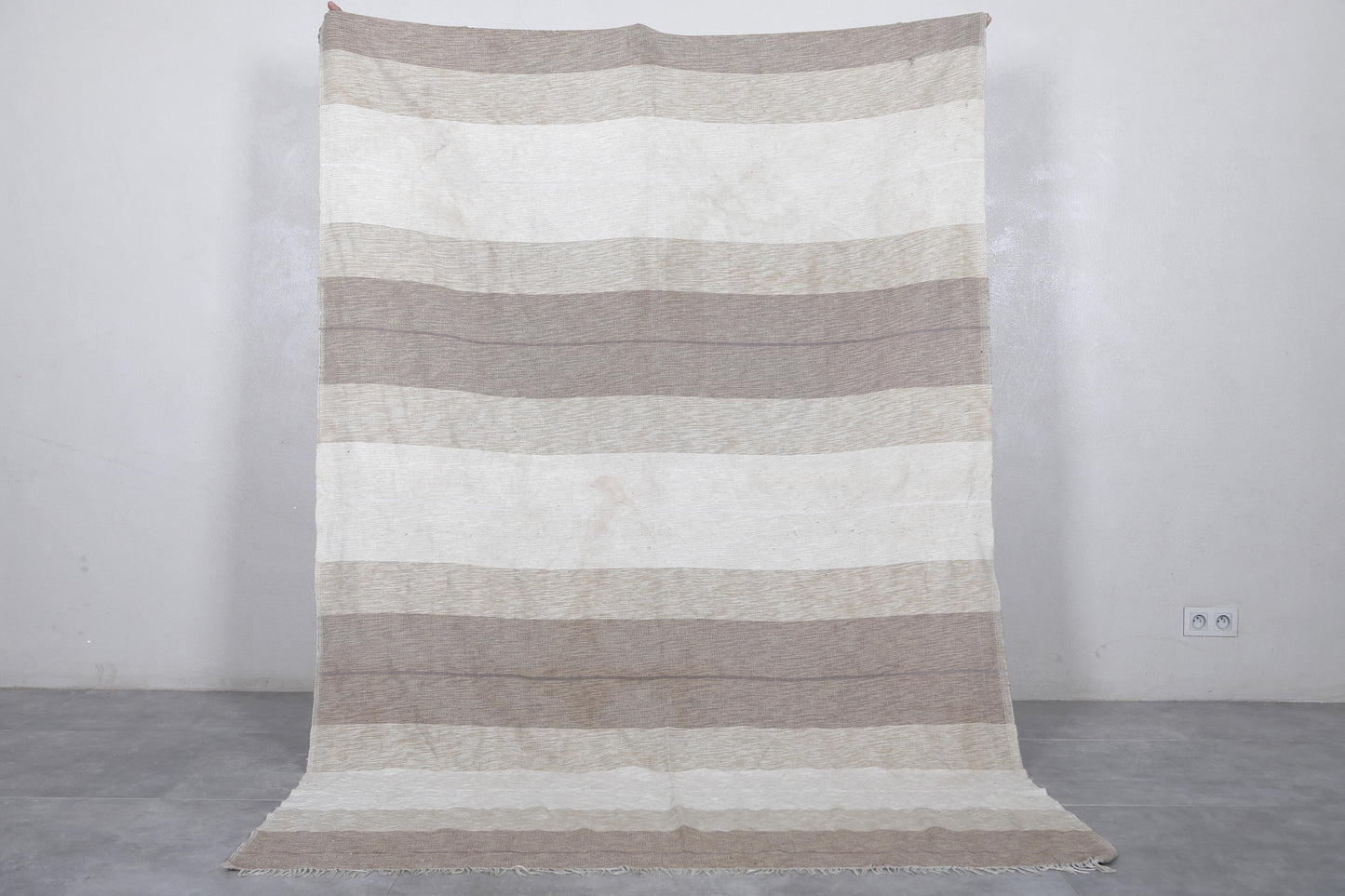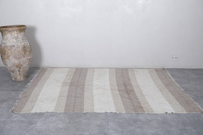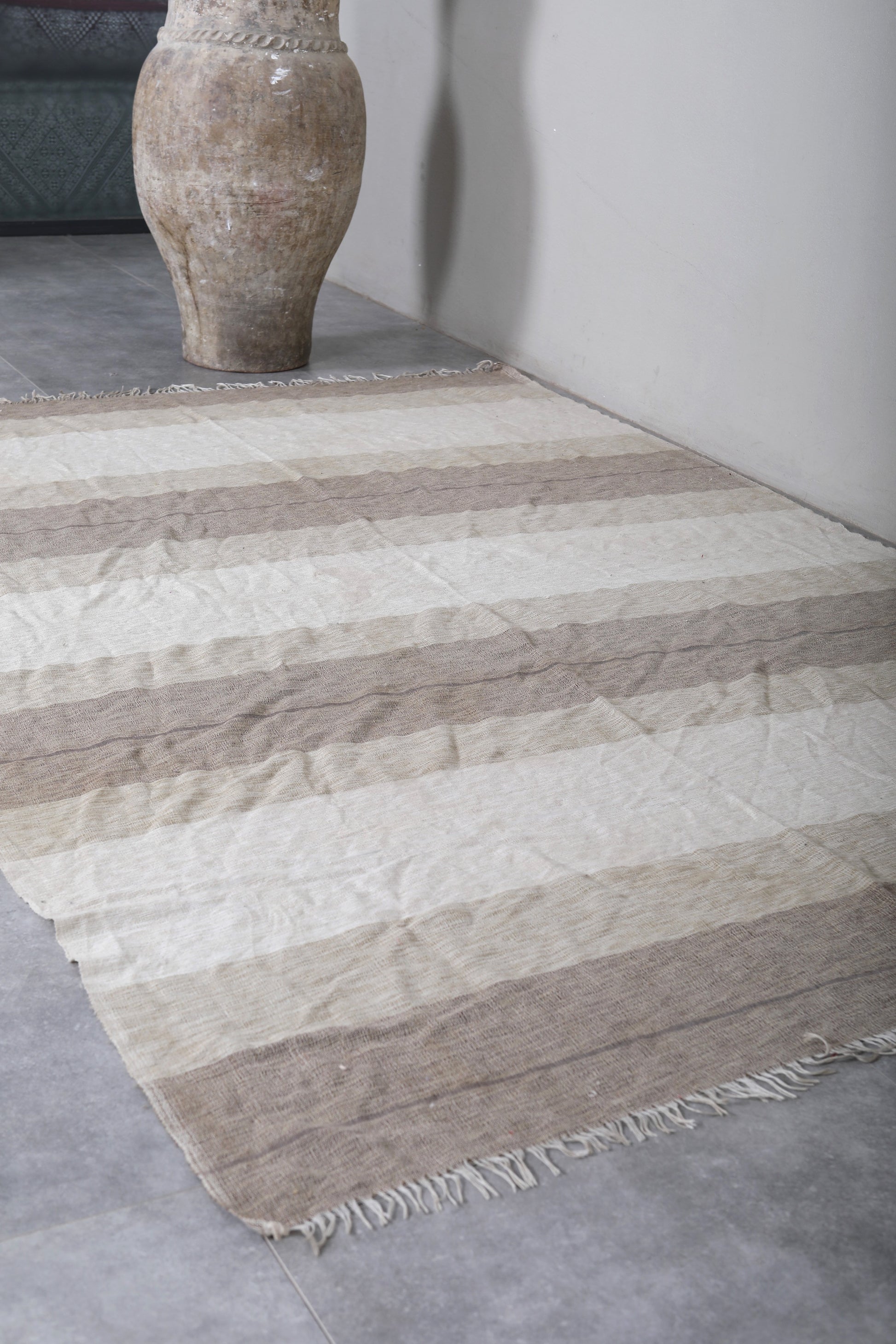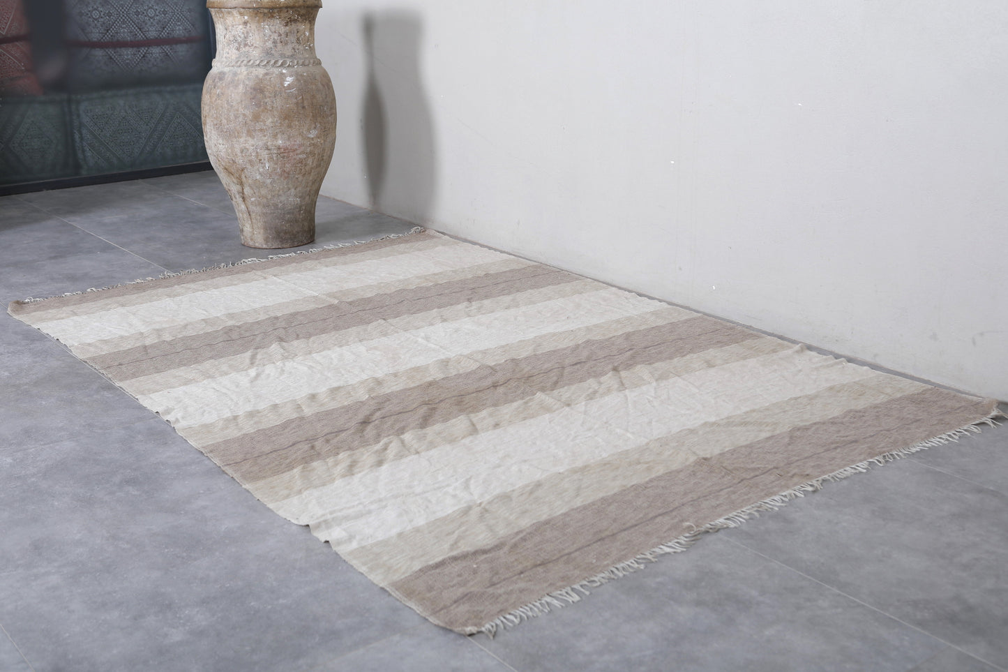 This 5.4 x 8.2 feet handwoven Moroccan wool rug features neutral stripes in beige and cream tones, offering a versatile and elegant touch to any space. Its timeless design adds warmth and sophistication to living rooms, bedrooms, or dining areas.