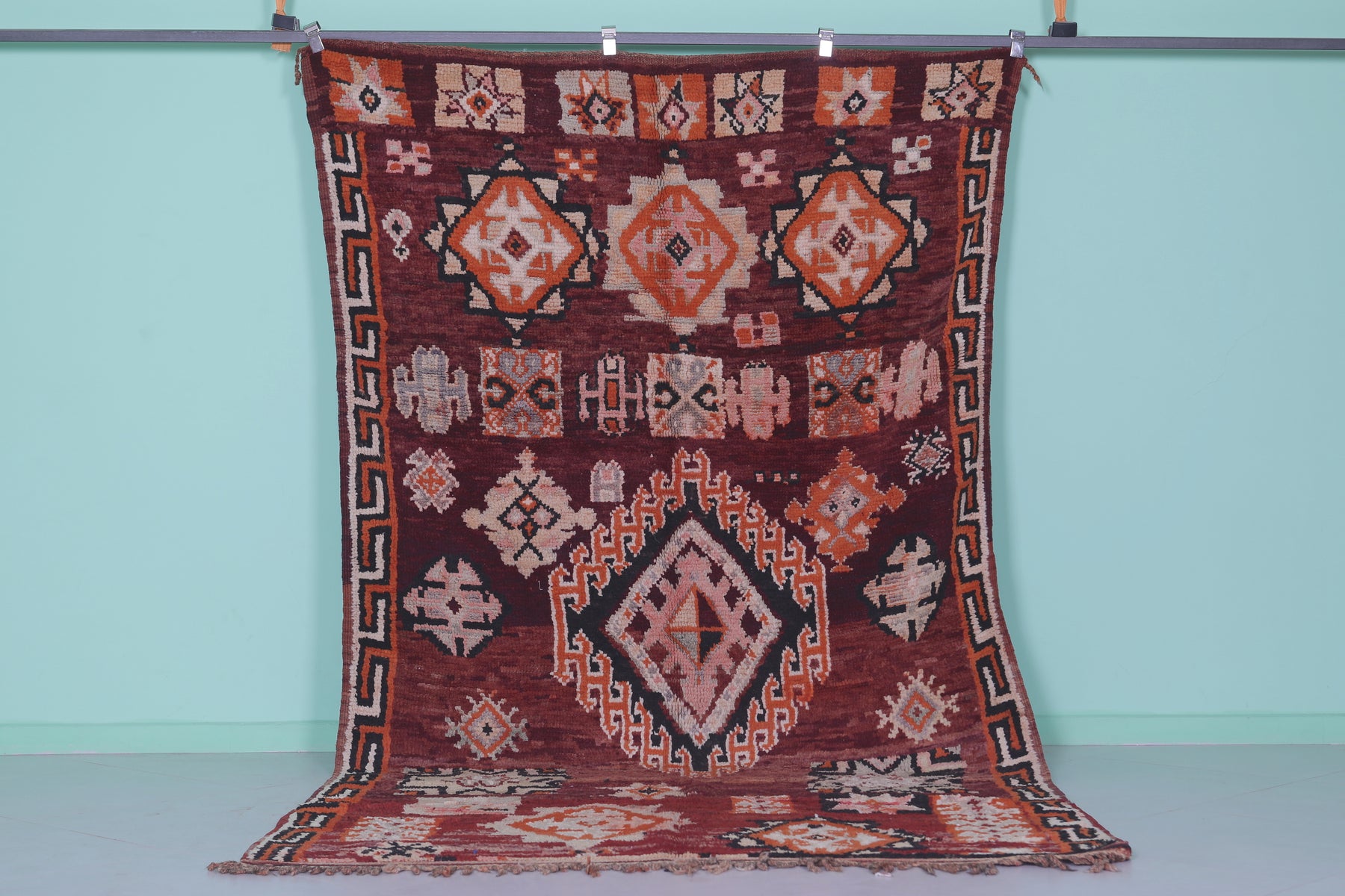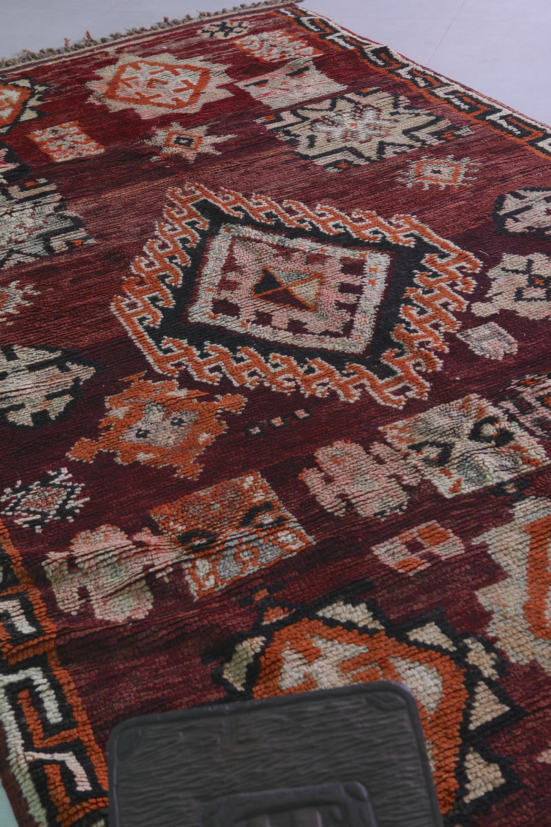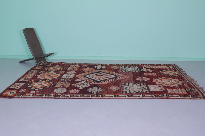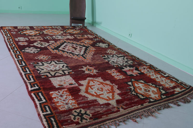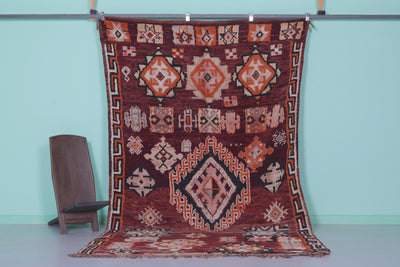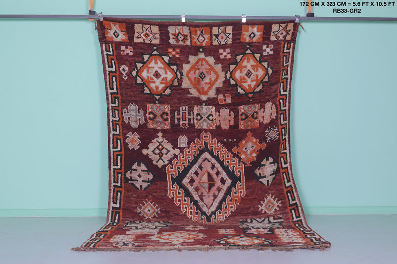 Elevate your home with this handmade Berber Moroccan rug, measuring 5.6 FT x 10.5 FT. Featuring bold geometric designs, including central diamond medallions and intricate tribal motifs, this rug is a stunning display of Moroccan artistry. Handwoven from premium natural fibers, it offers exceptional warmth, texture, and durability. Perfect for bohemian, vintage, or modern interiors, this rug adds sophistication and depth to any space.