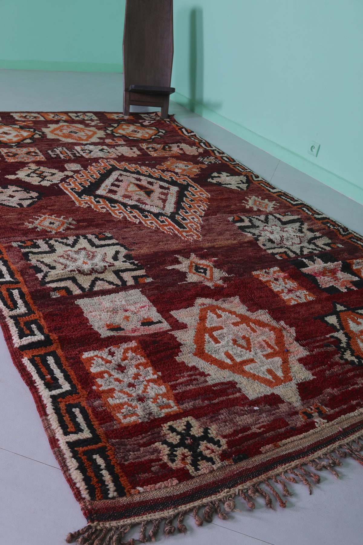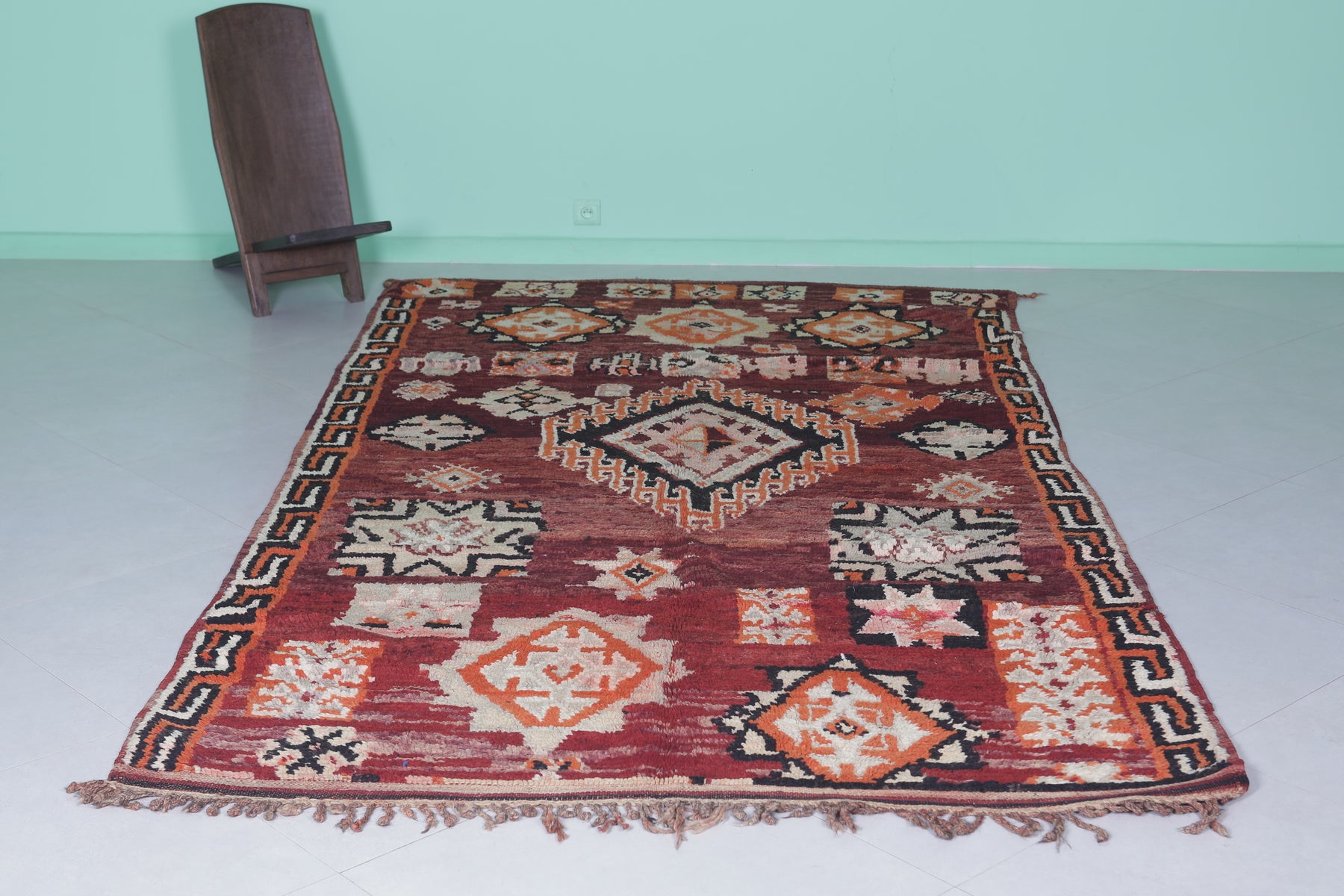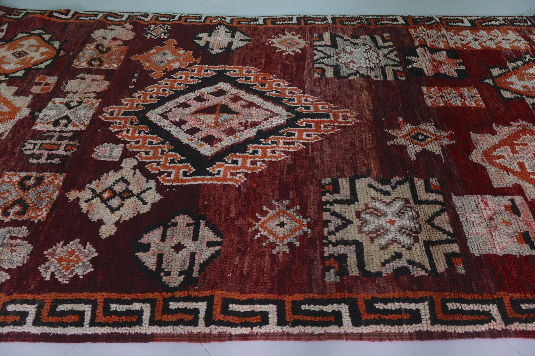 Elevate your home with this handmade Berber Moroccan rug, measuring 5.6 FT x 10.5 FT. Featuring bold geometric designs, including central diamond medallions and intricate tribal motifs, this rug is a stunning display of Moroccan artistry. Handwoven from premium natural fibers, it offers exceptional warmth, texture, and durability. Perfect for bohemian, vintage, or modern interiors, this rug adds sophistication and depth to any space.
