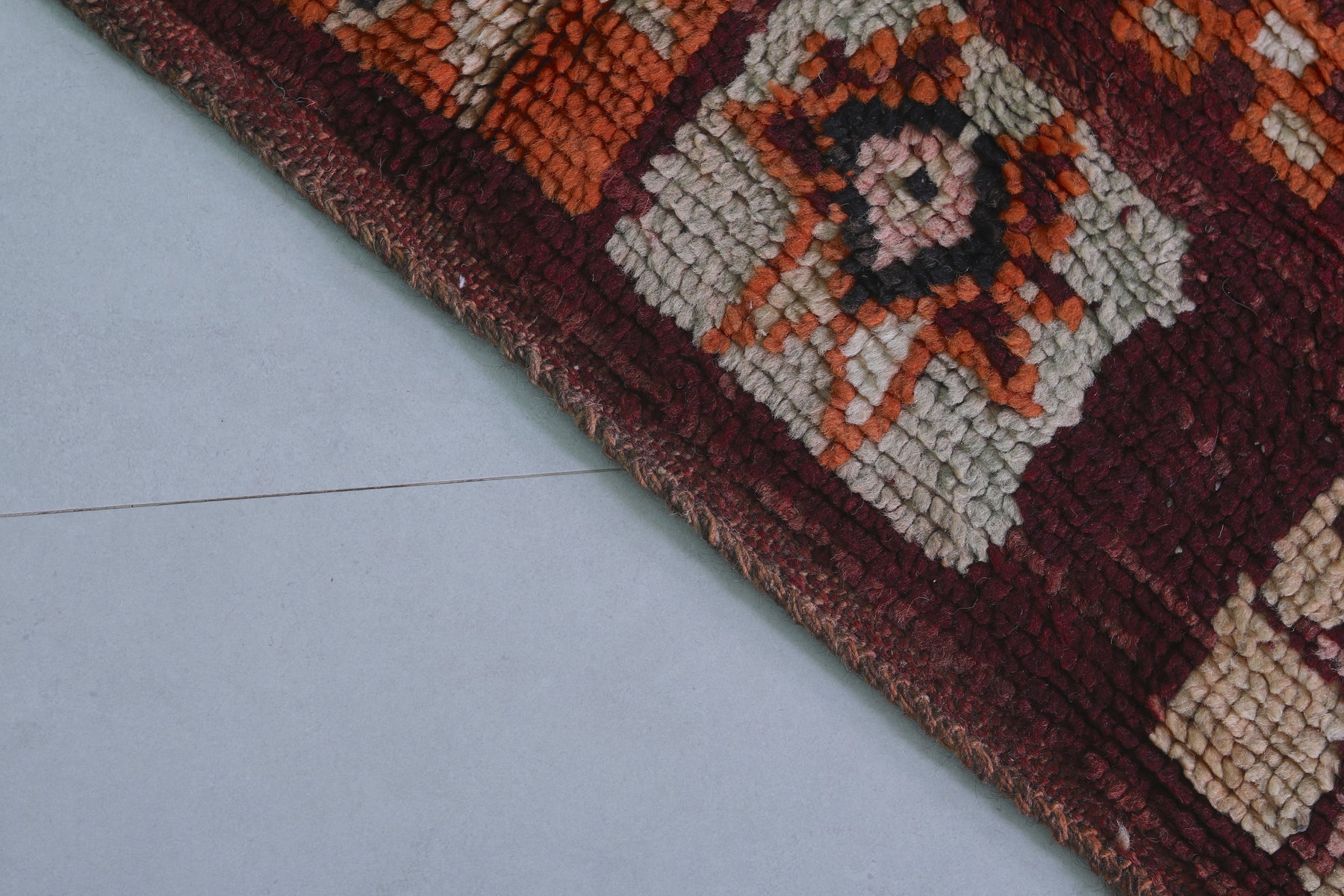 Rich earthy tones of deep burgundy, burnt orange, and black
