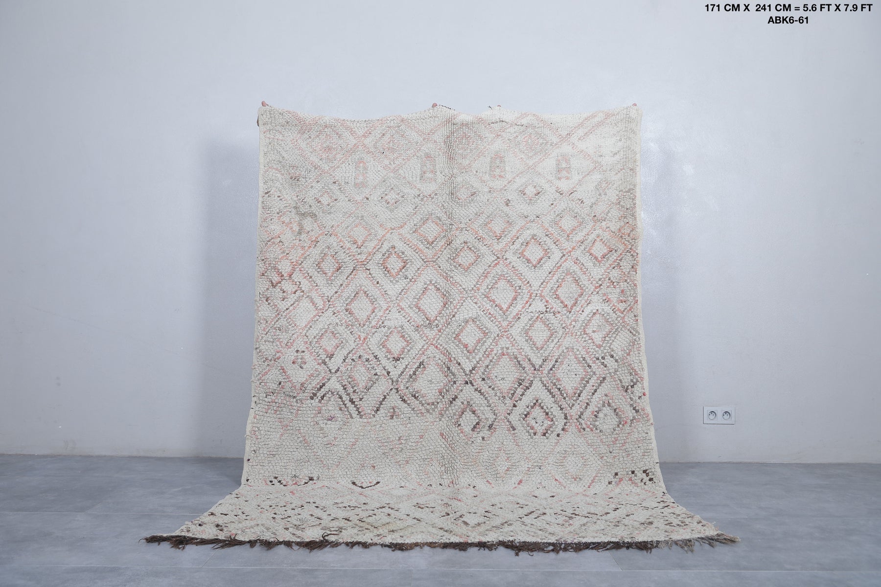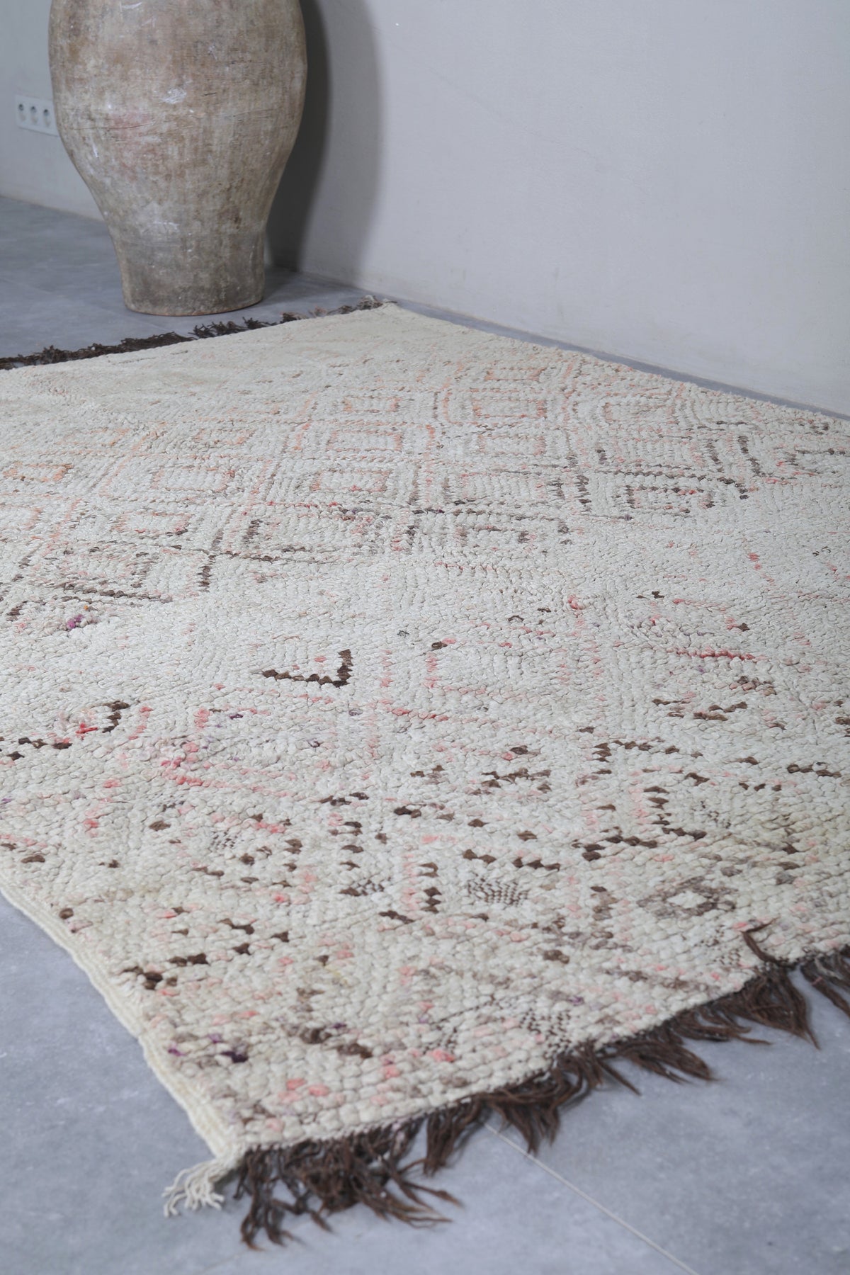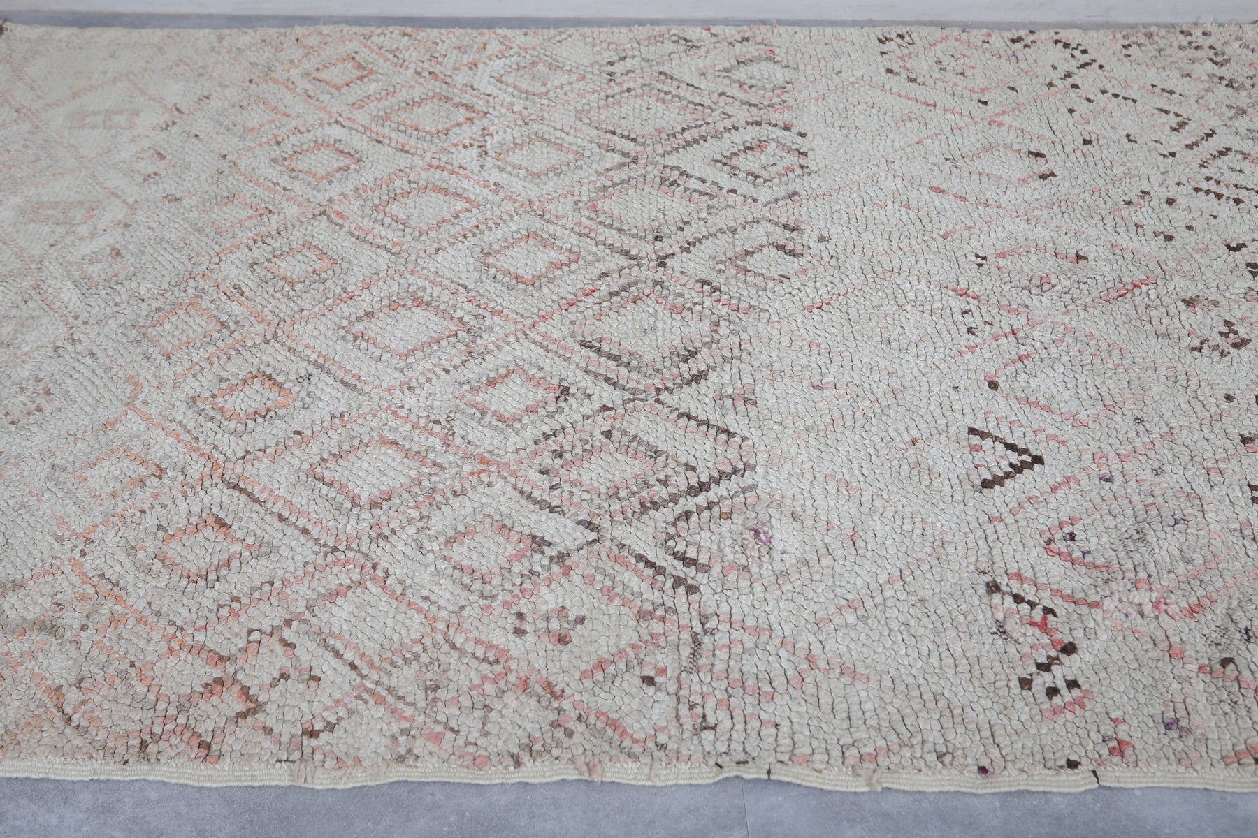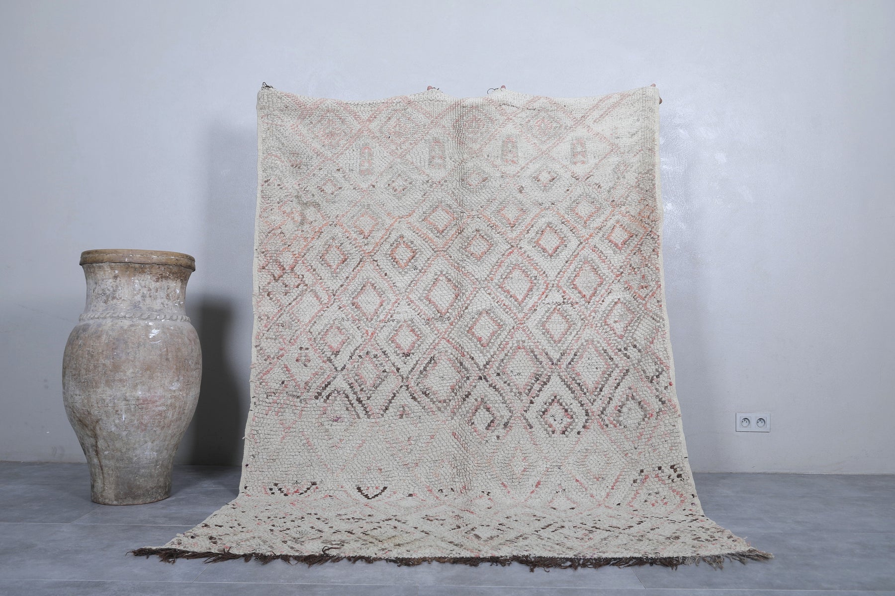 Transform your space with this vintage Moroccan rug, featuring an intricate diamond pattern that exudes timeless elegance. Soft cream tones are delicately accented with subtle hints of blush and earthy hues, creating a versatile palette that complements various décor styles. Handmade with traditional Berber craftsmanship, this 5.6 x 7.9-foot rug offers both durability and a luxurious, soft texture. Perfect for living rooms or bedrooms, it adds a sophisticated, cultural charm to any interior.