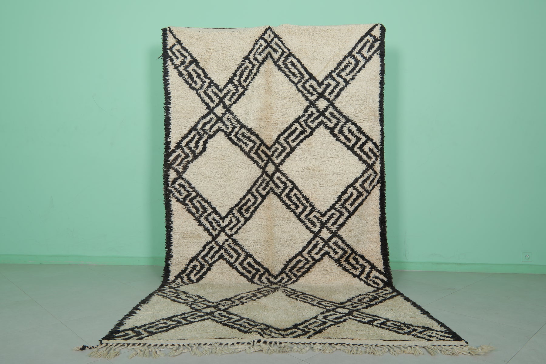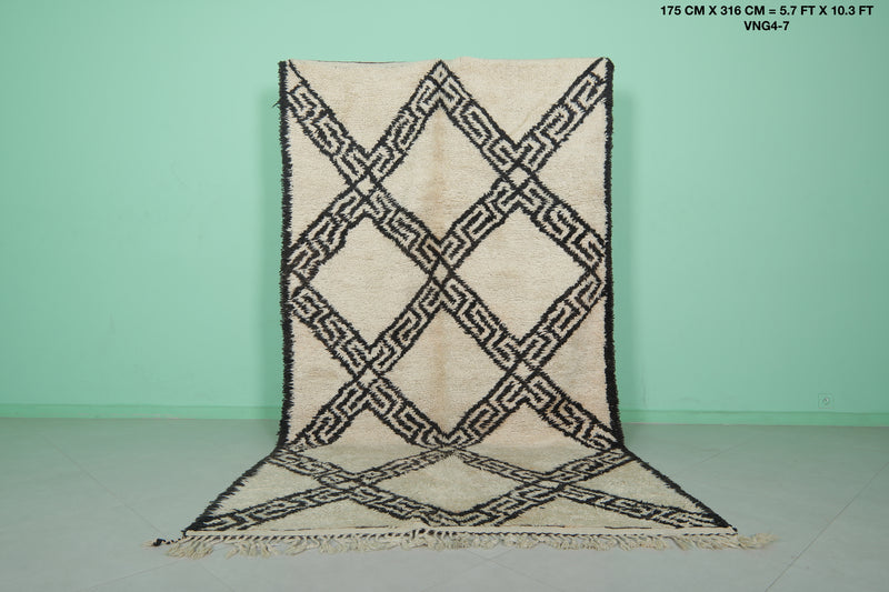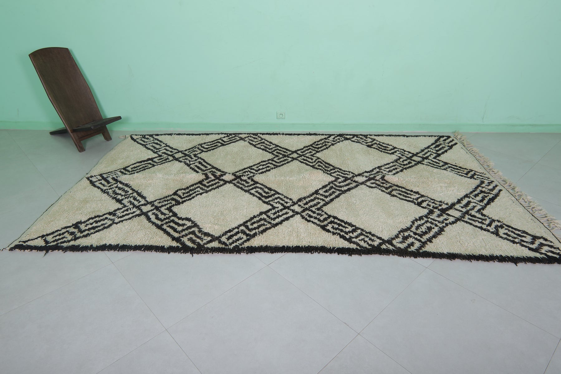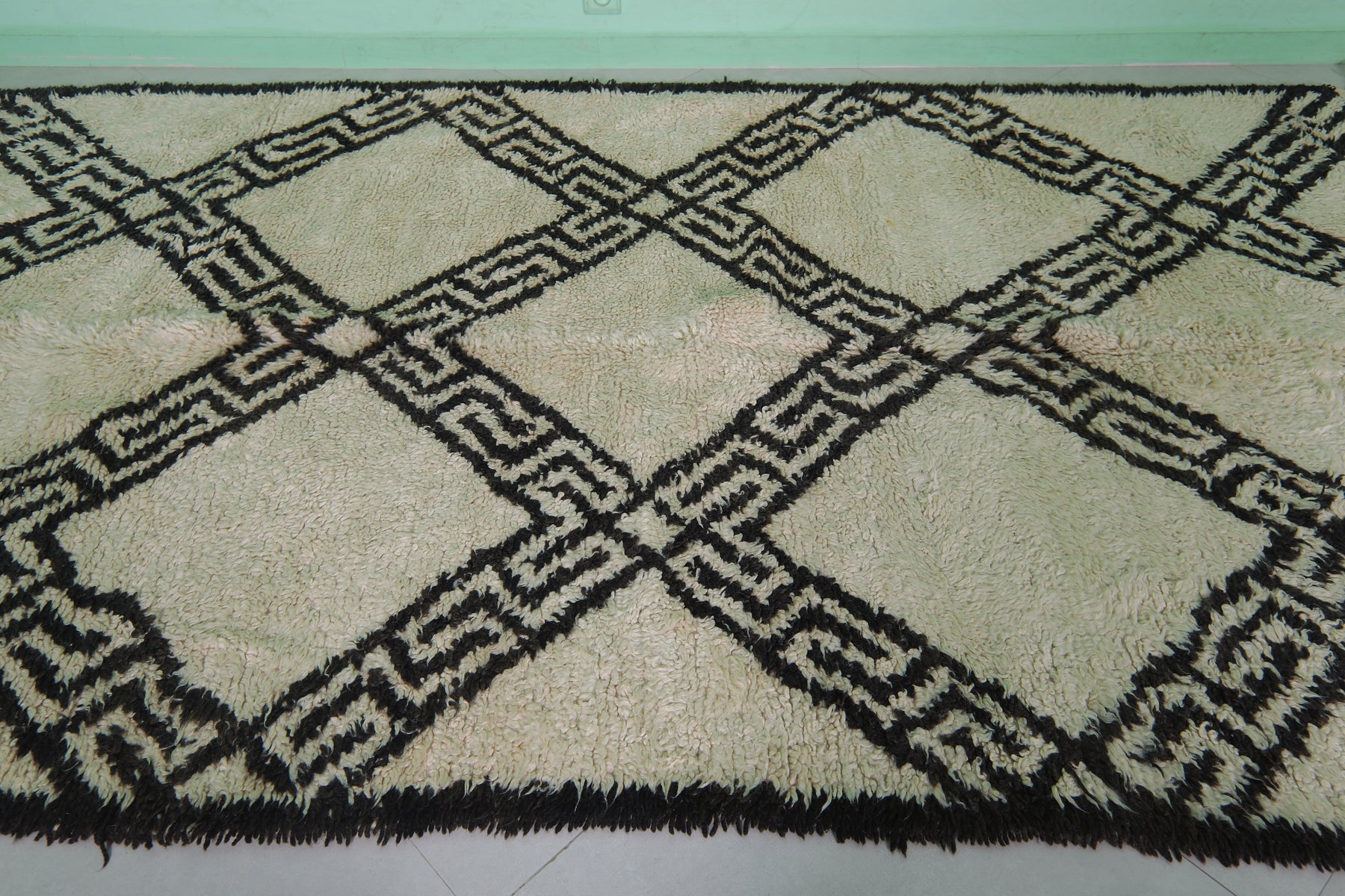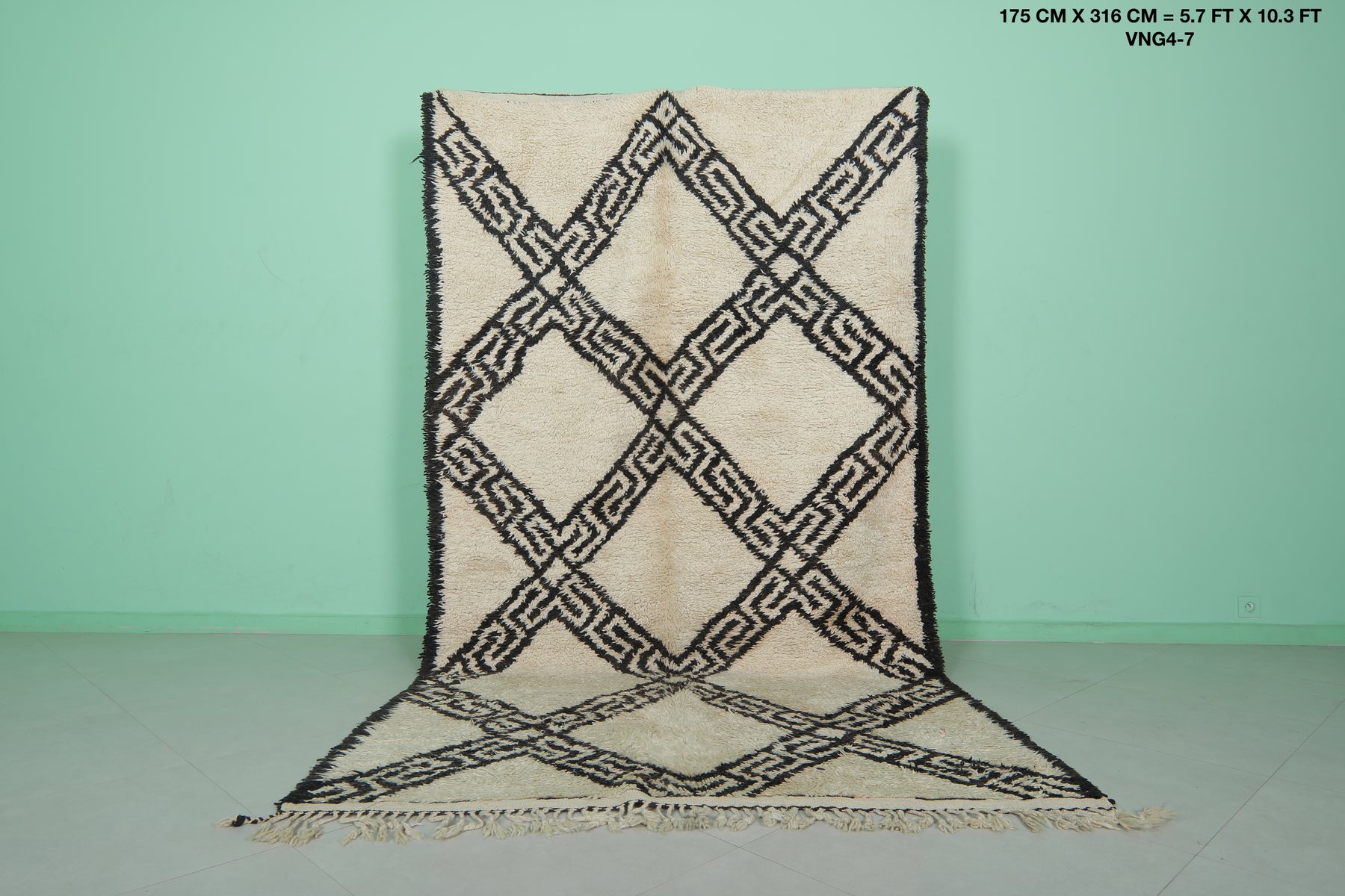 Bring bold elegance to your home with this Geometric Moroccan Rug, sized at 5.7 x 10.3 feet (175 CM x 316 CM). Featuring a striking black and white geometric design with a bold border, this handcrafted rug is a perfect fusion of traditional Moroccan artistry and contemporary style. Ideal for living rooms, bedrooms, or open spaces, it serves as a sophisticated focal point.