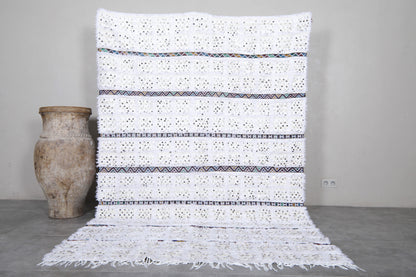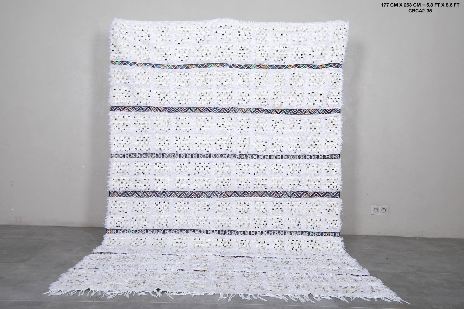 This 5.8 x 8.6 feet handmade Moroccan wedding blanket rug exudes bohemian charm with its intricate tribal patterns and shimmering sequins. Crafted from soft, premium-quality wool, this unique piece adds a radiant white elegance to any space, making it perfect for living rooms, bedrooms, or boho-chic décors.