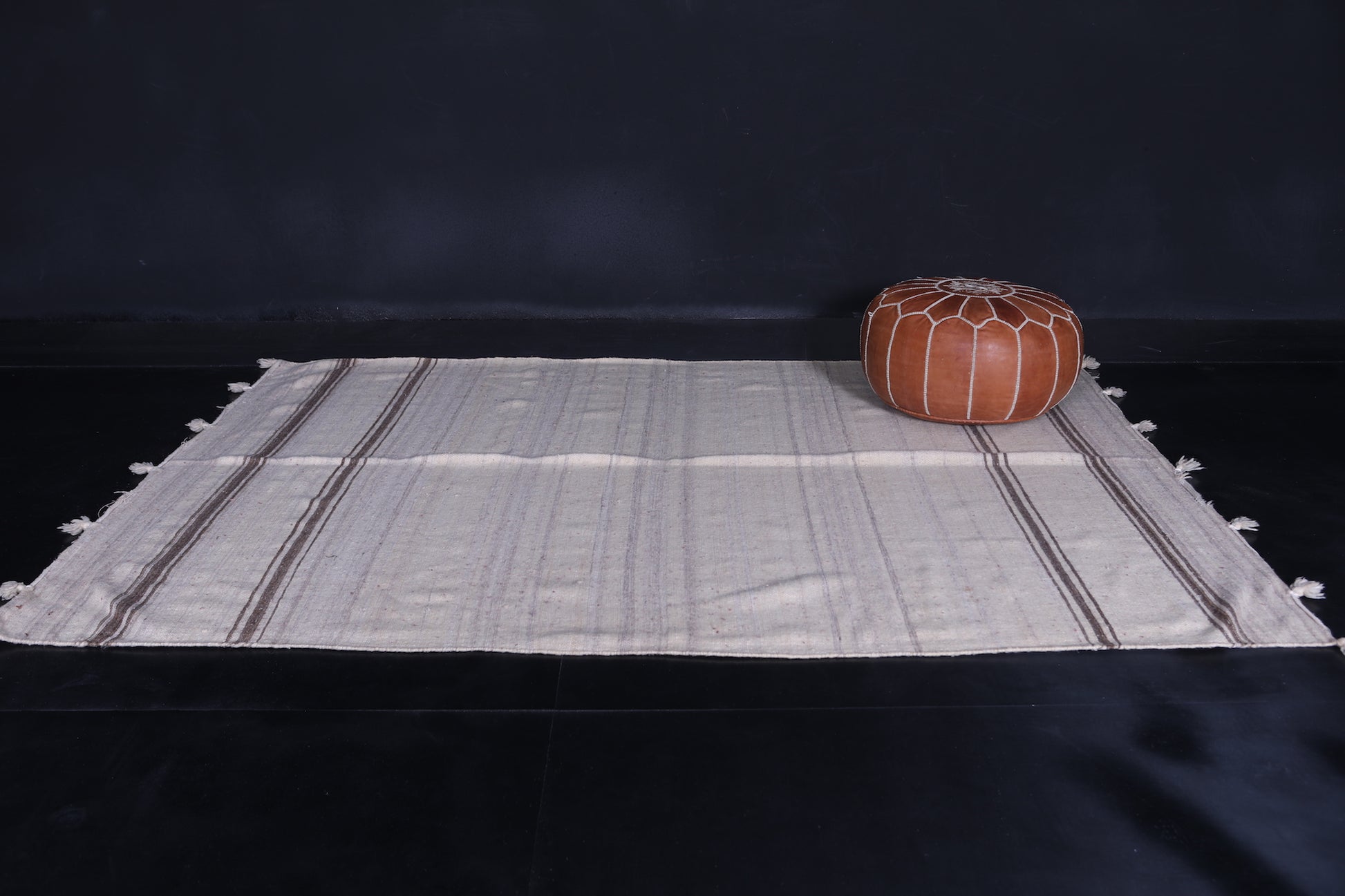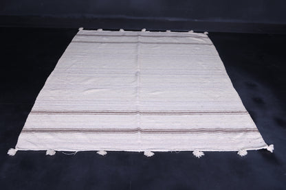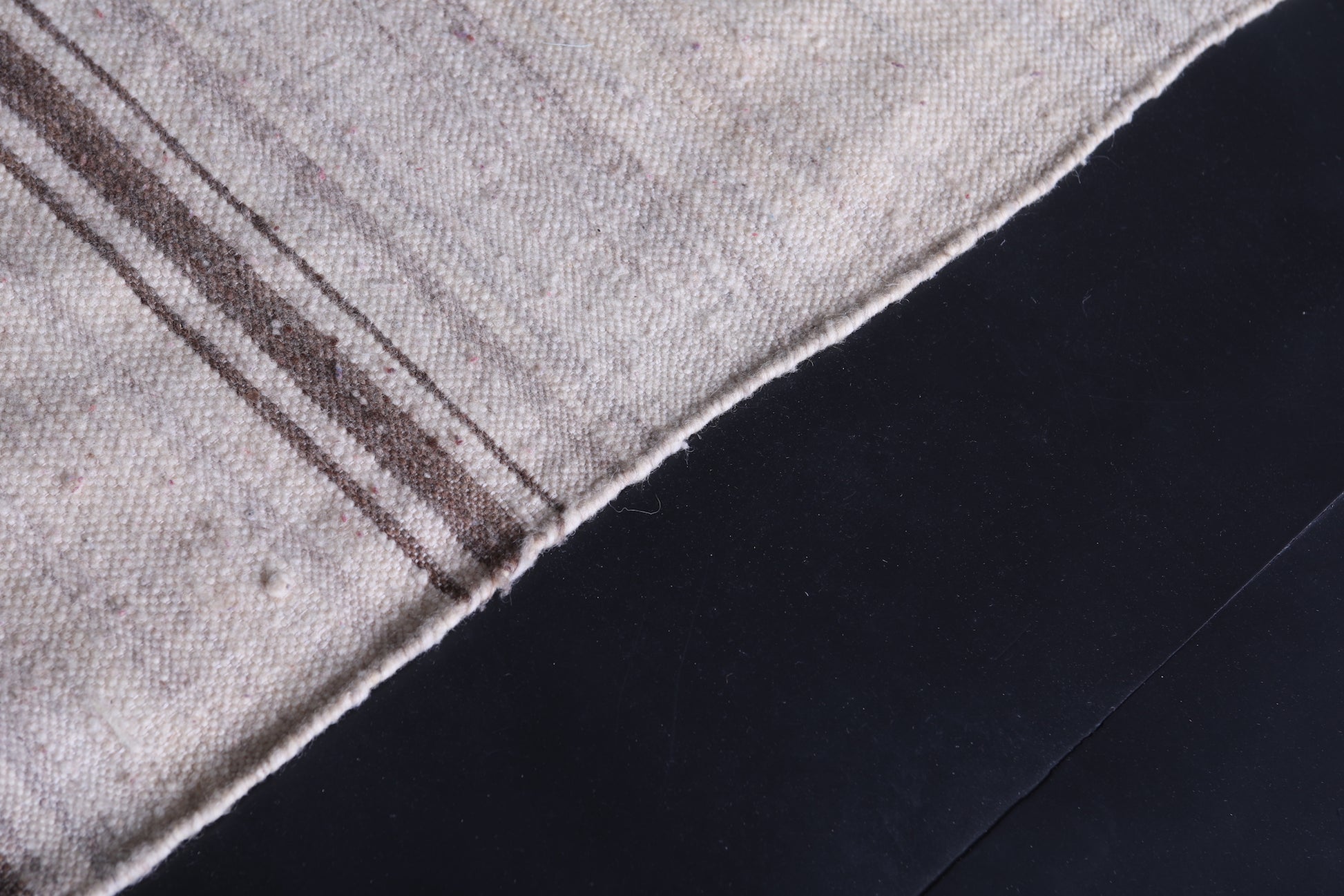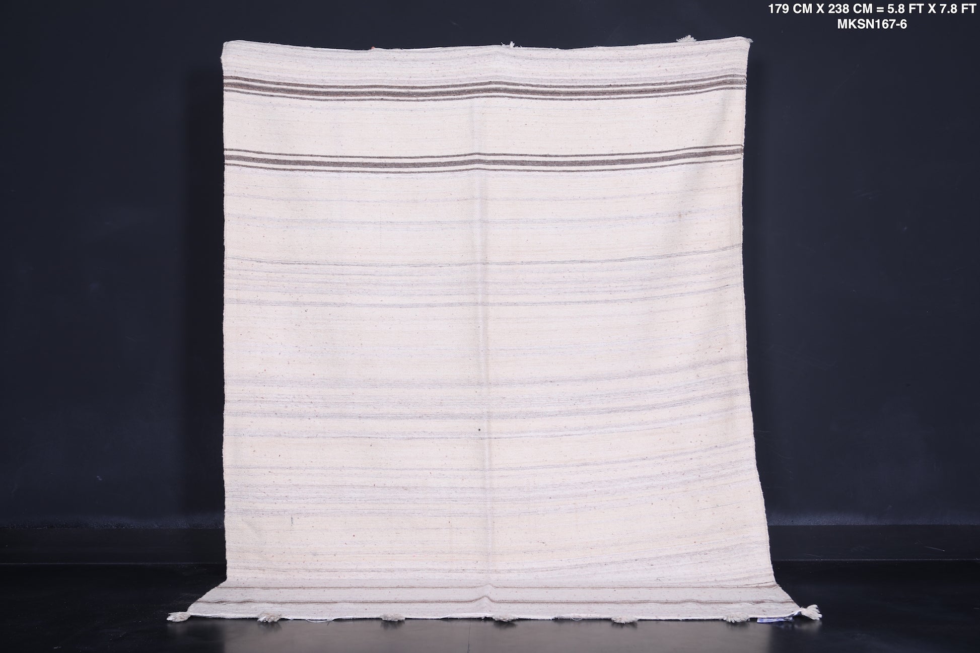This 5.9 x 7.8 feet Vintage Moroccan Handwoven Kilim features a timeless neutral palette with minimalist black stripes, blending simplicity with artisanal craftsmanship. Handwoven from premium wool, this versatile piece is perfect for modern or traditional interiors.