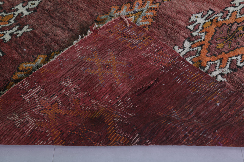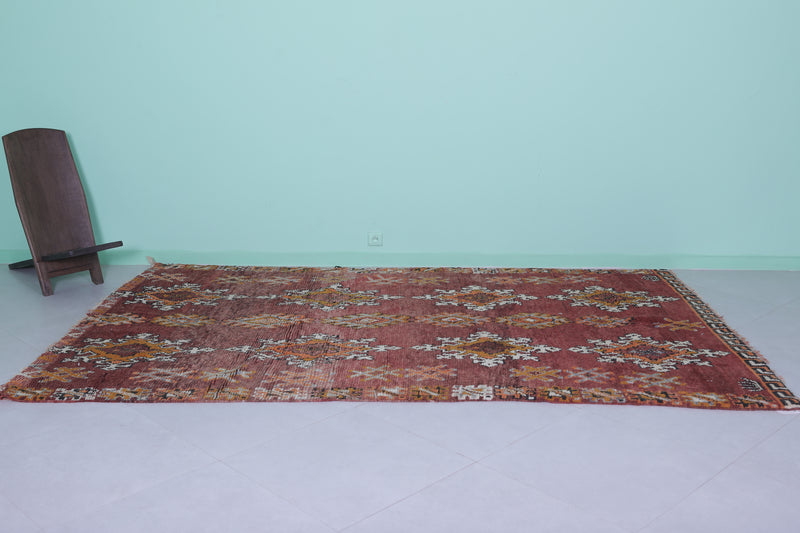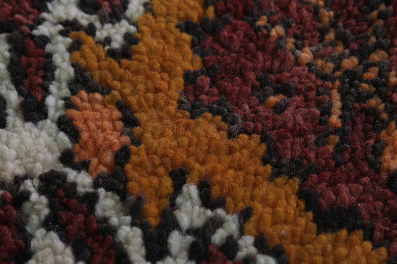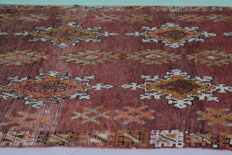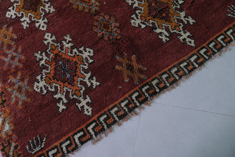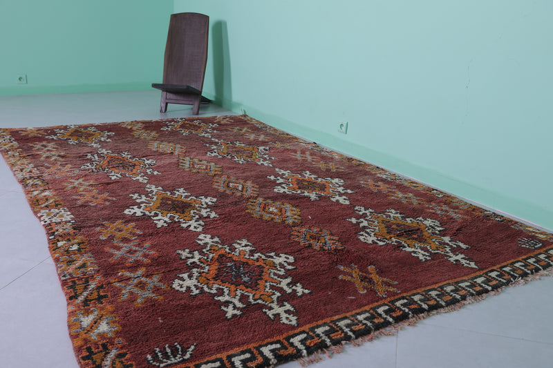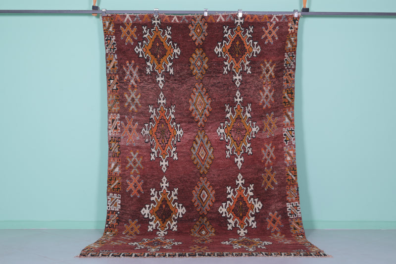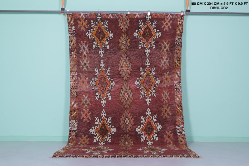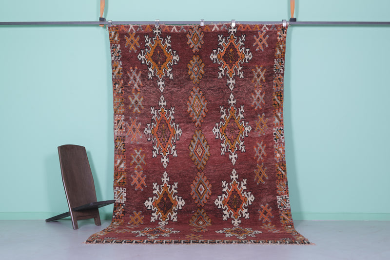 Transform your space with this handwoven Berber vintage Moroccan rug, measuring 5.9 FT x 9.9 FT. Featuring ornate diamond motifs in bold orange, white, and black, symmetrically arranged across a deep red background, this rug exudes cultural authenticity. The intricate geometric patterns and Berber symbols add depth and artistry, while the subtle transitions between warm tones and accents of ivory create harmony and elegance. Handwoven from premium natural fibers, this rug offers exceptional durability, warmth, and timeless beauty. Perfect for living rooms, bedrooms, or as a standout decorative accent, this piece seamlessly blends tradition with modern style.