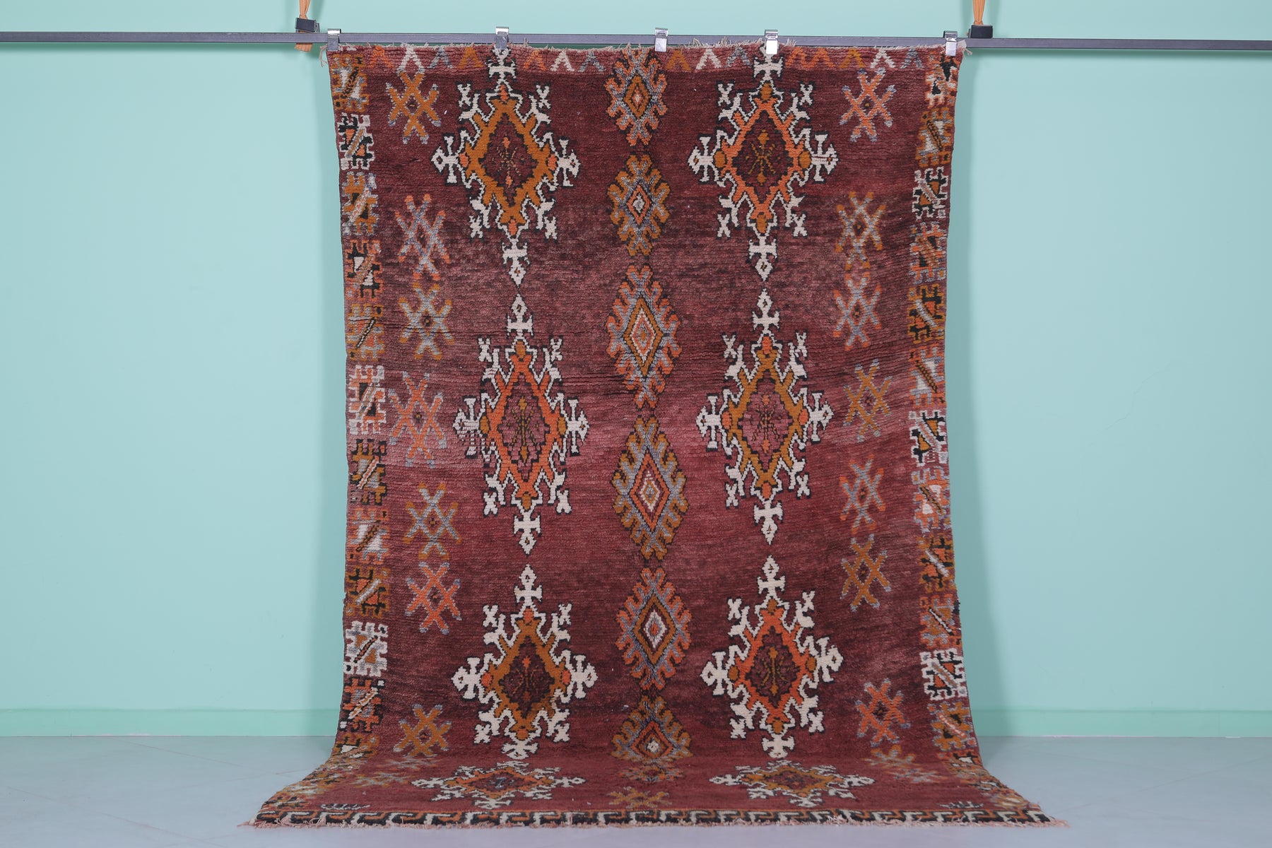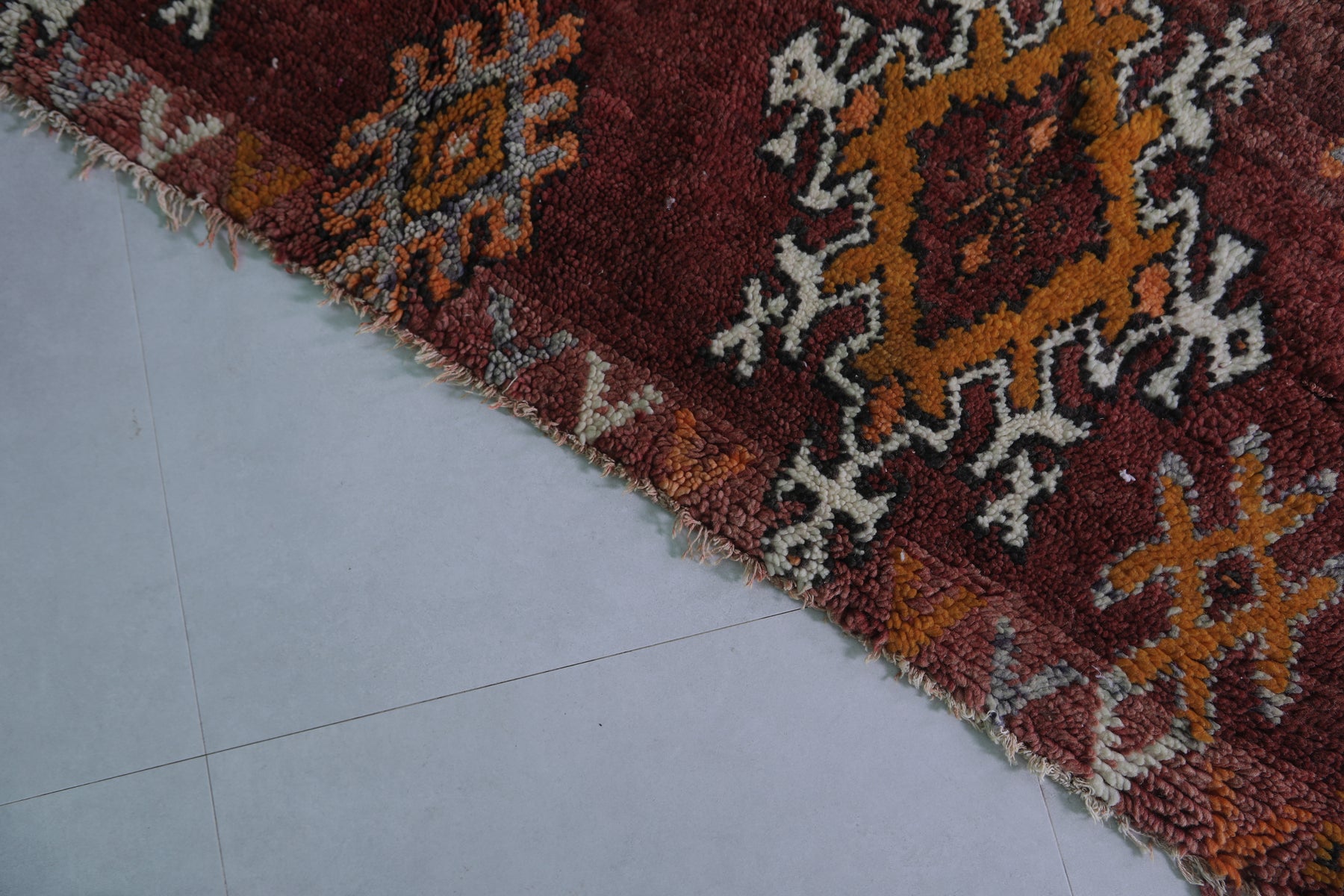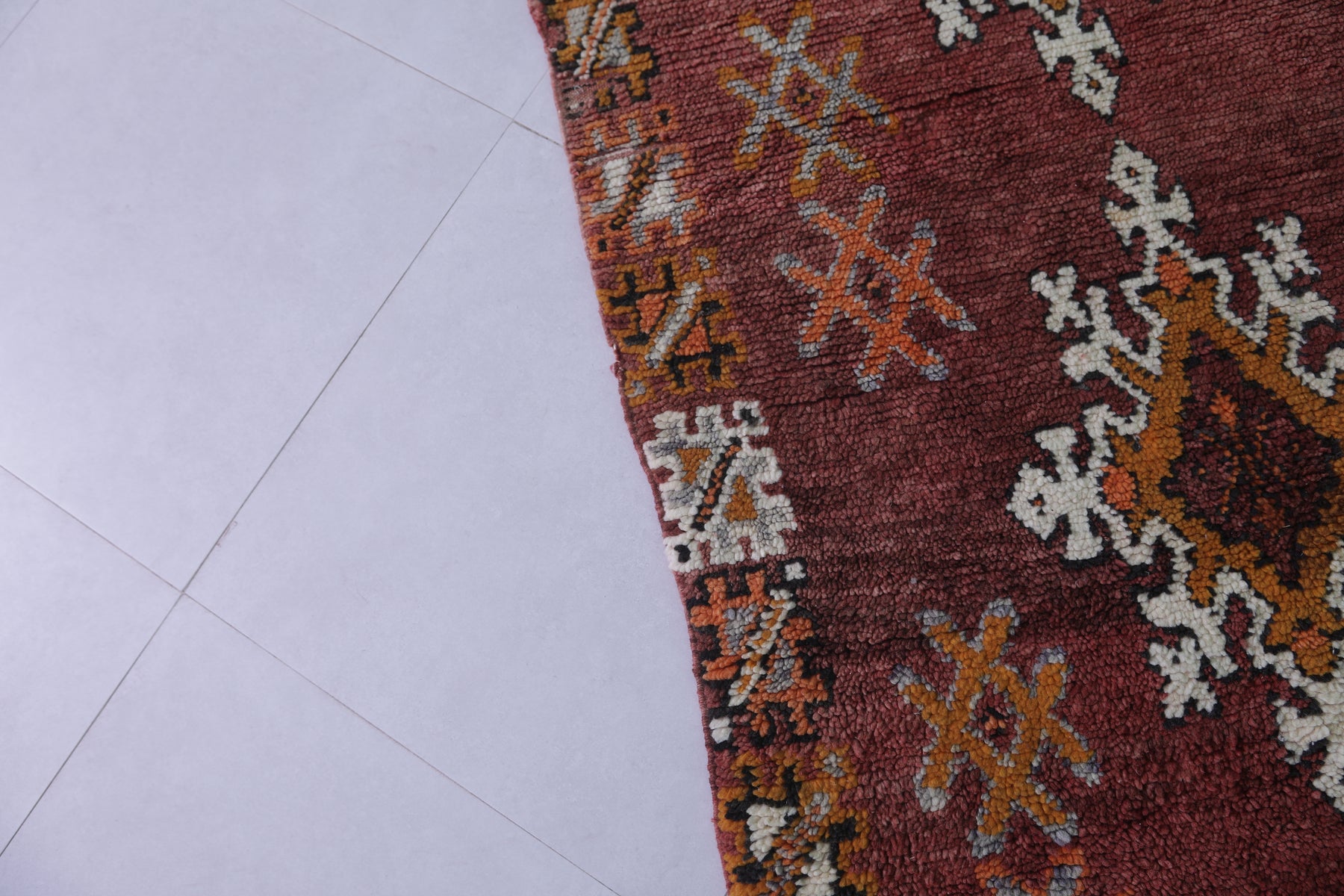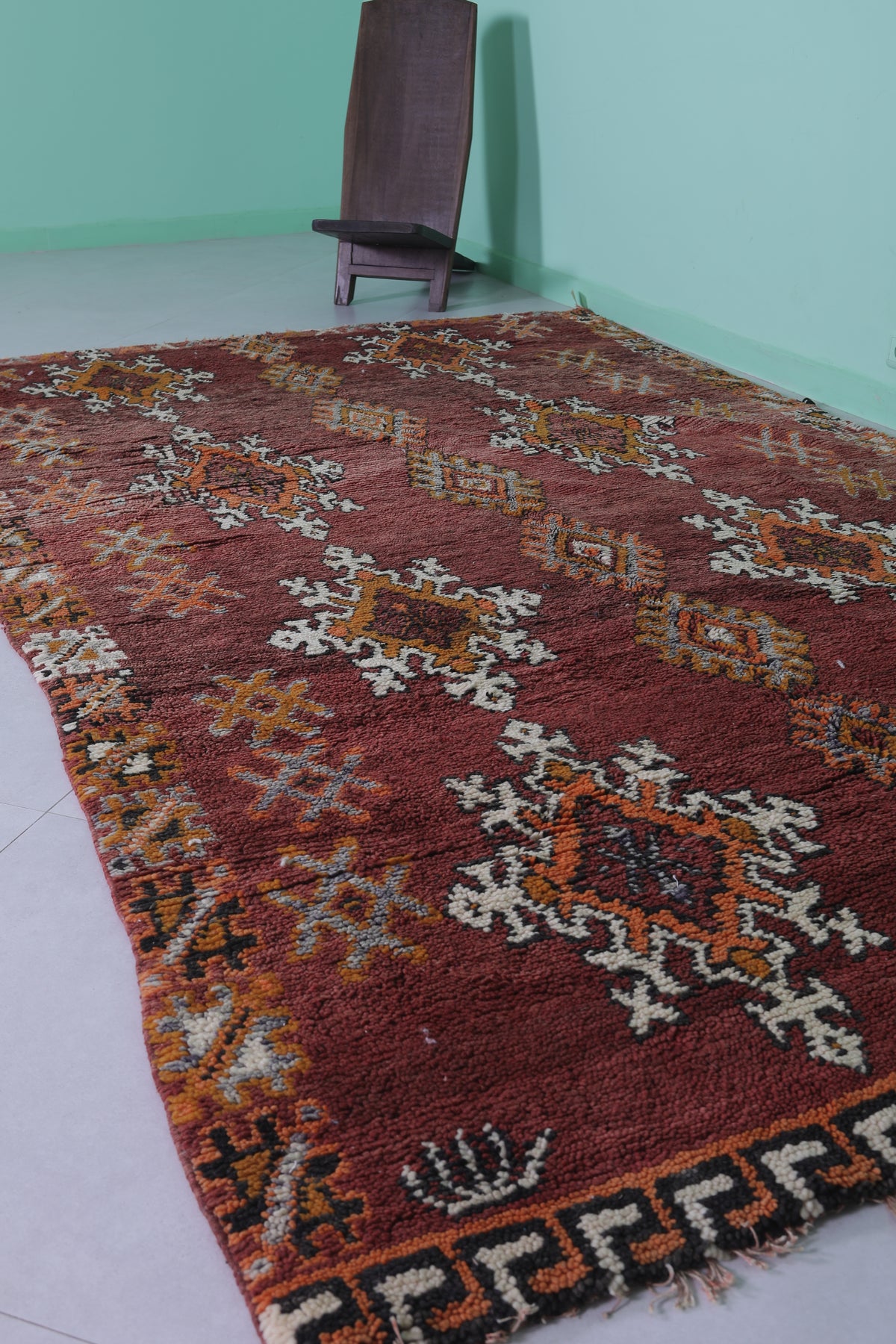 Transform your space with this handwoven Berber vintage Moroccan rug, measuring 5.9 FT x 9.9 FT. Featuring ornate diamond motifs in bold orange, white, and black, symmetrically arranged across a deep red background, this rug exudes cultural authenticity. The intricate geometric patterns and Berber symbols add depth and artistry, while the subtle transitions between warm tones and accents of ivory create harmony and elegance. Handwoven from premium natural fibers, this rug offers exceptional durability, warmth, and timeless beauty. Perfect for living rooms, bedrooms, or as a standout decorative accent, this piece seamlessly blends tradition with modern style.