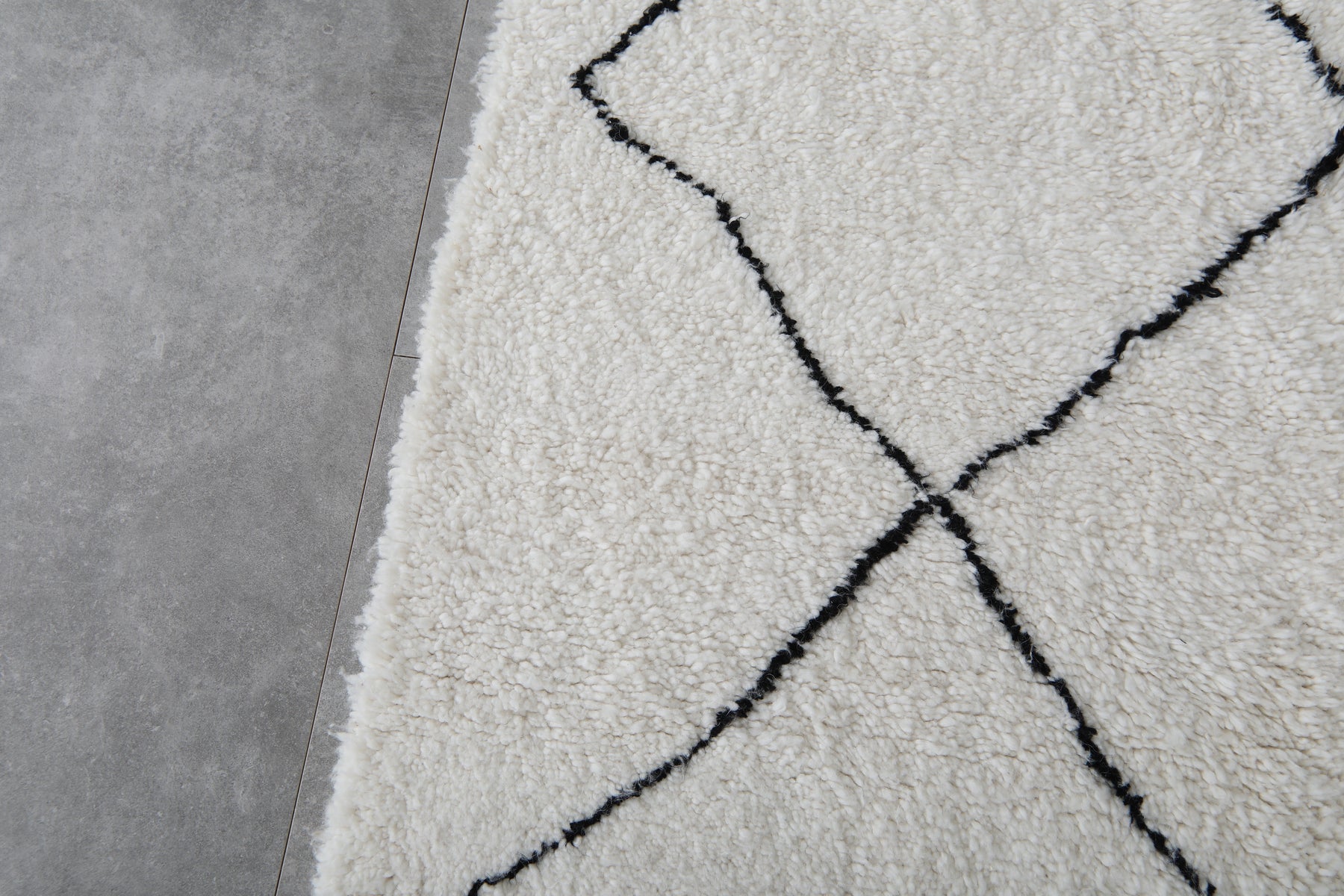 Add a touch of Moroccan elegance to your space with this Modern Moroccan Rug, sized at 5 x 7.8 feet (154 CM x 238 CM). Featuring a bold black diamond pattern on a soft white background, this handwoven rug blends traditional craftsmanship with a contemporary aesthetic. Perfect for small living rooms, bedrooms, or reading nooks, it brings warmth, texture, and timeless style to any setting.