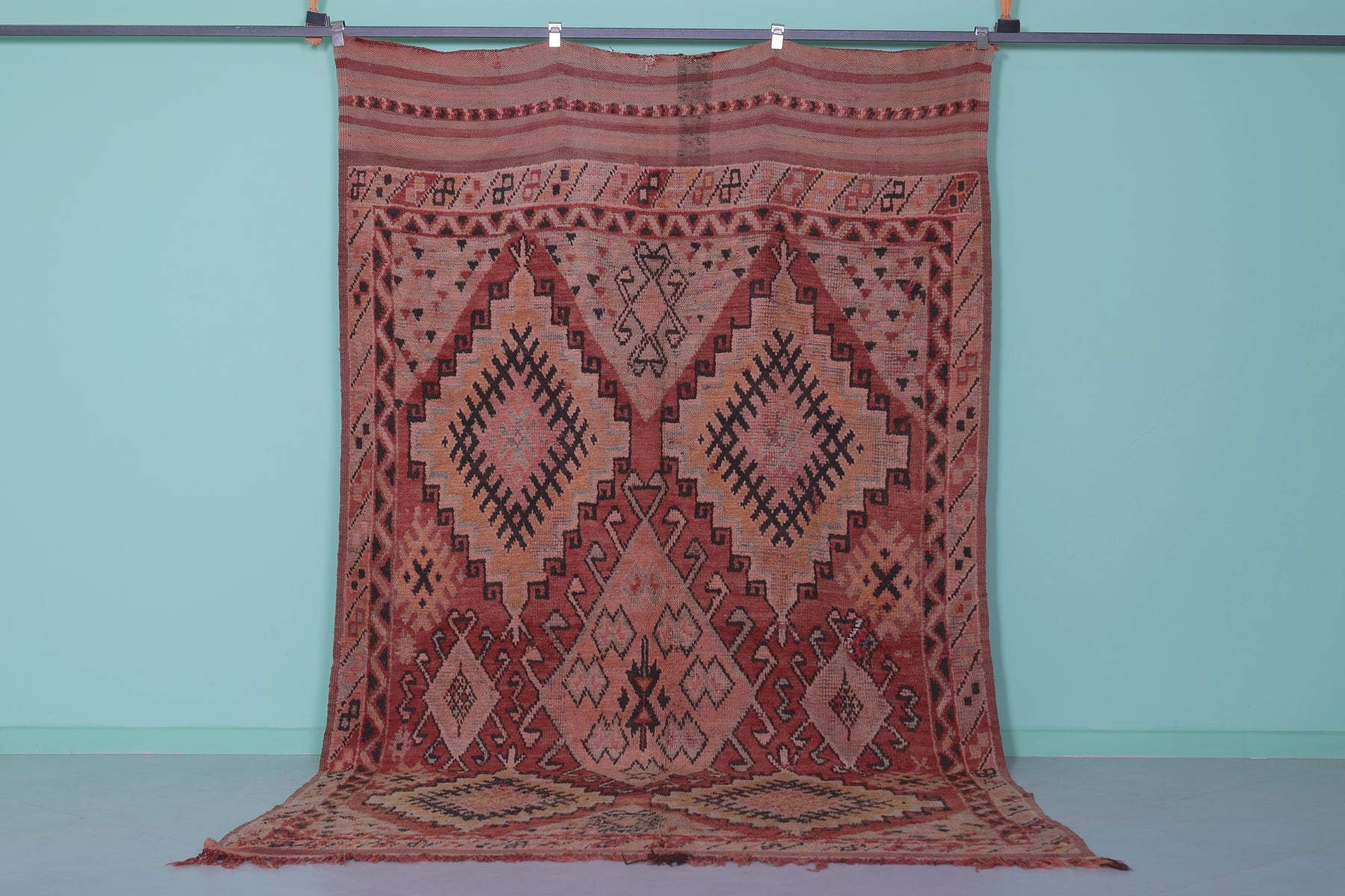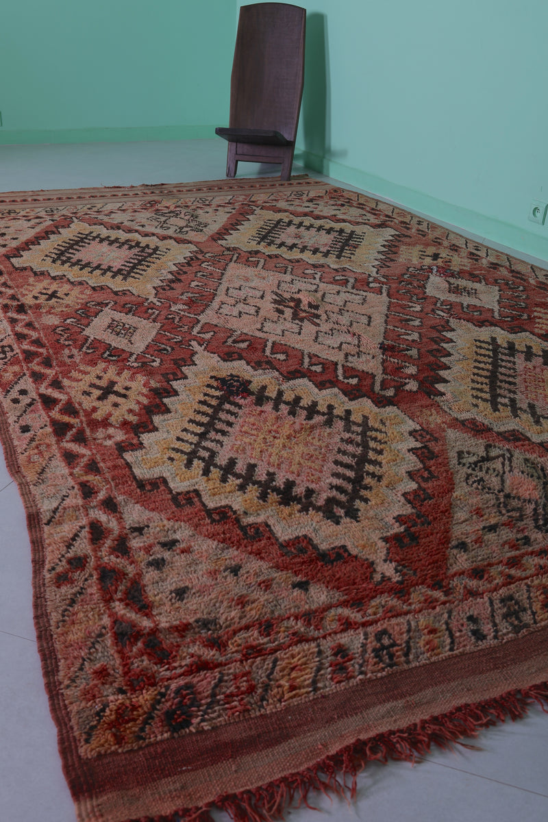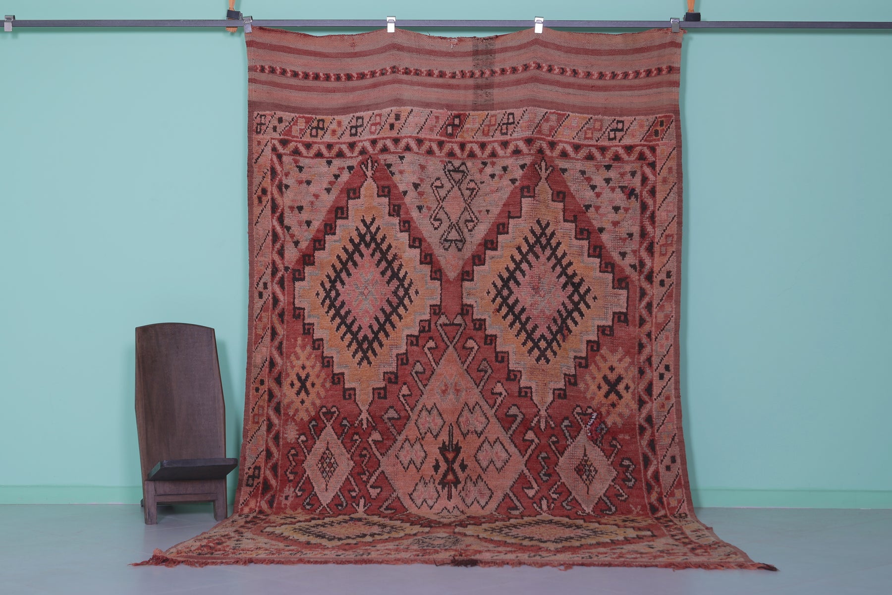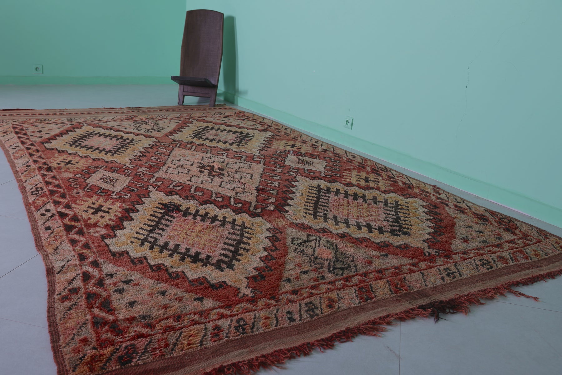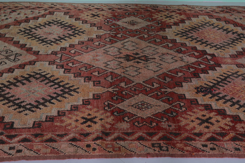 Enhance your space with this handwoven Moroccan wool rug, measuring 6.4 FT x 11.3 FT. The earthy hues of terracotta, crimson, and beige blend seamlessly into a symmetrical diamond pattern, evoking traditional tribal artistry. Black accent lines highlight the intricate detailing, enhancing its timeless appeal. Ideal for living rooms, dining areas, or statement spaces, this rug combines durability and craftsmanship for lasting beauty. Elevate your home décor with a touch of Moroccan heritage.
