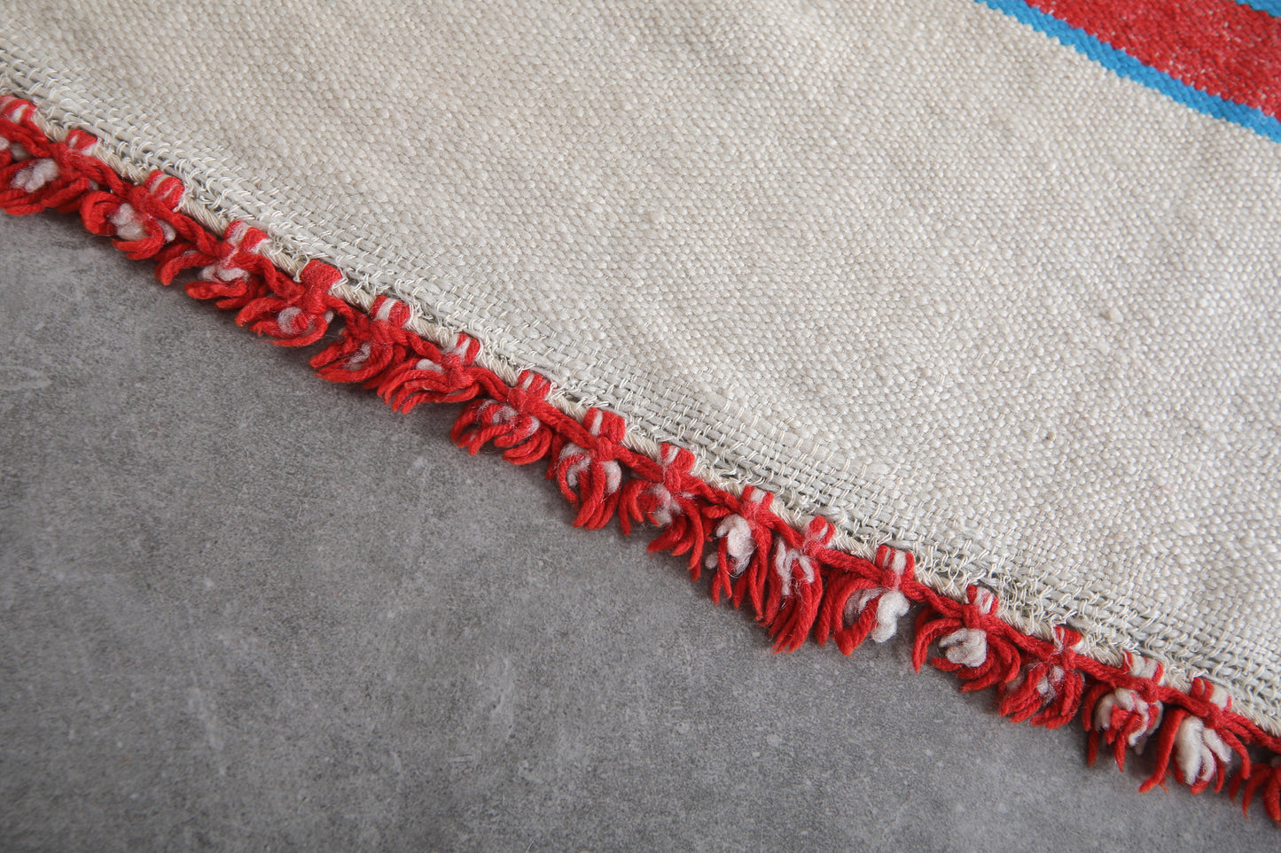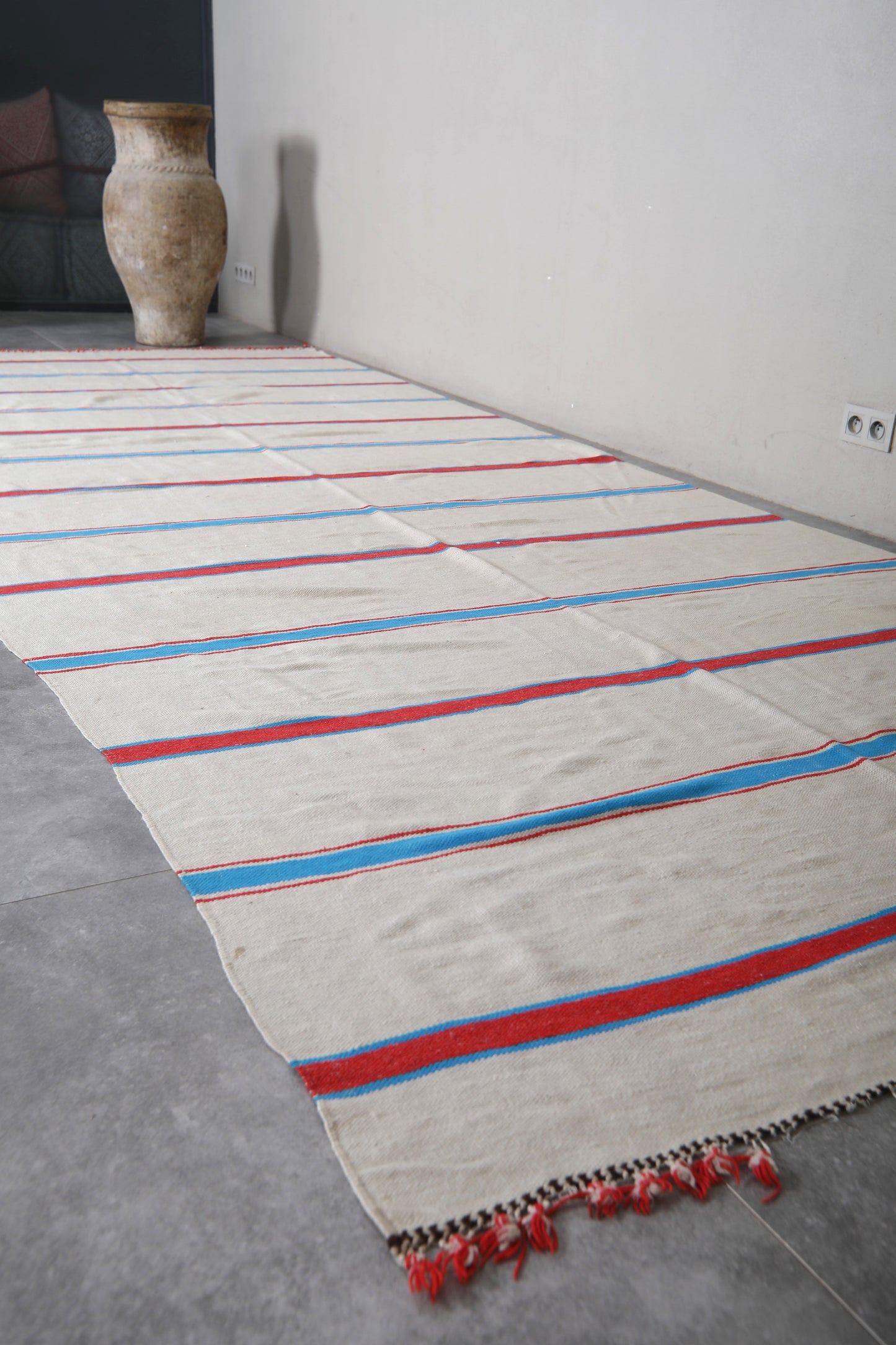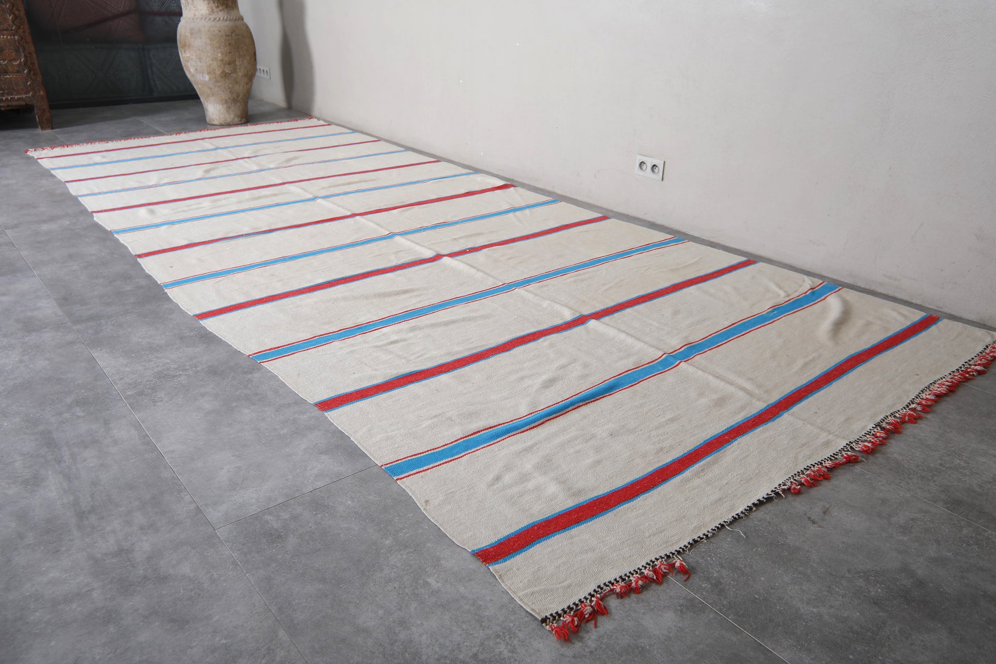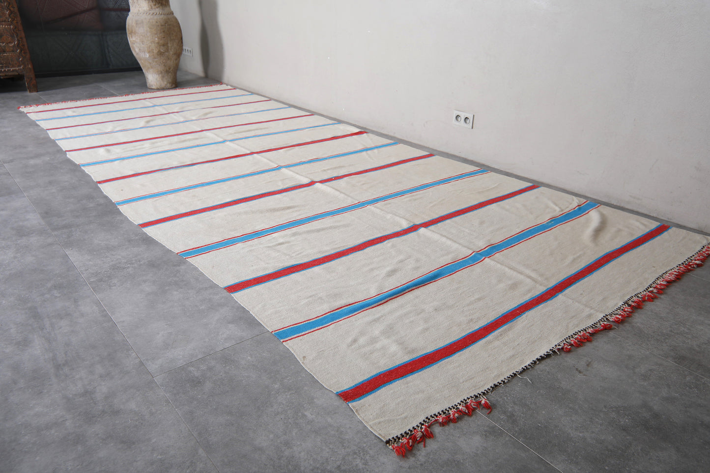 This 6.1 x 15.4 feet Moroccan wool runner rug features subtle red and blue stripes on a cream background, finished with delicate red fringe detailing.