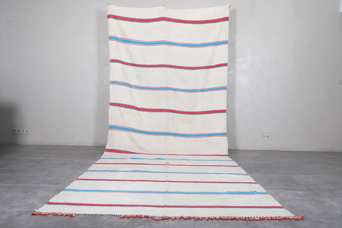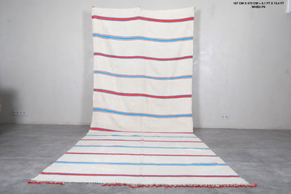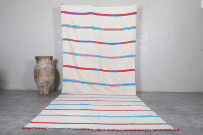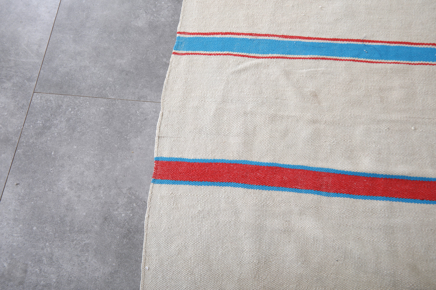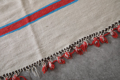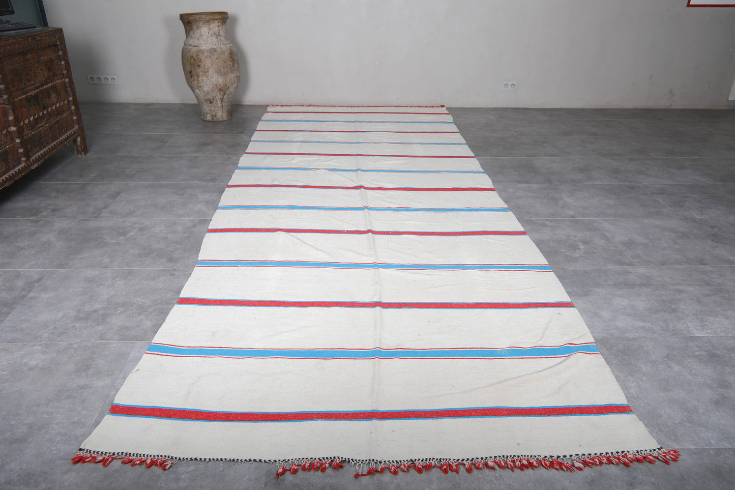 This 6.1 x 15.4 feet Moroccan wool runner rug features subtle red and blue stripes on a cream background, finished with delicate red fringe detailing.