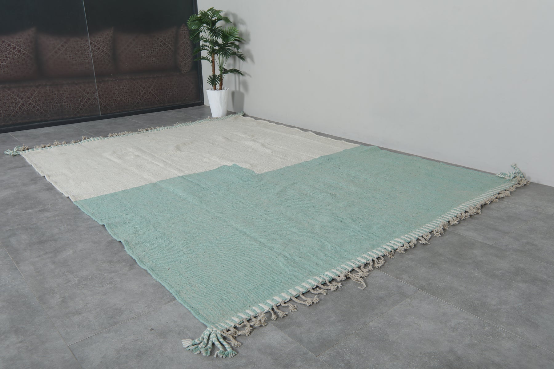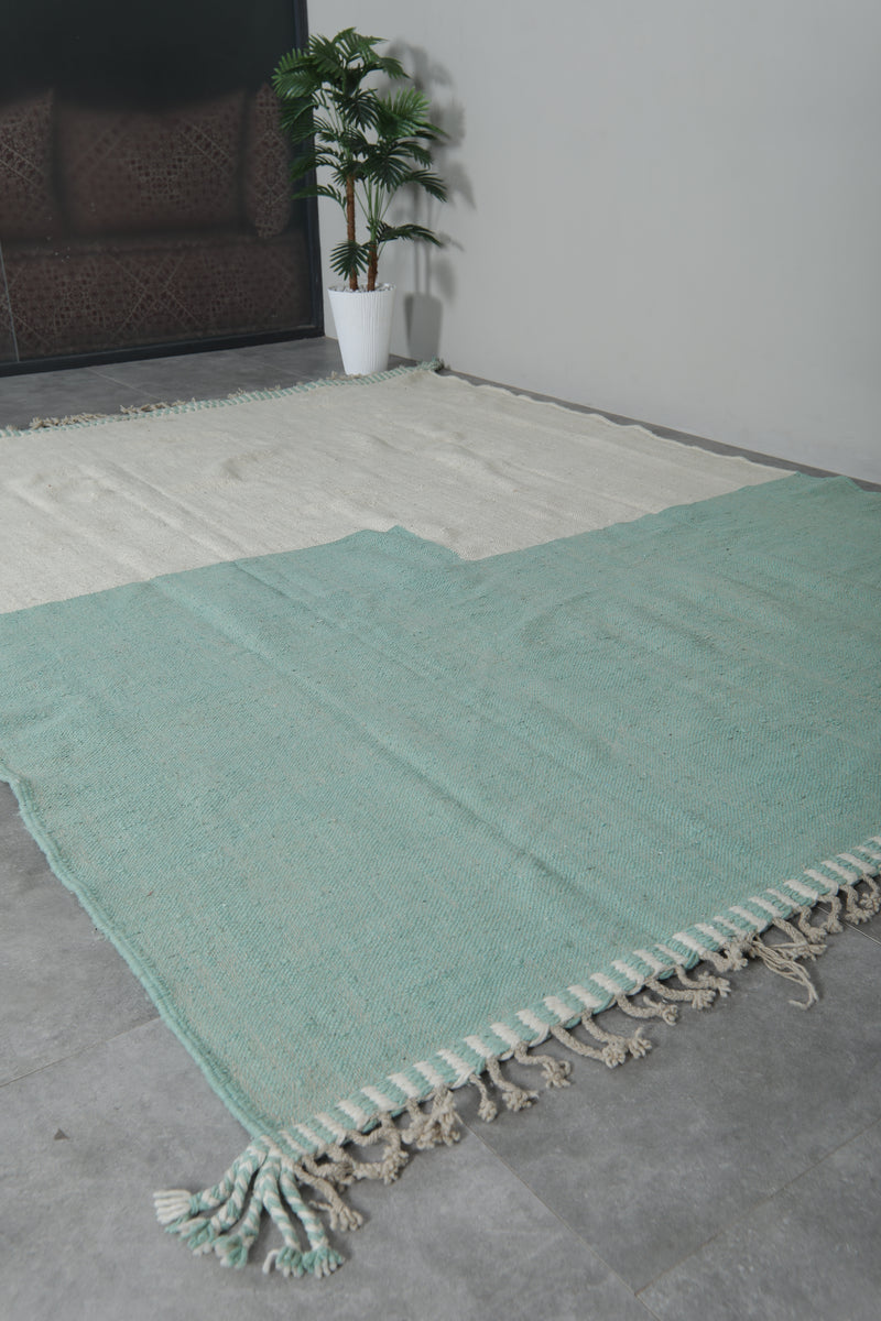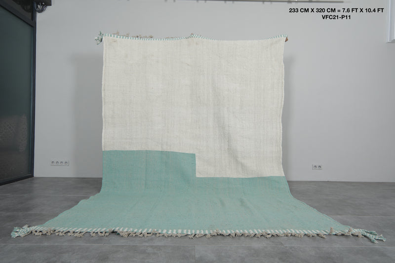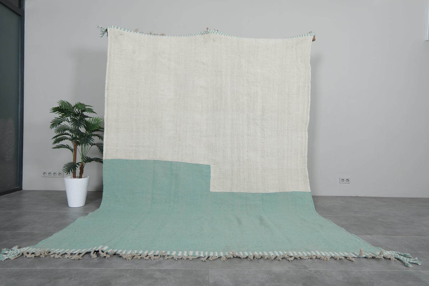 This 7.6 x 10.4 feet handwoven Moroccan rug blends traditional craftsmanship with a modern twist. Featuring a soft cream base accented by a calming teal section, it adds a touch of elegance and vibrancy to any space. Handwoven from high-quality natural wool, it offers soft texture, warmth, and durability, making it perfect for living rooms, bedrooms, or dining areas.