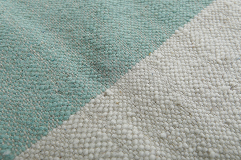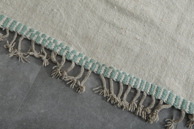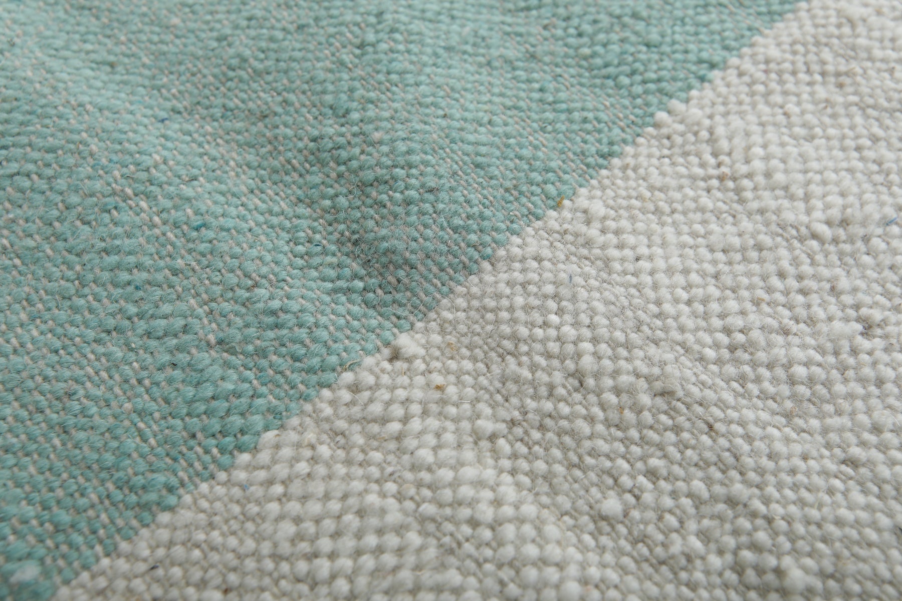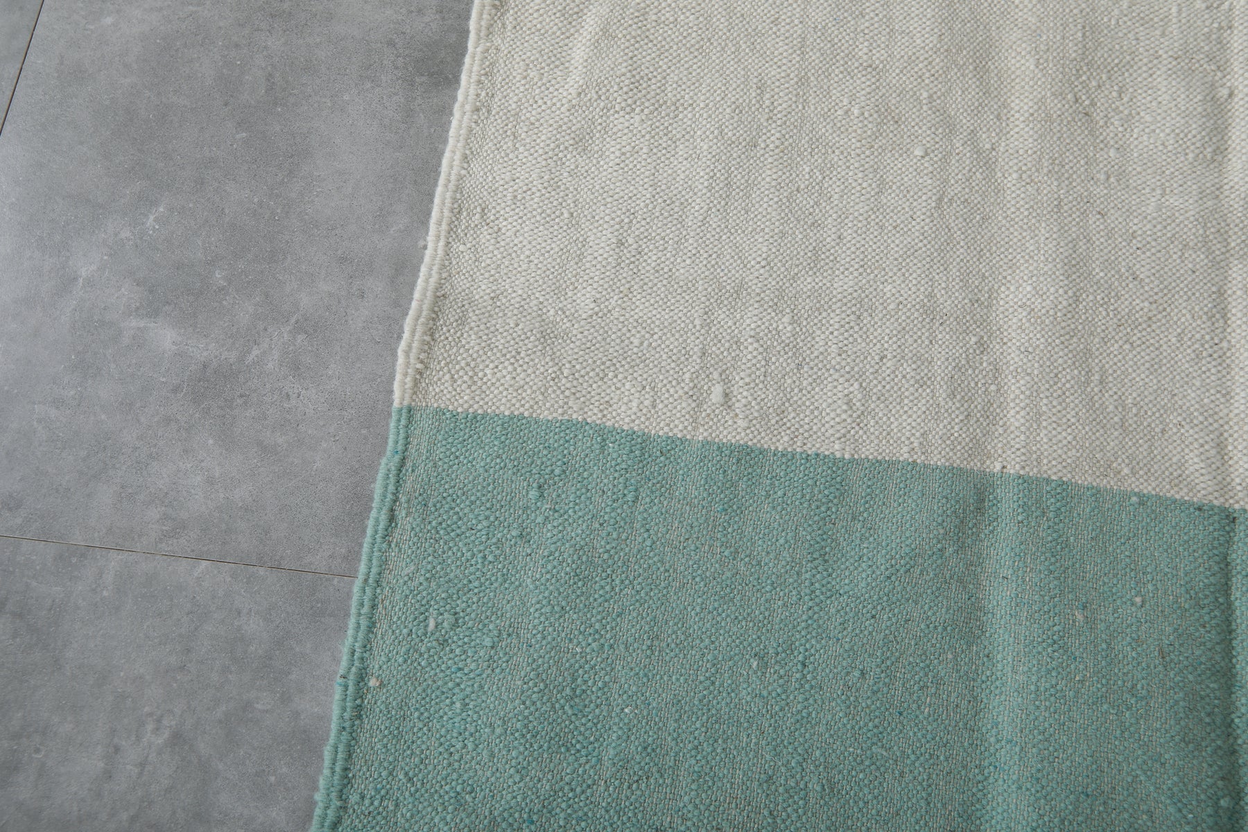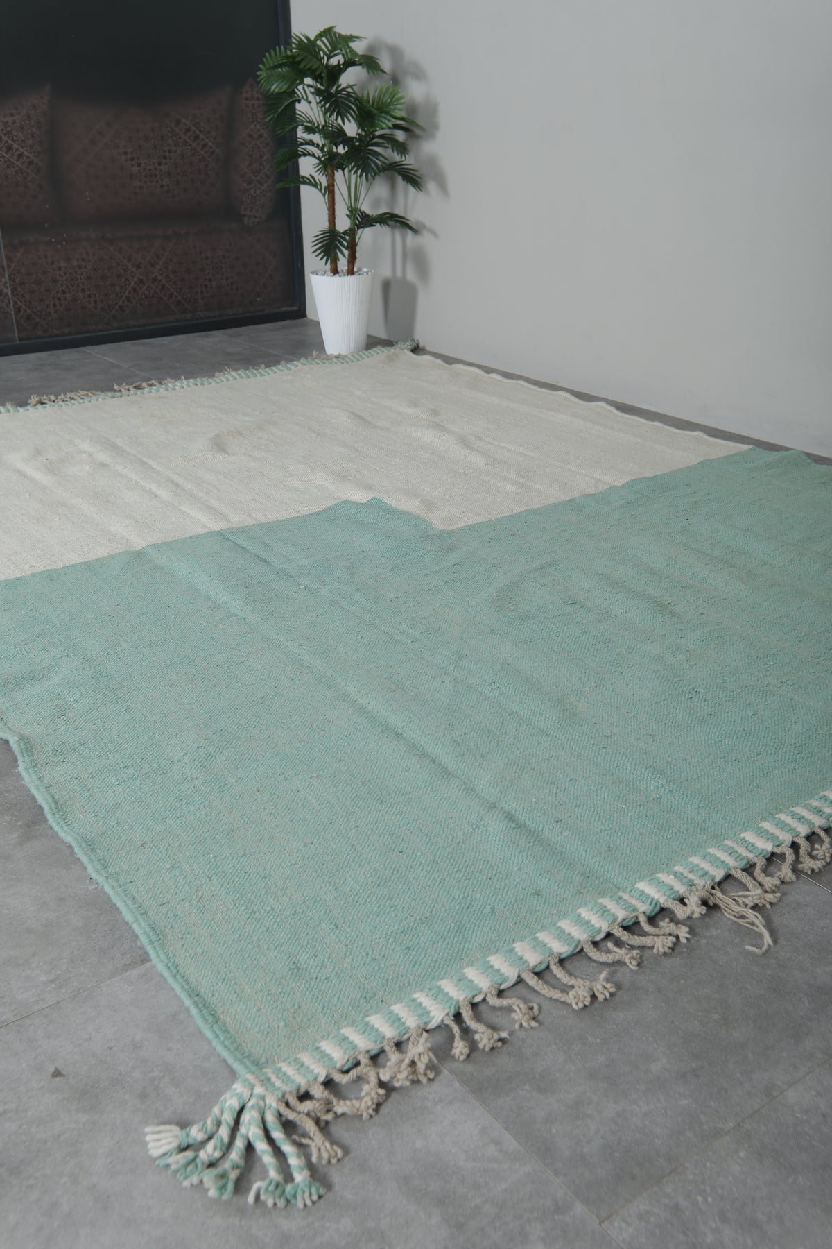 This 7.6 x 10.4 feet handwoven Moroccan rug blends traditional craftsmanship with a modern twist. Featuring a soft cream base accented by a calming teal section, it adds a touch of elegance and vibrancy to any space. Handwoven from high-quality natural wool, it offers soft texture, warmth, and durability, making it perfect for living rooms, bedrooms, or dining areas.
