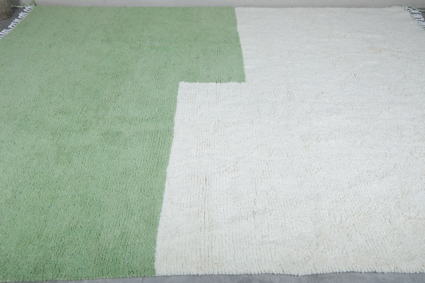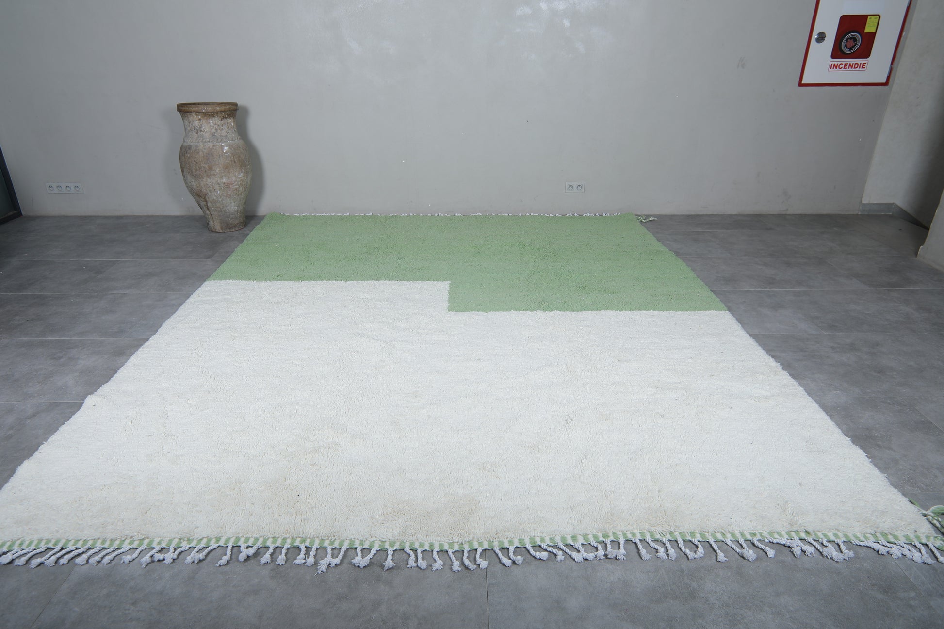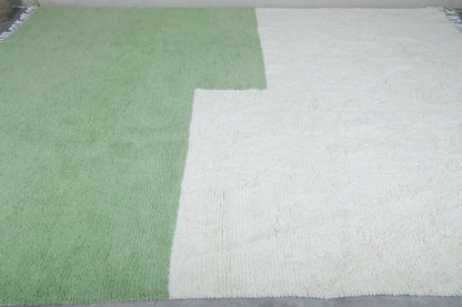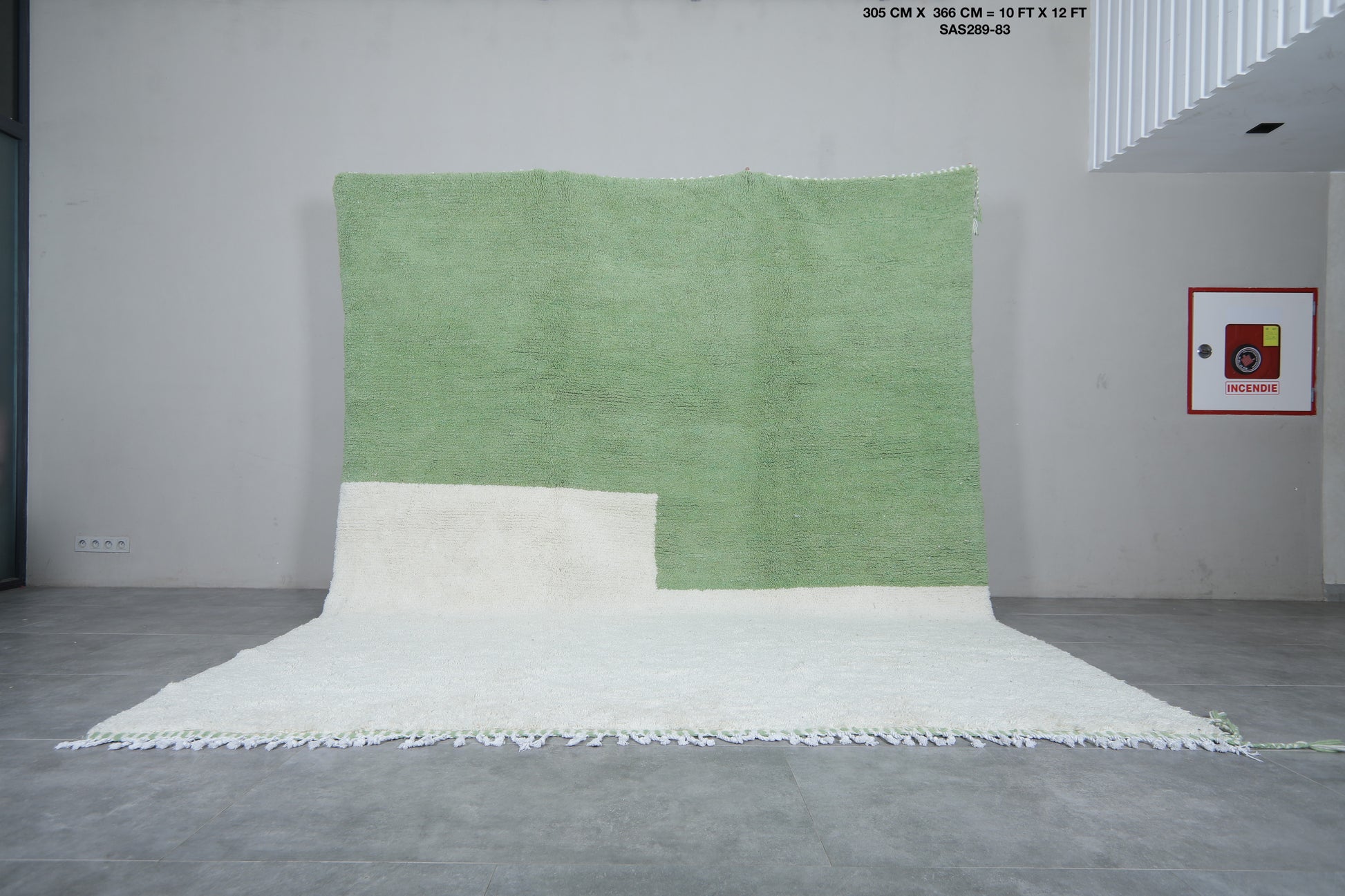Discover the elegance of this Handmade Moroccan Rug, sized at 10 x 12 feet (305 CM x 366 CM). Featuring a distinctive two-tone green and cream design, this rug is perfect for spacious living rooms, dining areas, or bedrooms. Crafted from premium wool, it offers exceptional softness and durability, making it ideal for both comfort and style. The minimalist yet striking design complements a variety of décor styles, from bohemian to modern. Elevate your space with this timeless Moroccan piece. Order now and transform your home!