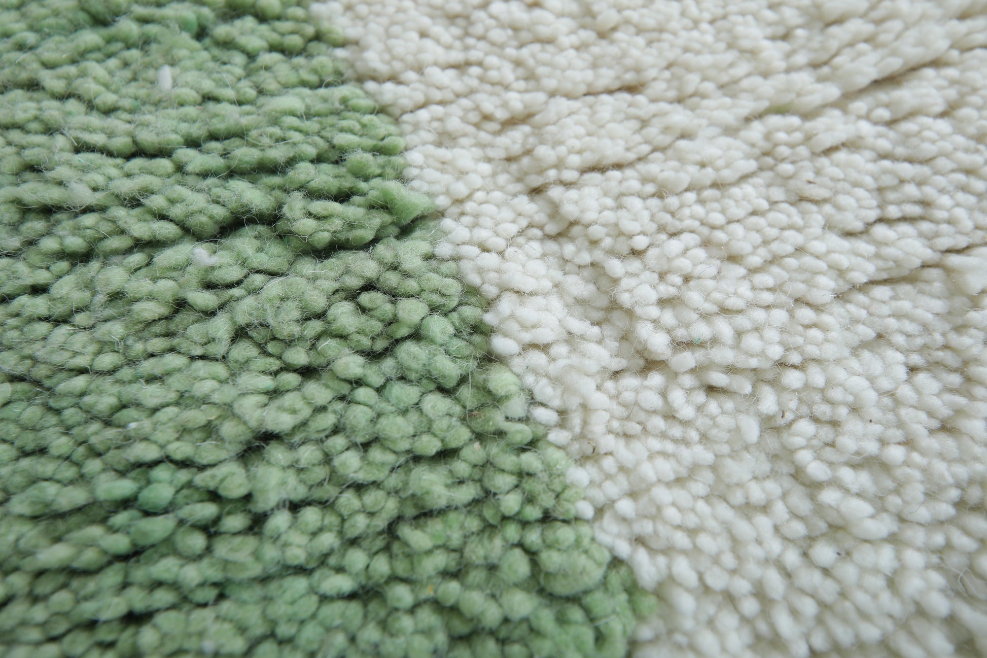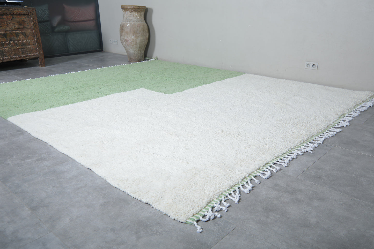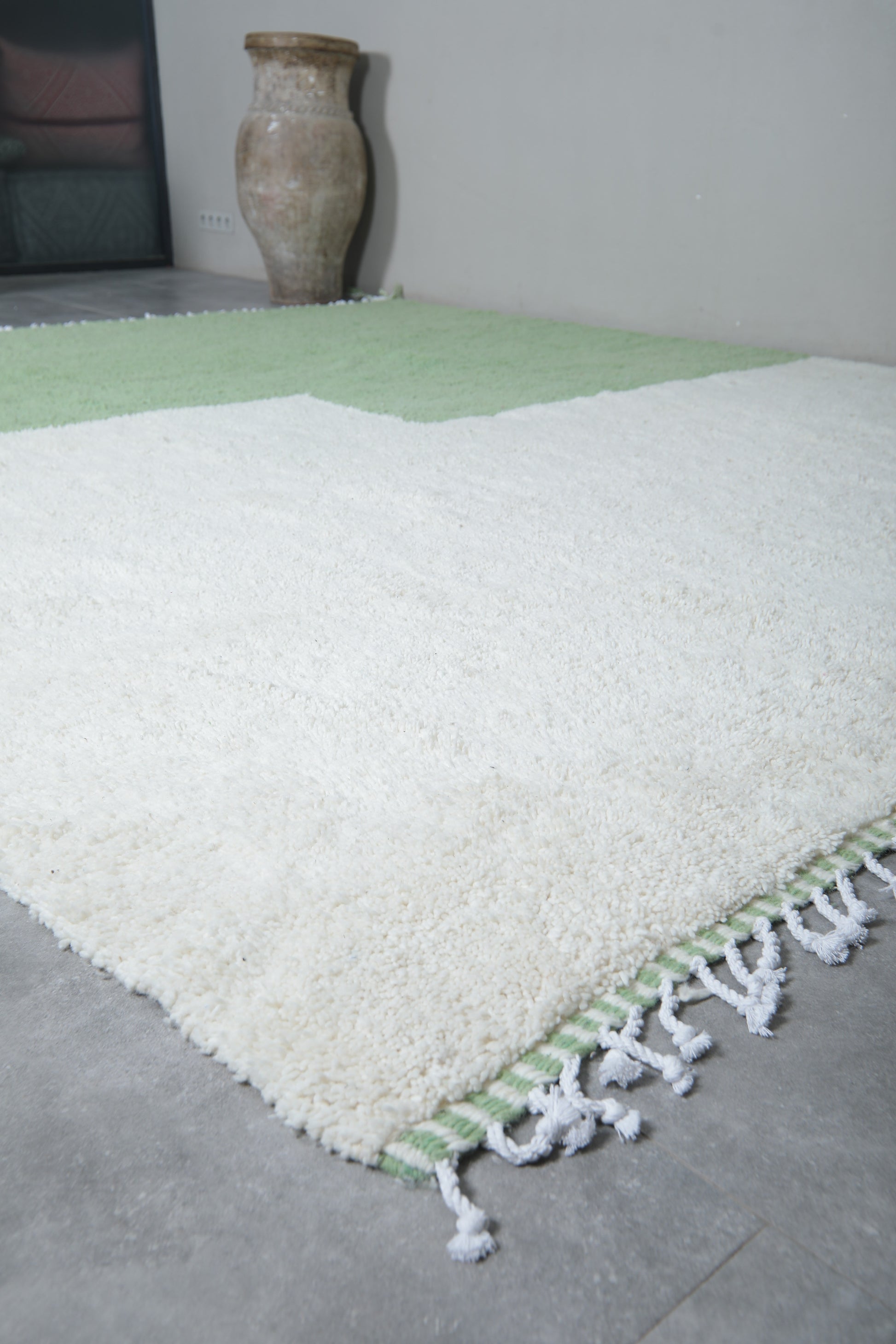 Discover the elegance of this Handmade Moroccan Rug, sized at 10 x 12 feet (305 CM x 366 CM). Featuring a distinctive two-tone green and cream design, this rug is perfect for spacious living rooms, dining areas, or bedrooms. Crafted from premium wool, it offers exceptional softness and durability, making it ideal for both comfort and style. The minimalist yet striking design complements a variety of décor styles, from bohemian to modern. Elevate your space with this timeless Moroccan piece. Order now and transform your home!