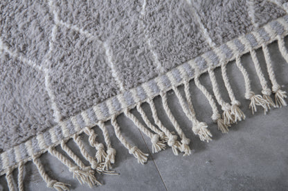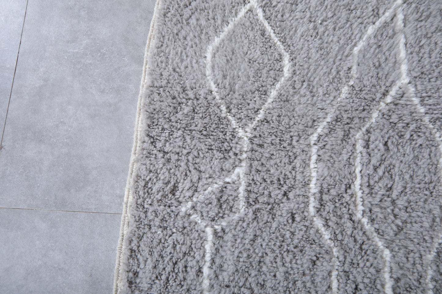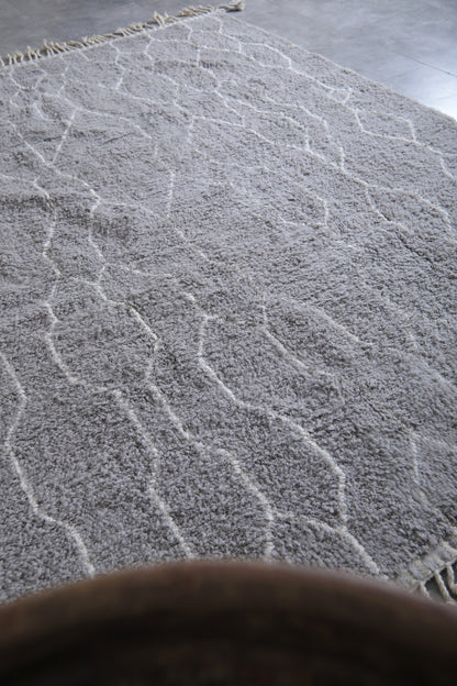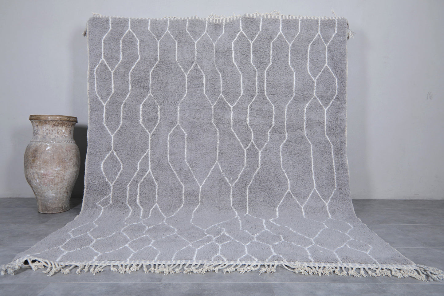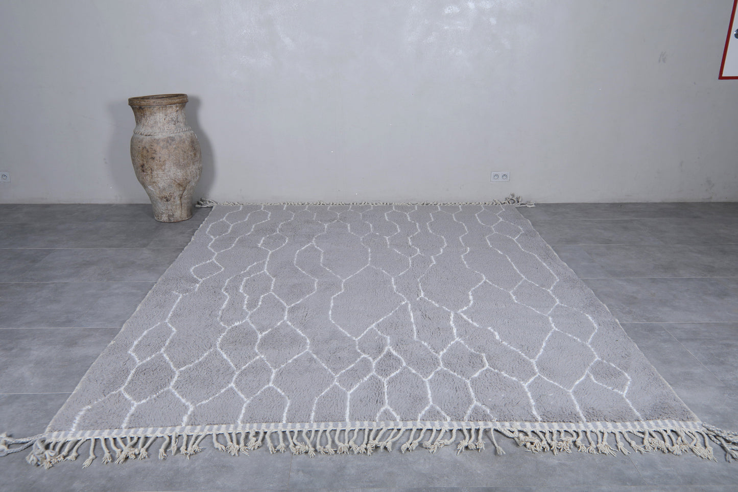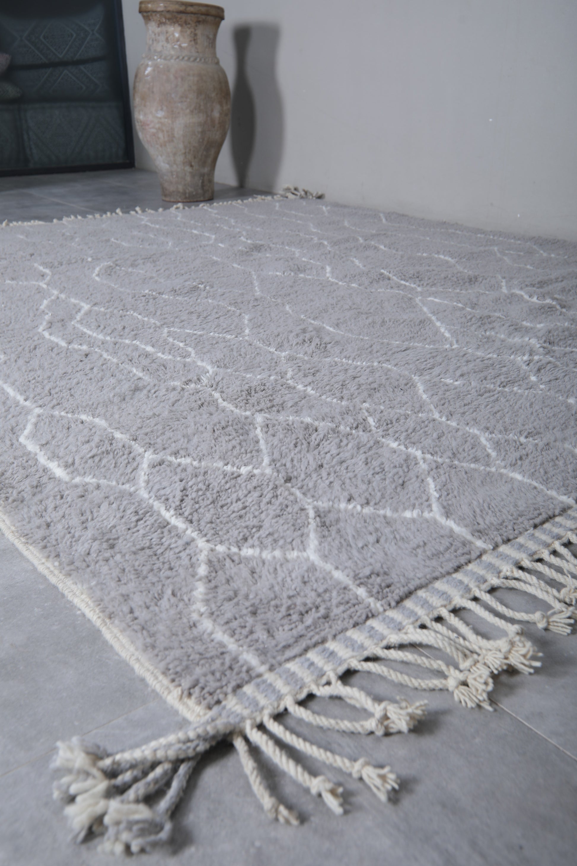 Transform your space with this stunning Beni Ourain Moroccan Rug, sized at 8.2 x 10.1 feet (252 CM x 310 CM). Handwoven from premium wool, this rug features a sophisticated gray base with an intricate white geometric pattern, embodying timeless Moroccan artistry. Its soft texture and natural warmth make it perfect for living rooms, dining areas, or bedrooms. Durable and eco-friendly, it complements both modern and traditional décor styles. Add this versatile, handcrafted masterpiece to your home for a touch of luxury. Order now for authentic Moroccan charm!
