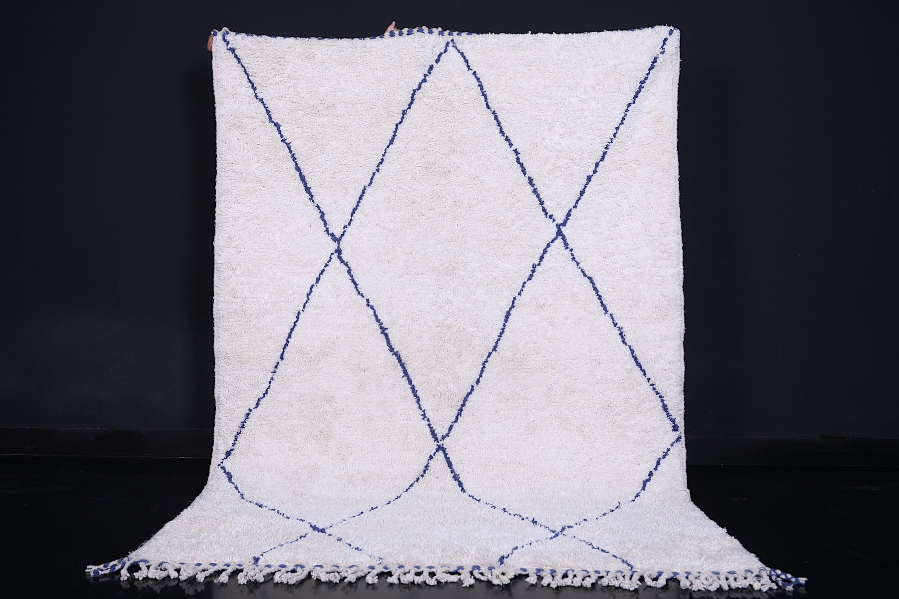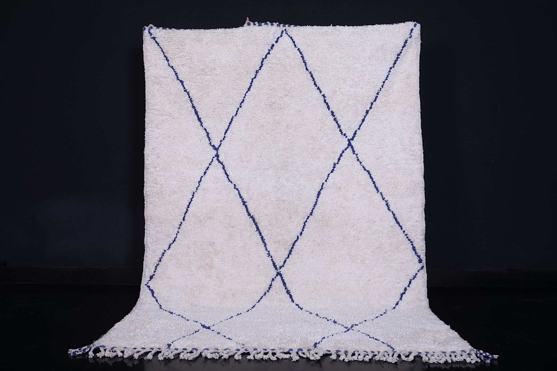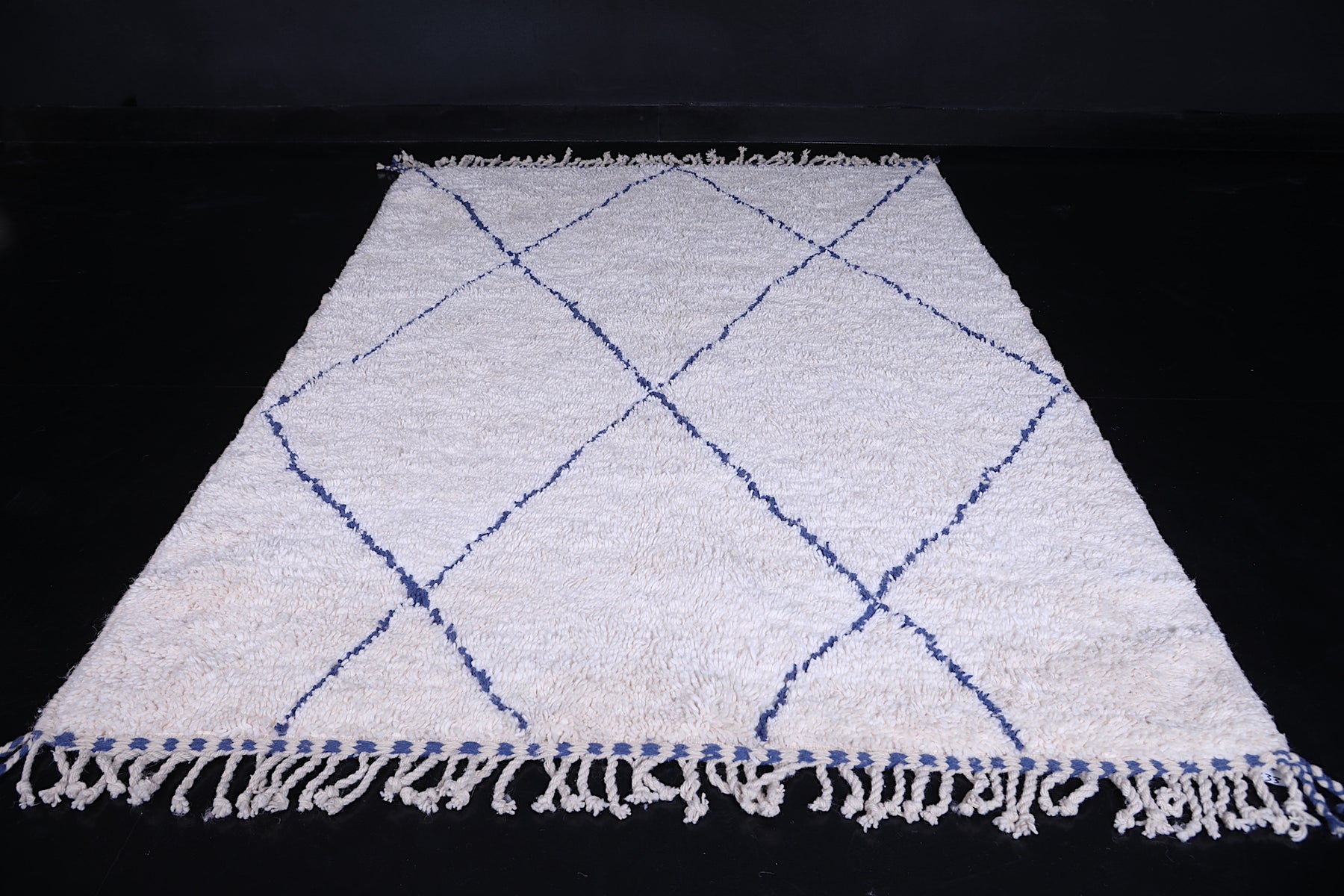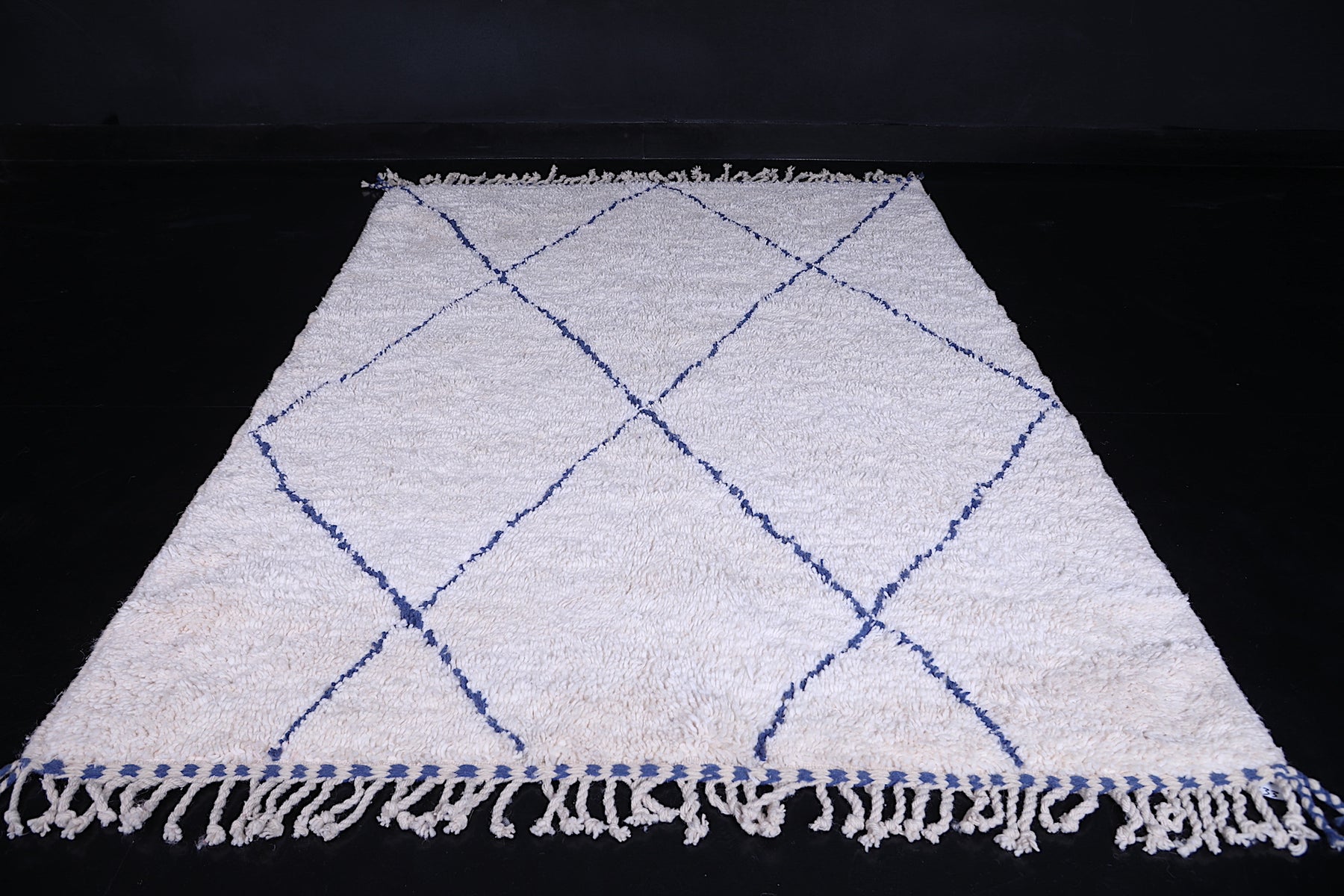 Bring a vibrant, modern twist to traditional Berber craftsmanship with this Authentic Beni Ourain Moroccan Rug. Hand-knotted from premium natural wool, this piece features a classic large-scale diamond lattice pattern. While the field remains a crisp, luminous off-white/cream, the geometric lines are rendered in a striking Cobalt or Electric Blue, offering a fresh alternative to traditional black-and-white designs.