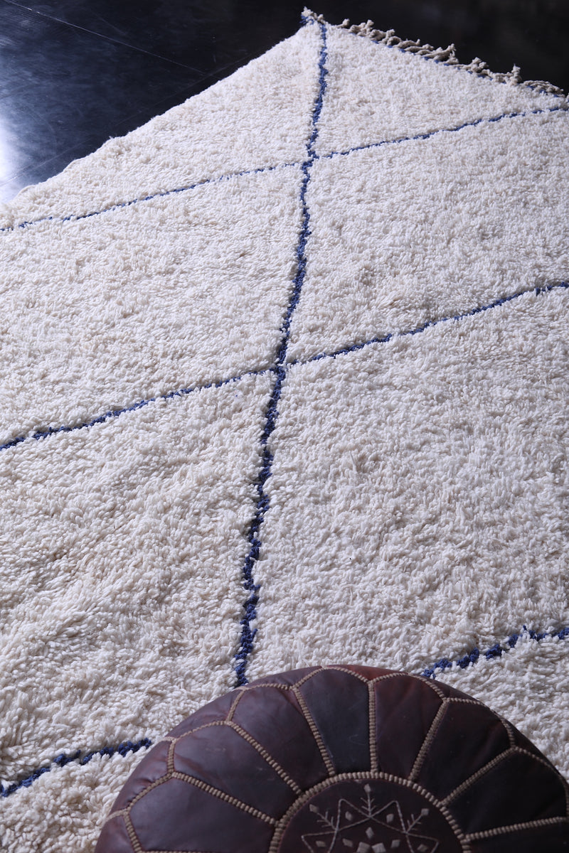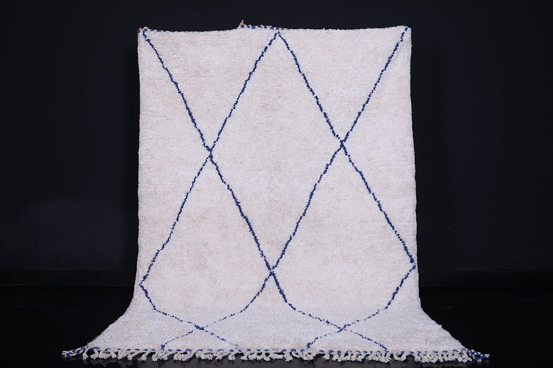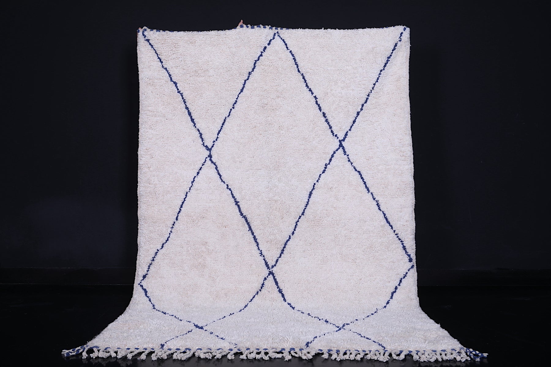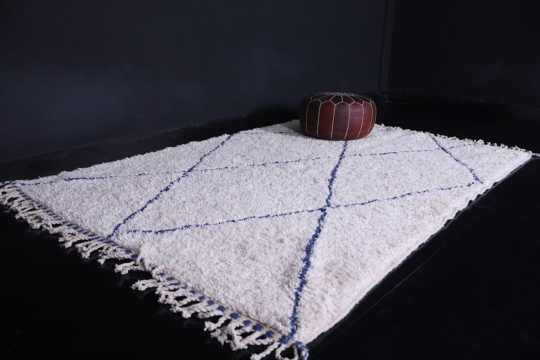 Bring a vibrant, modern twist to traditional Berber craftsmanship with this Authentic Beni Ourain Moroccan Rug. Hand-knotted from premium natural wool, this piece features a classic large-scale diamond lattice pattern. While the field remains a crisp, luminous off-white/cream, the geometric lines are rendered in a striking Cobalt or Electric Blue, offering a fresh alternative to traditional black-and-white designs.