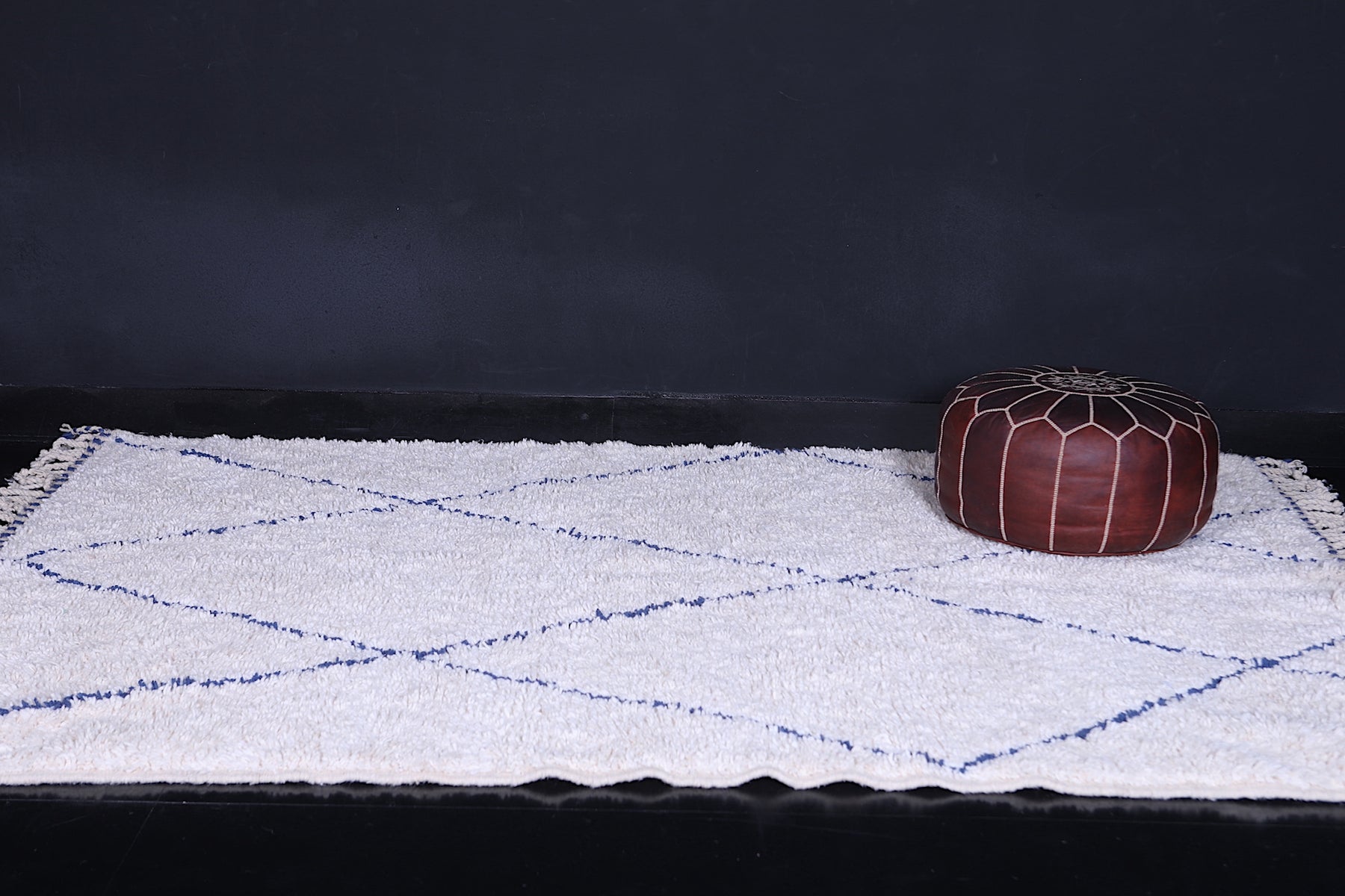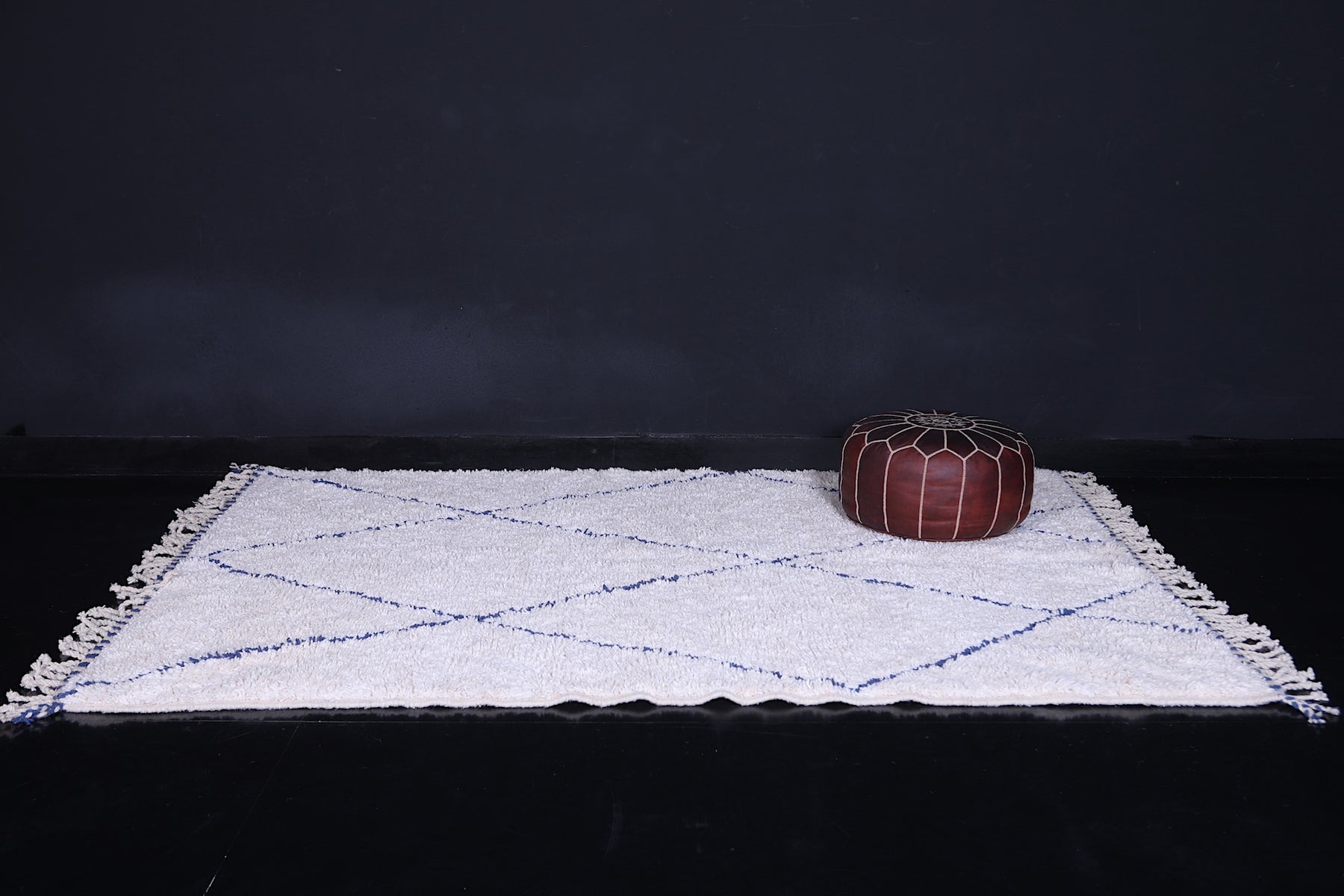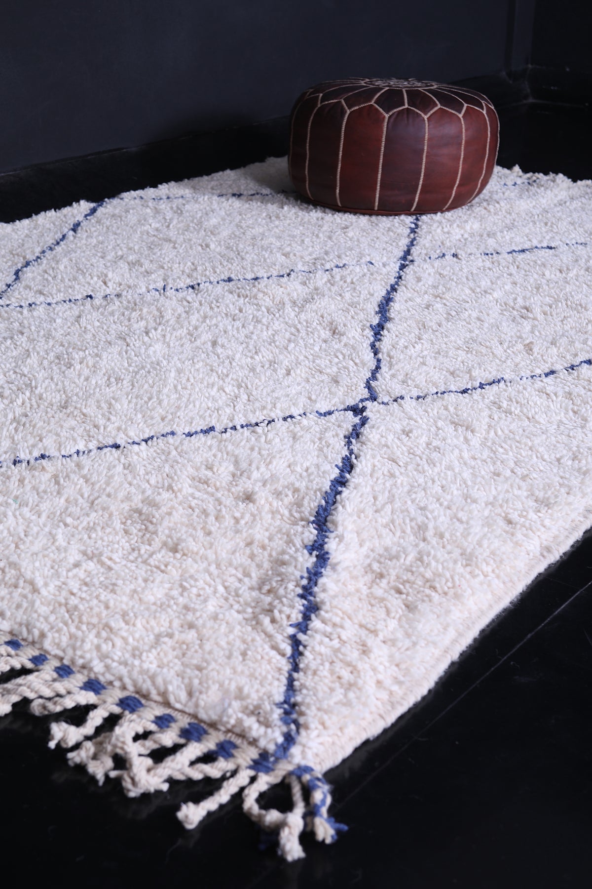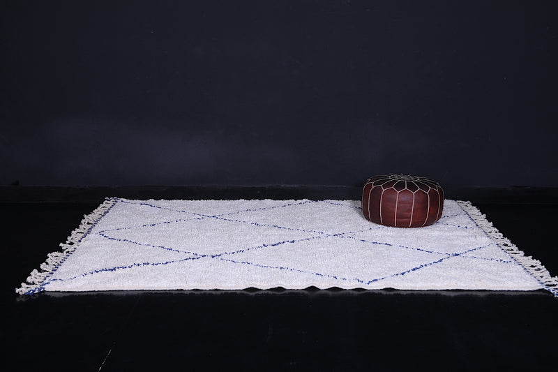 Bring a vibrant, modern twist to traditional Berber craftsmanship with this Authentic Beni Ourain Moroccan Rug. Hand-knotted from premium natural wool, this piece features a classic large-scale diamond lattice pattern. While the field remains a crisp, luminous off-white/cream, the geometric lines are rendered in a striking Cobalt or Electric Blue, offering a fresh alternative to traditional black-and-white designs.