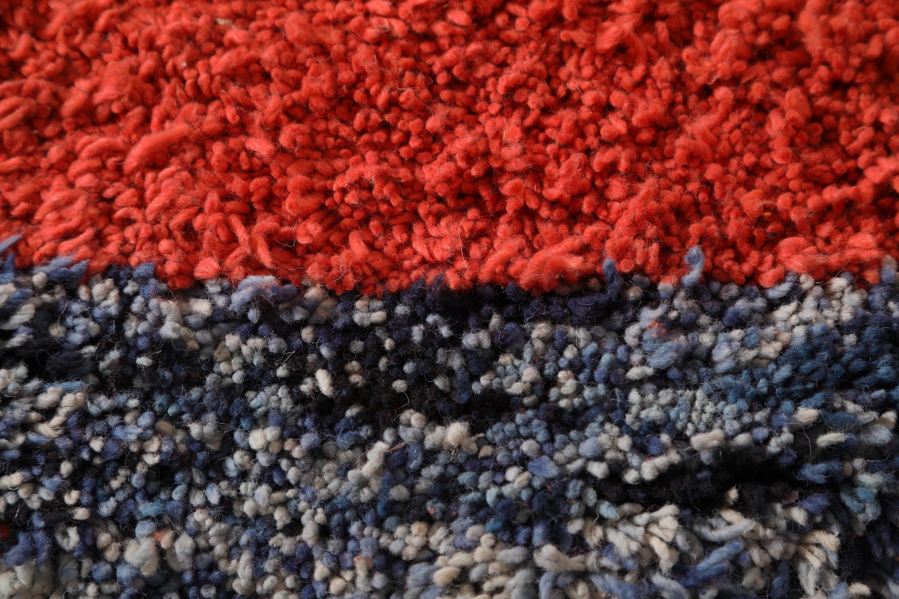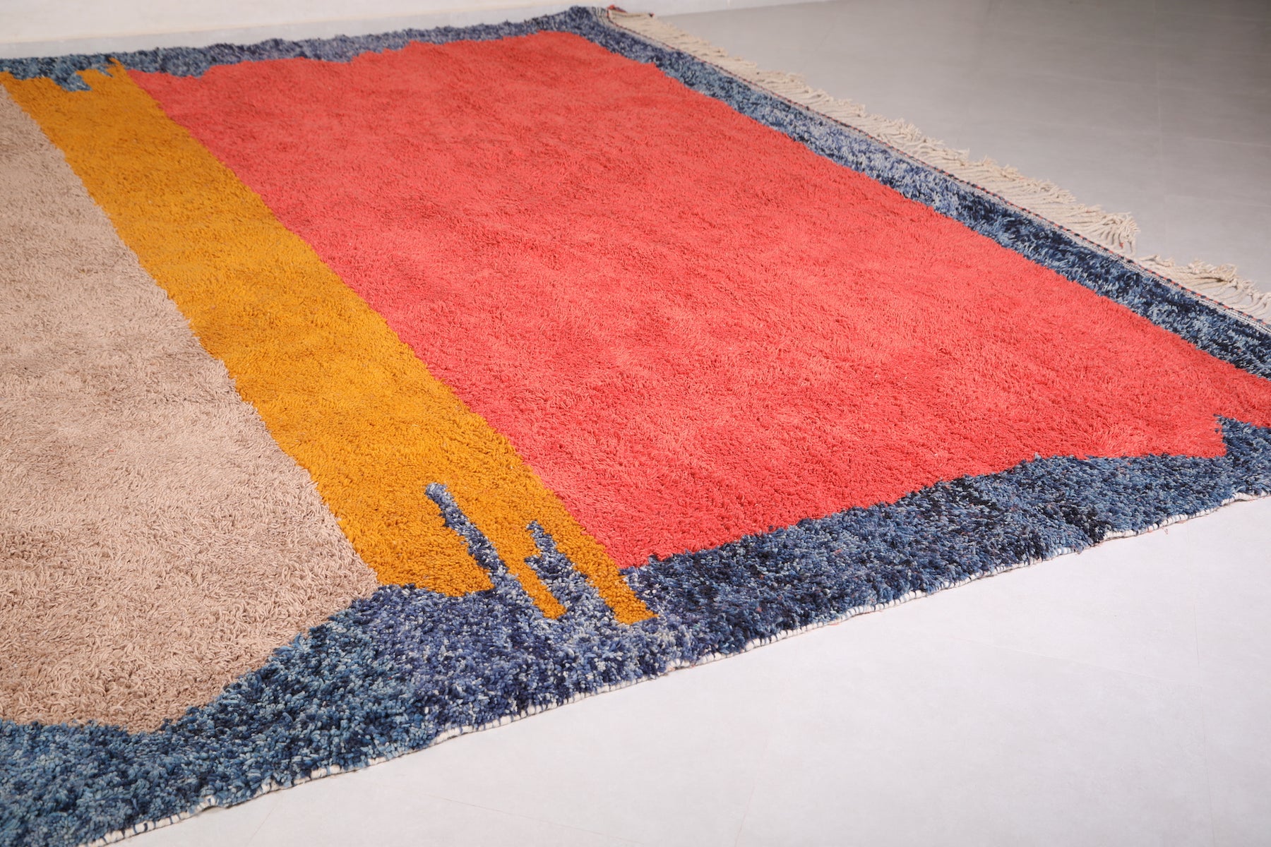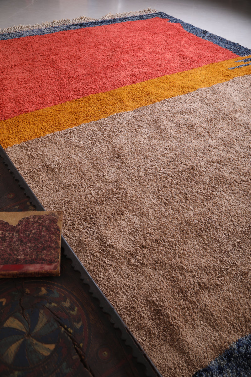 Add a bold artistic statement to your space with this stunning handmade Moroccan rug, featuring a vibrant abstract design. The rich red, deep blue, warm mustard, and neutral beige tones blend seamlessly, creating a unique and contemporary look that enhances any modern interior.